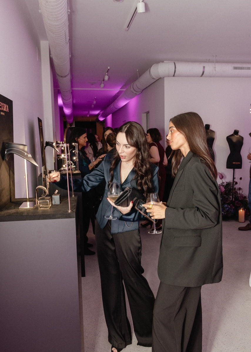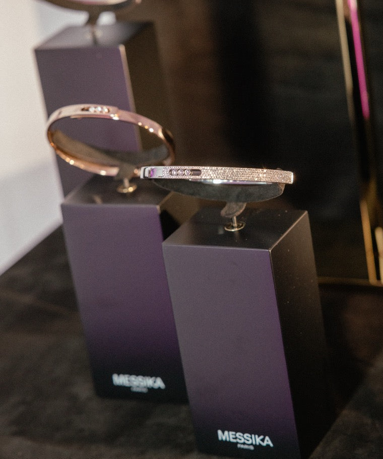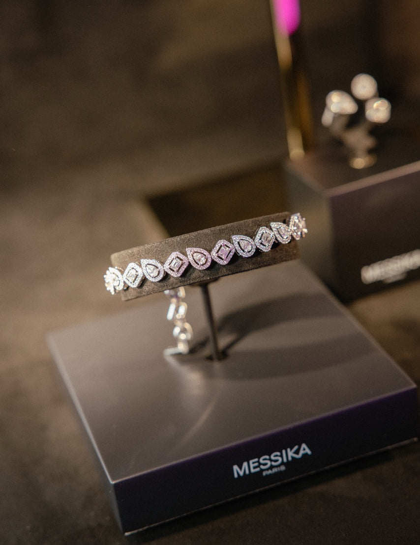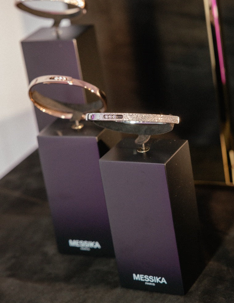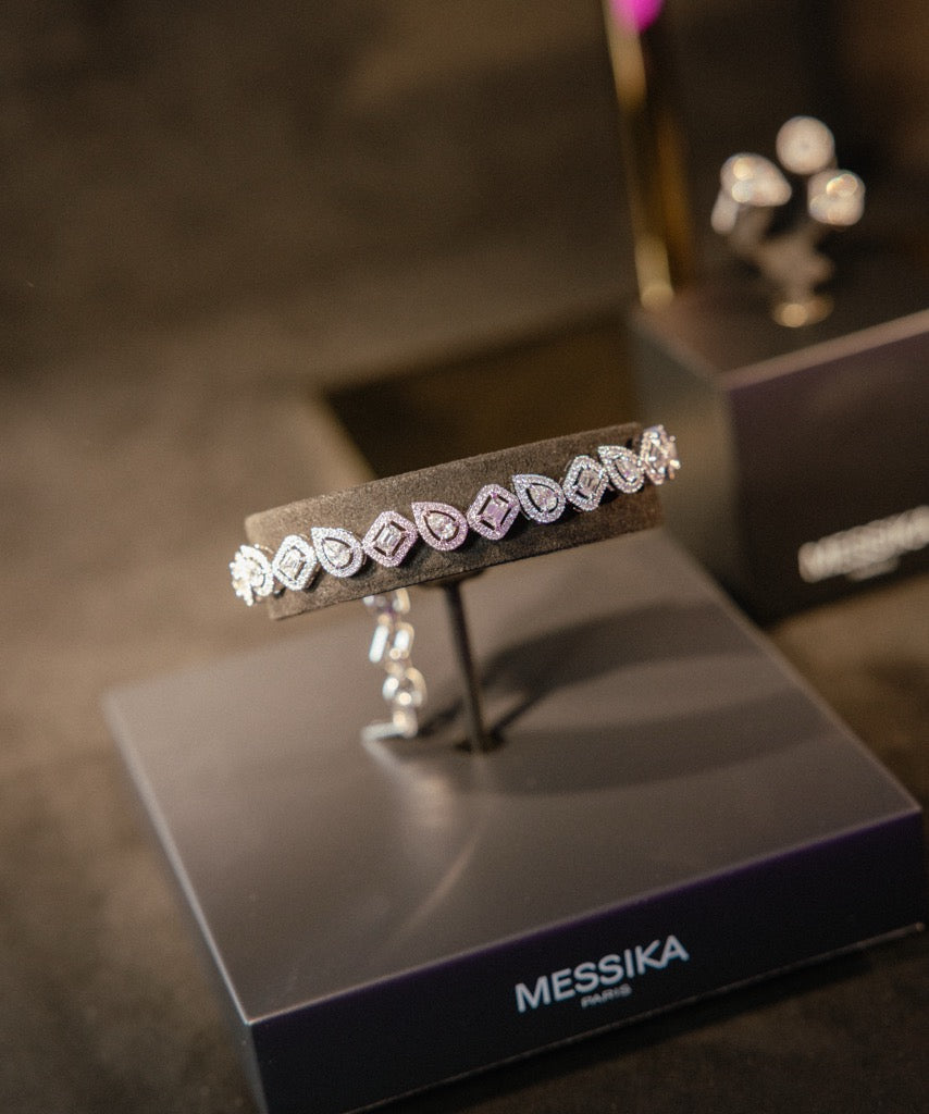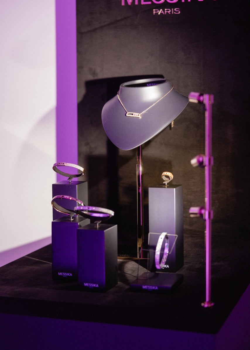 El espacio se transformó para acoger el universo contemporáneo de Messika, envolviendo a los asistentes en una atmósfera luminosa y vibrante. Cada detalle del montaje —la iluminación en tonos morados, los reflejos metálicos, la música del DJ— evocaba la estética de la Maison: moderna, parisina, audaz. VAVAVA House, con su carácter minimalista, se convirtió en el escenario perfecto para descubrir y vivir de cerca las colecciones más icónicas de la firma.