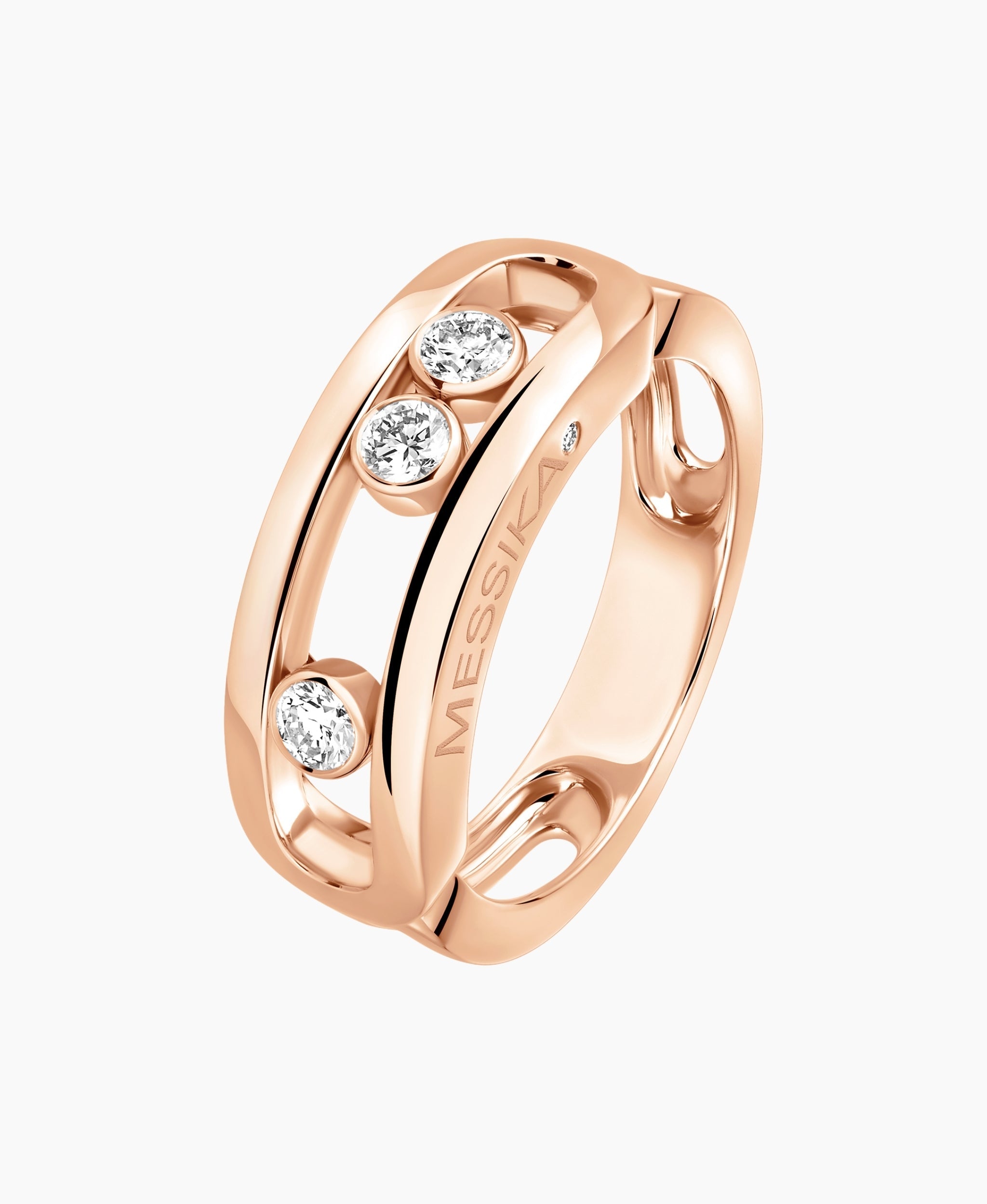 Afirma tu estilo con esta pieza de alta joyería. El Anillo Move Classique, una pieza artesanal en oro rosa de 18K, encapsula el movimiento eterno de tres diamantes deslumbrantes, emblema de la Maison. Su color luminoso y delicado realza el brillo sobre la piel con un lujo atemporal.