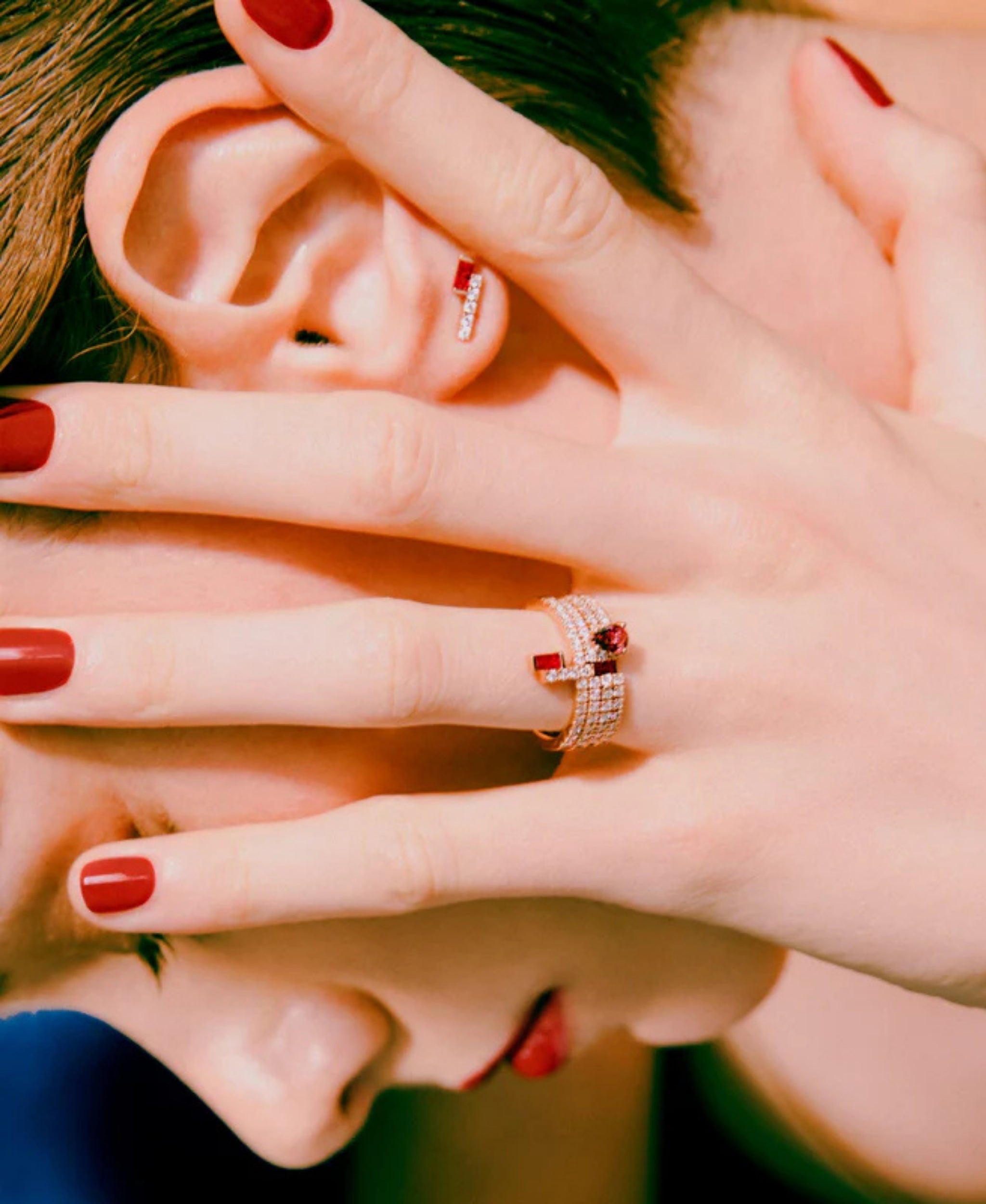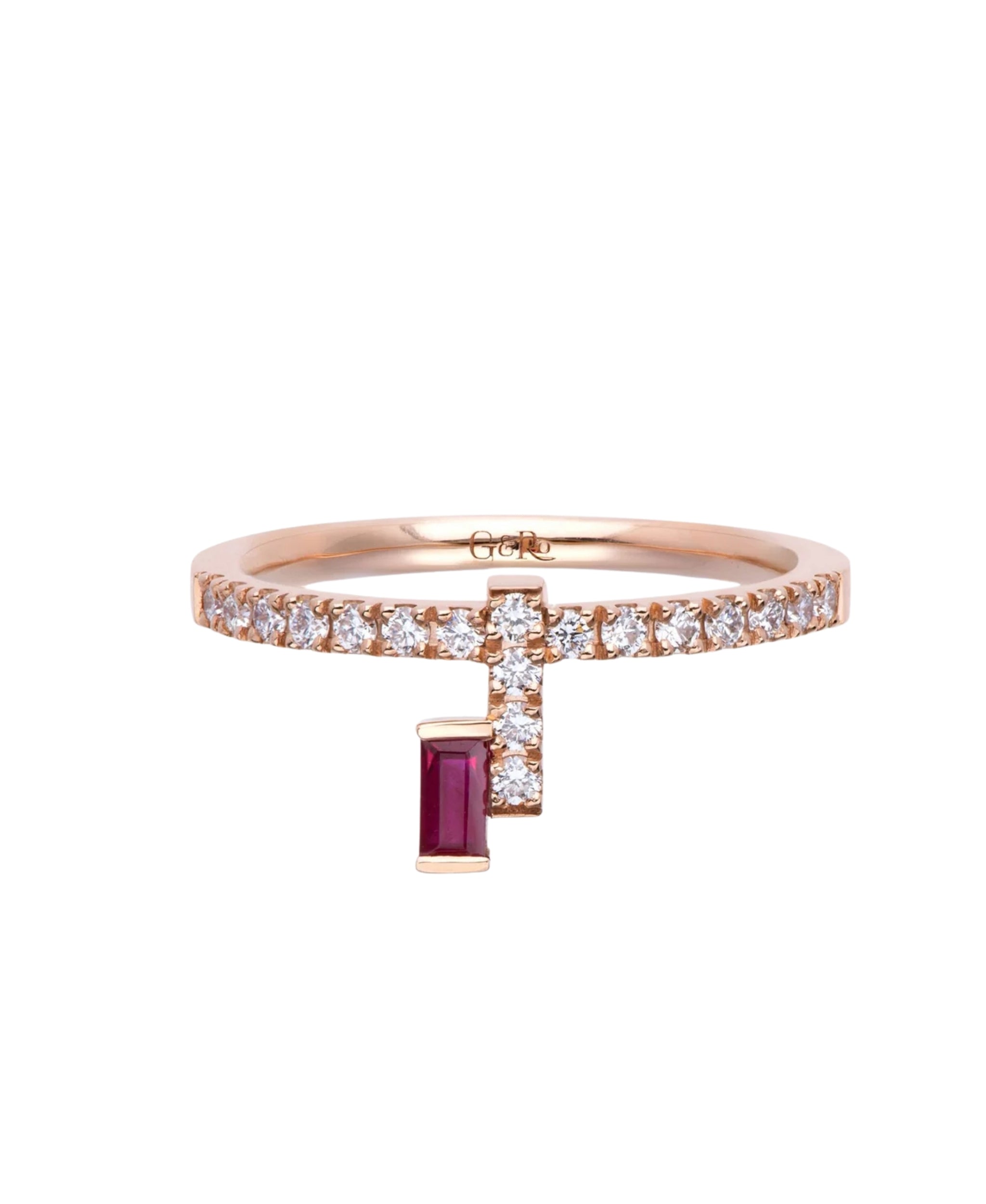 Alta joyería que es un manifiesto de estilo personal. Este anillo apilable de oro rosa de 18kts, con la intensidad del rubí (0,16 cts) y el brillo de los diamantes (0,27 cts), define tu mano con una declaración de amor, belleza y libertad.