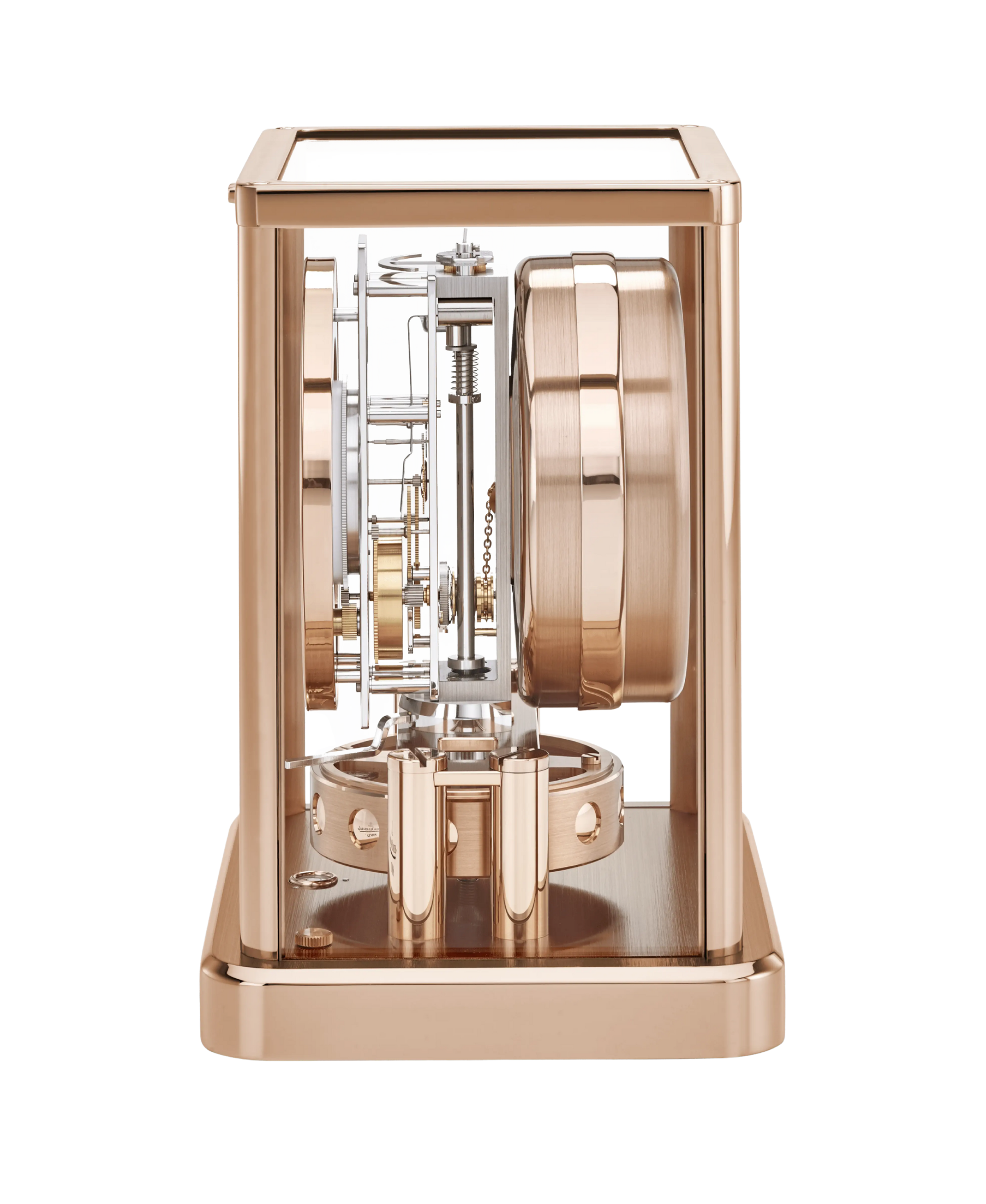 Atmos Classic Moon es una obra maestra de la ingeniería perpetua que combina la fascinación por el cosmos con la elegancia técnica de Jaeger-LeCoultre. Este reloj de sobremesa se distingue por su gabinete de latón dorado con oro rosa, que le confiere una calidez y un brillo atemporales, convirtiéndolo en una pieza central de cualquier estancia. Su esfera lacada en blanco presenta una disposición de gran claridad, con cifras romanas y manecillas tipo pera azuladas. A las 6 horas, incorpora una complicación de fases lunares de alta precisión, donde la luna avanza lentamente sobre un fondo estrellado, acompañada por un indicador de los meses del año. Impulsado por el calibre Jaeger-LeCoultre 562, este reloj funciona exclusivamente mediante los cambios de temperatura ambiental, extrayendo energía del aire para marcar el tiempo de forma casi eterna sin intervención humana.
