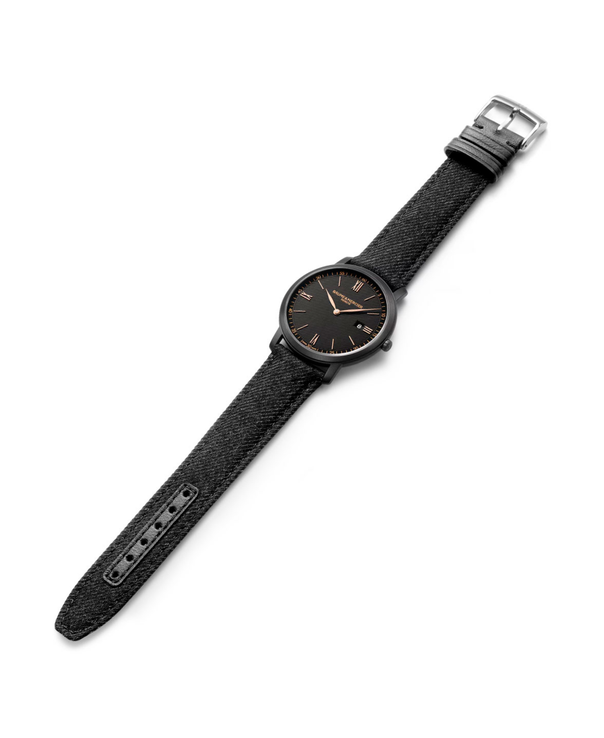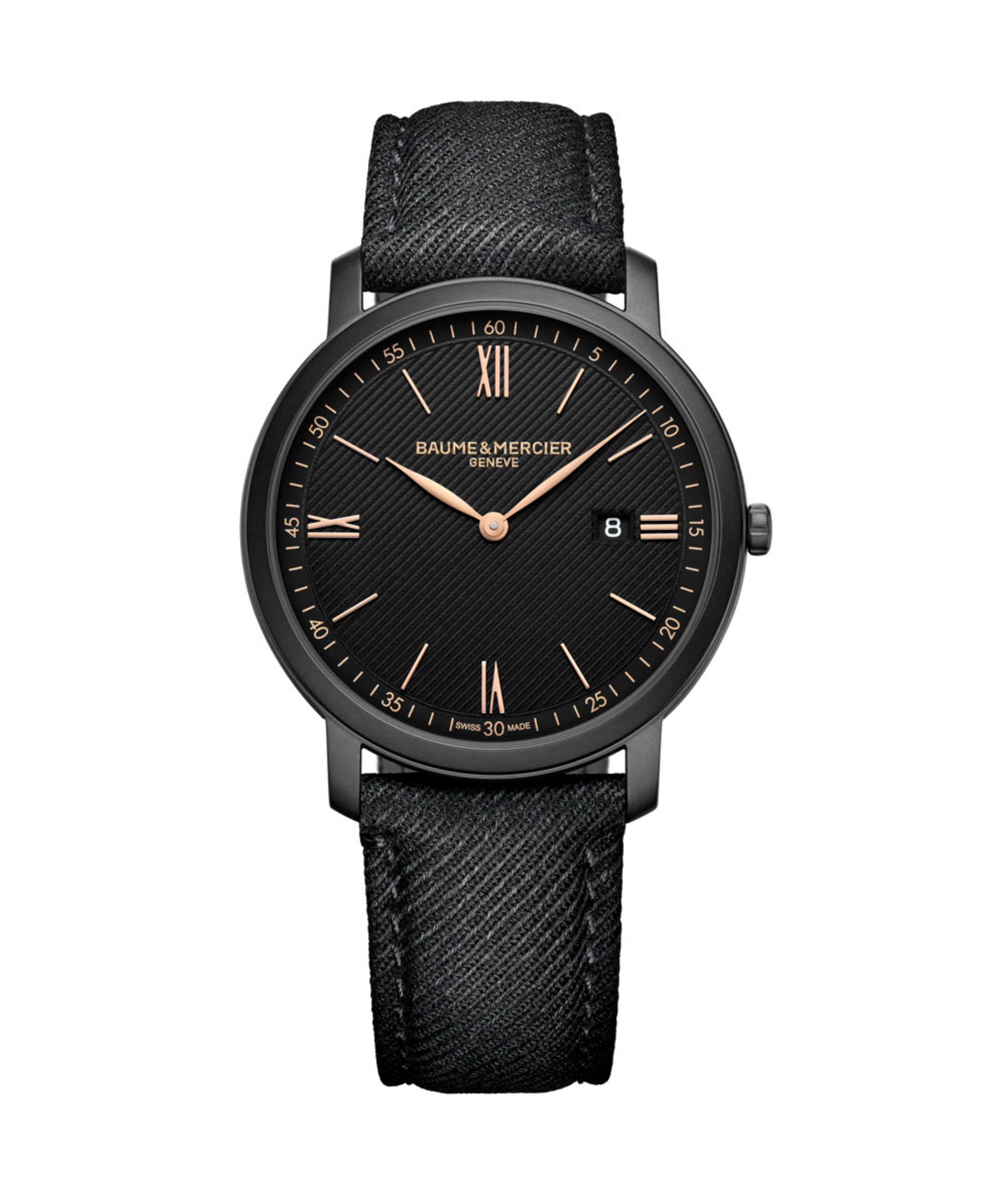 Baume & Mercier Classima elegante y sobrio. Su caja de diámetro es de acero con un tratamiento ADLC arenado, y alberga un movimiento de cuarzo Swiss Made. La esfera negra opalina y presenta la función de fecha. Se complementa con una correa de tela negra intercambiable de Holland & Sherry, que utiliza un práctico sistema de asas.