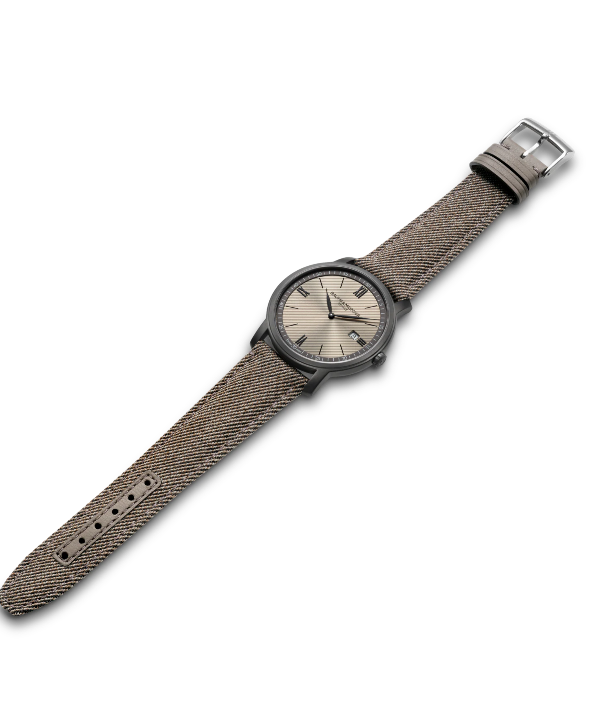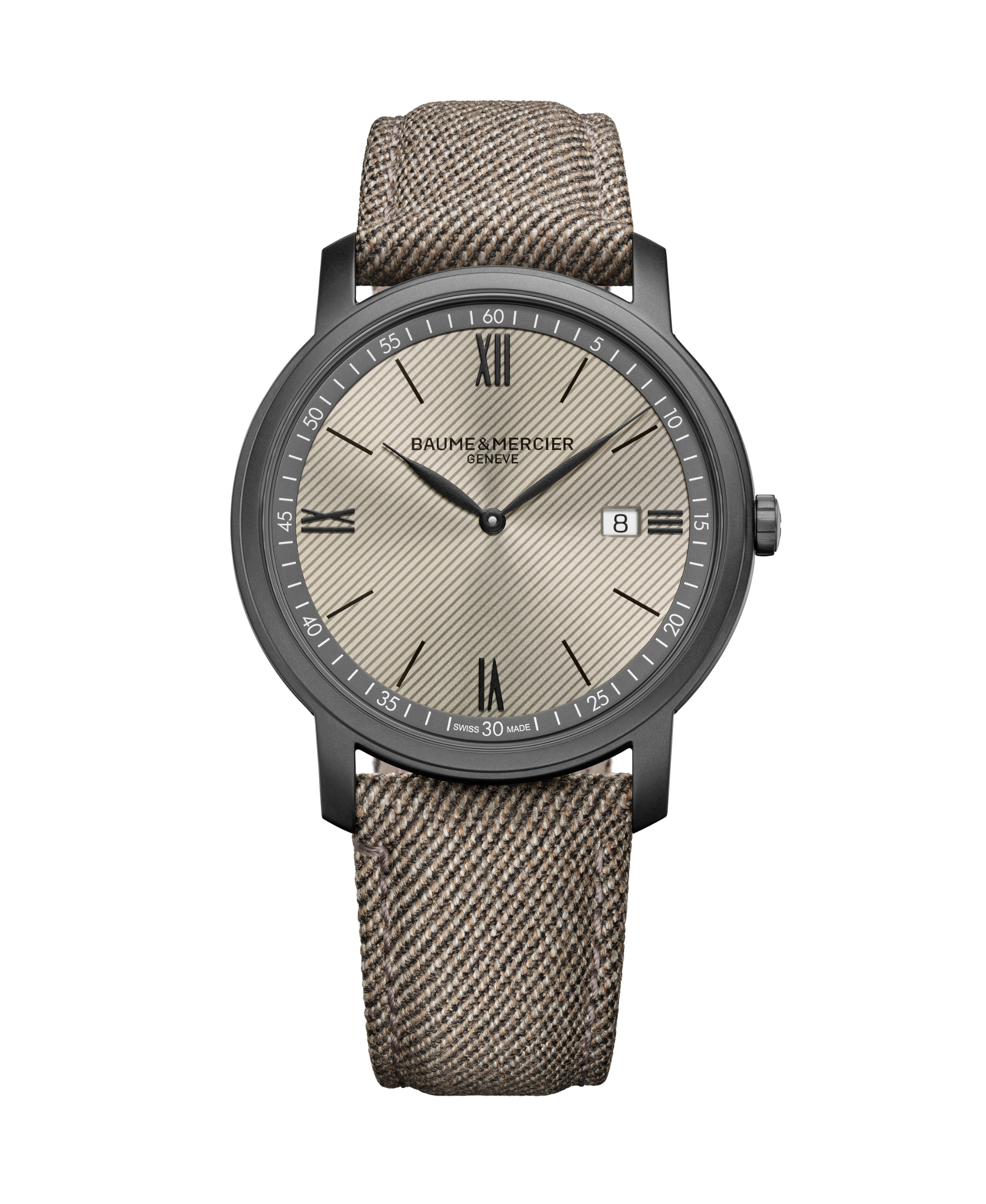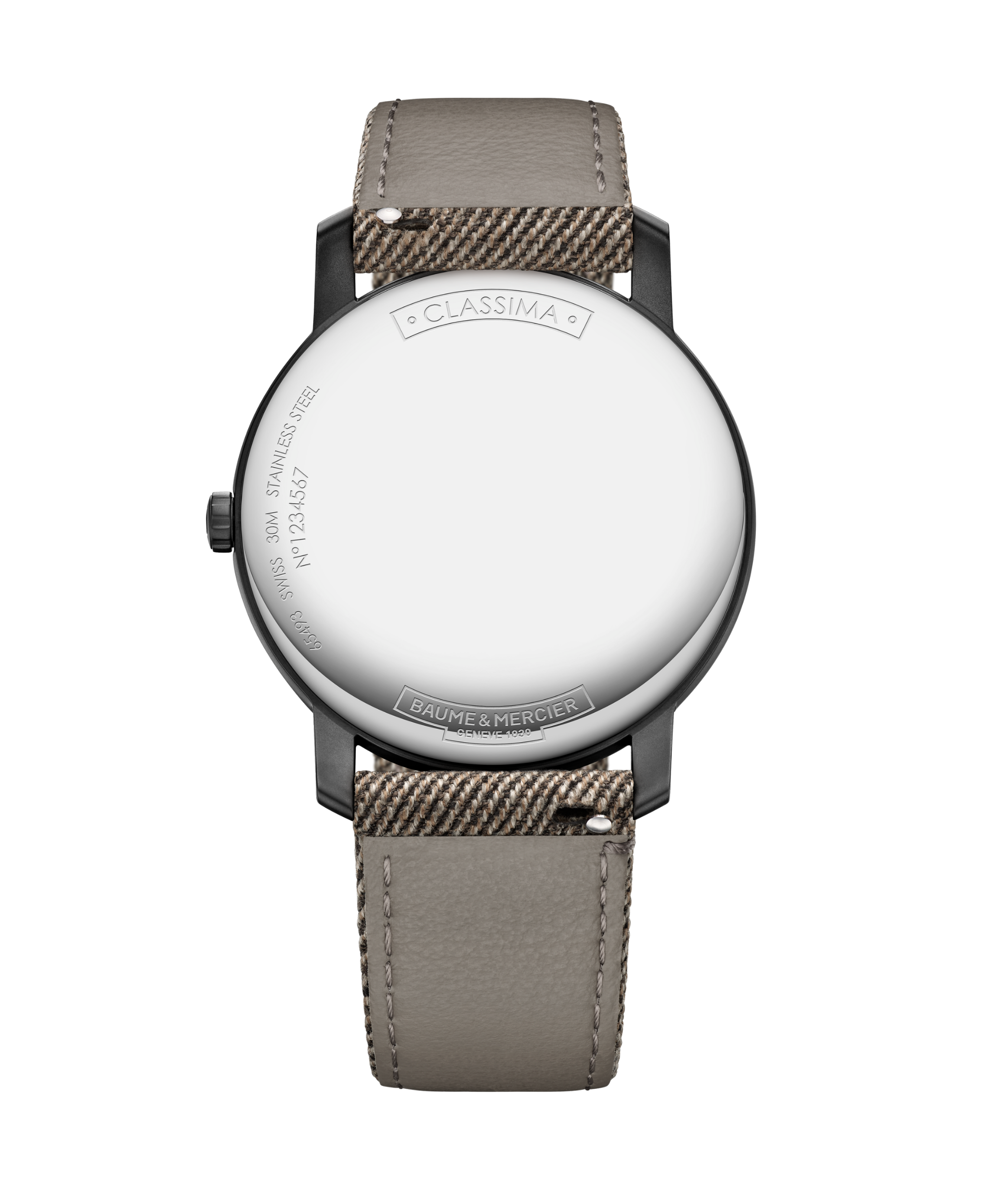 Baume & Mercier Classima presenta con una silueta excepcionalmente delgada de tan solo 6.0 mm de grosor, alojada en una caja redonda construida en acero ADLC arenado. Este reloj incorpora un fiable movimiento de cuarzo Swiss Made para indicar las Horas, Minutos y la Fecha. El diseño se distingue por su esfera arena opalina con acabado "soleil" (rayos de sol) y acentuada por números romanos y agujas negras. Su versatilidad queda marcada por una correa de tela color arena de Holland & Sherry, que es fácilmente intercambiable.