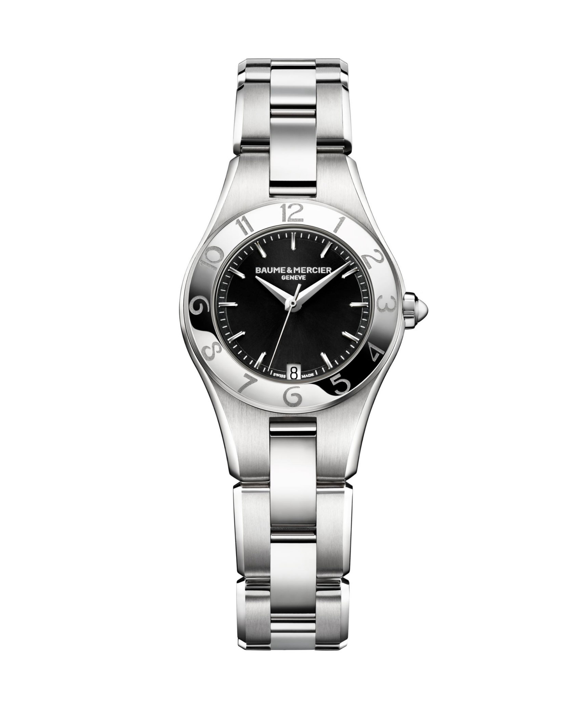Baume & Mercier Linea fabricado en acero inoxidable con un diámetro de 27 mm y un grosor de 7,95 mm. Presenta una esfera negra y un brazalete de acero. Es un modelo elegante y atemporal.
