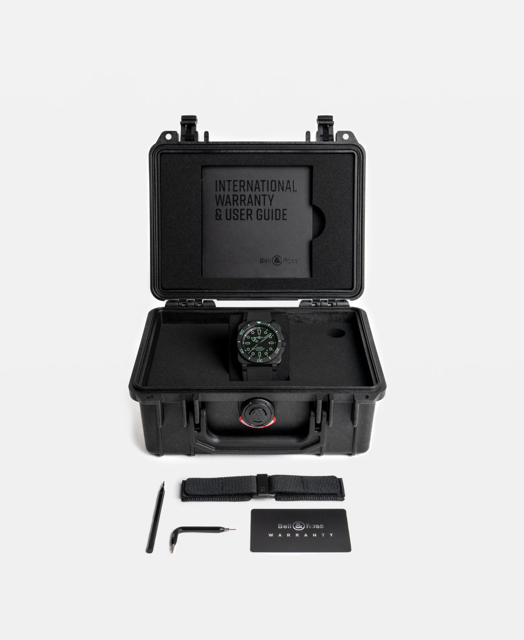 Bell & Ross BR 05 Black Ceramic es un reloj de estilo deportivo-elegante que destaca por su construcción completamente en cerámica negra pulida y satinada de 41 mm, un material ligero e hipoalergénico conocido por su extrema resistencia a los arañazos. Equipado con el movimiento automático Calibre BR-CAL.321-1, ofrece una reserva de marcha de 54 horas. Su esfera negra con efecto sol cuenta con agujas e índices tratados con Super-LumiNova® para una legibilidad óptima, mientras que su fondo de caja de zafiro permite admirar la masa oscilante.