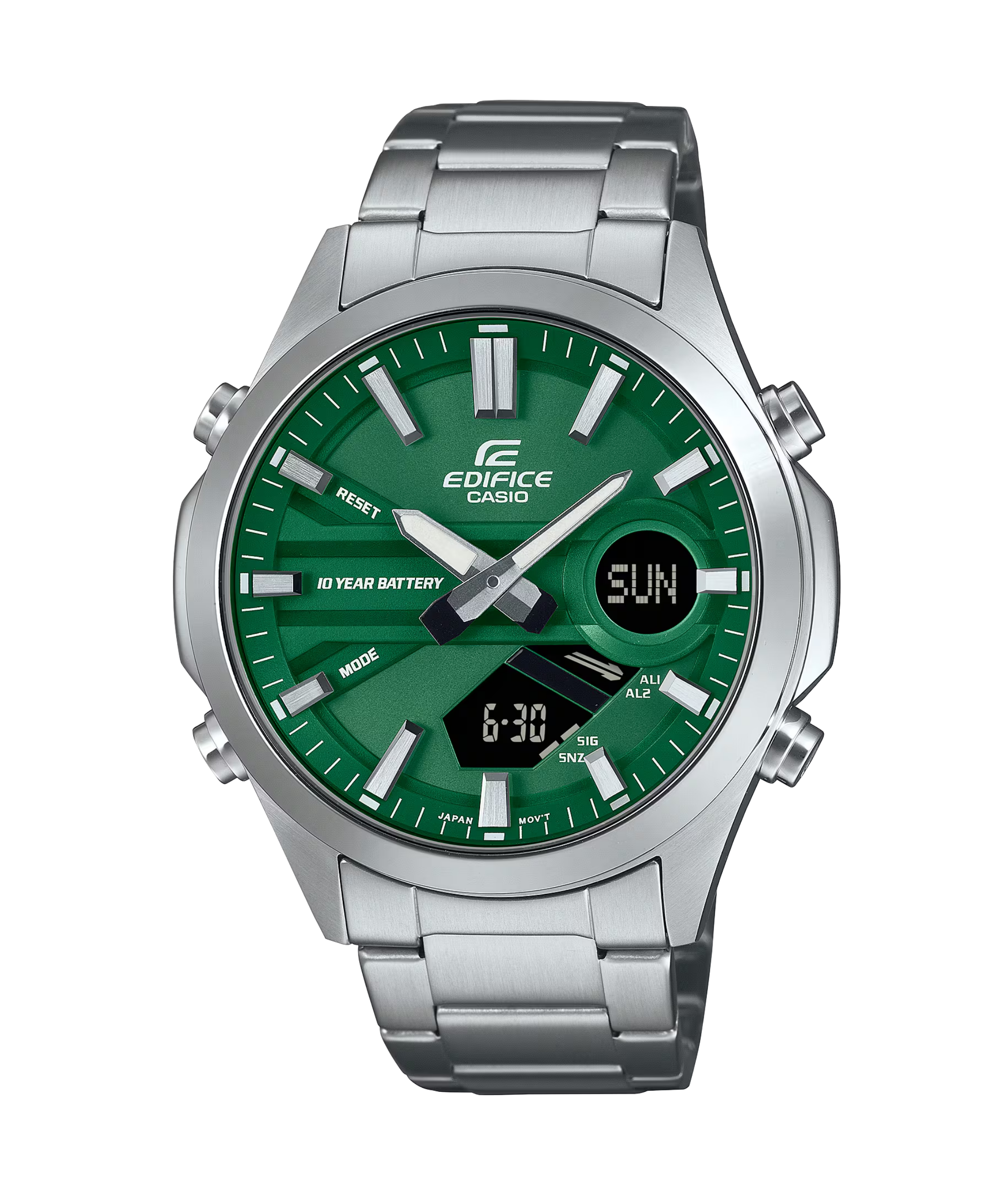 Edifice Estándar es un reloj "Ana-Digi" que destaca por su increíble autonomía y su llamativa esfera verde bosque. Es un modelo robusto y funcional que combina la lectura clásica de agujas con las ventajas de una pantalla digital.