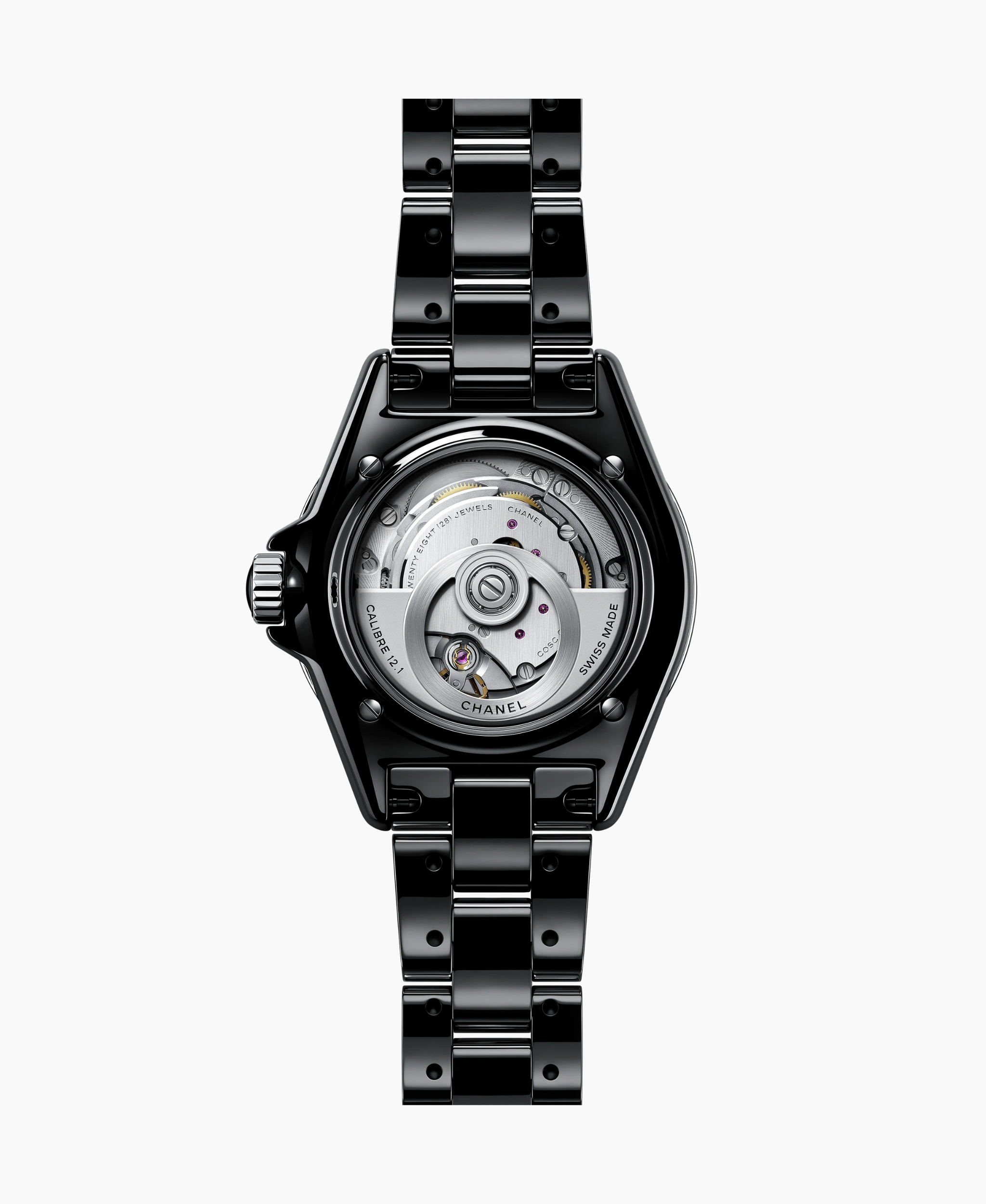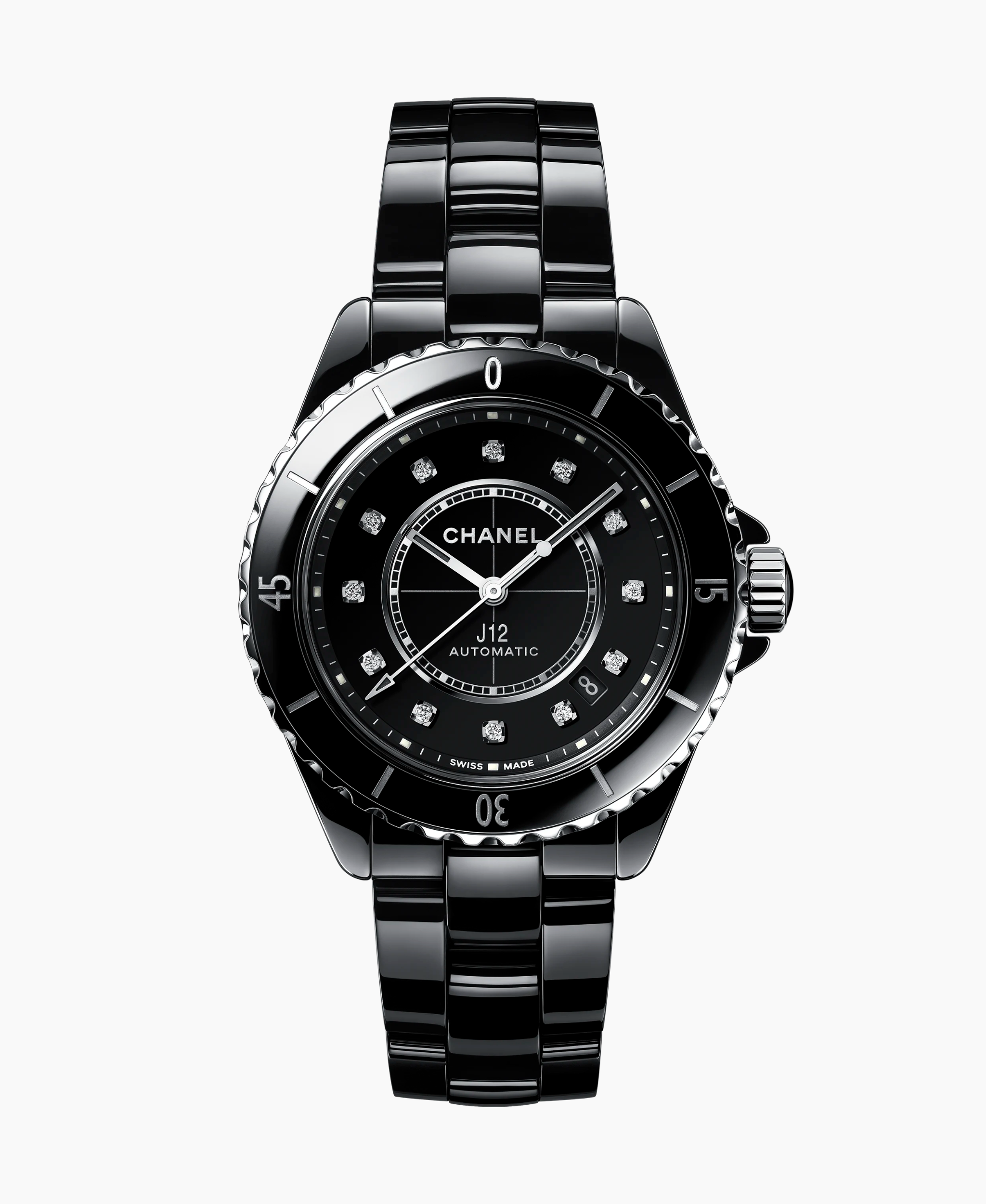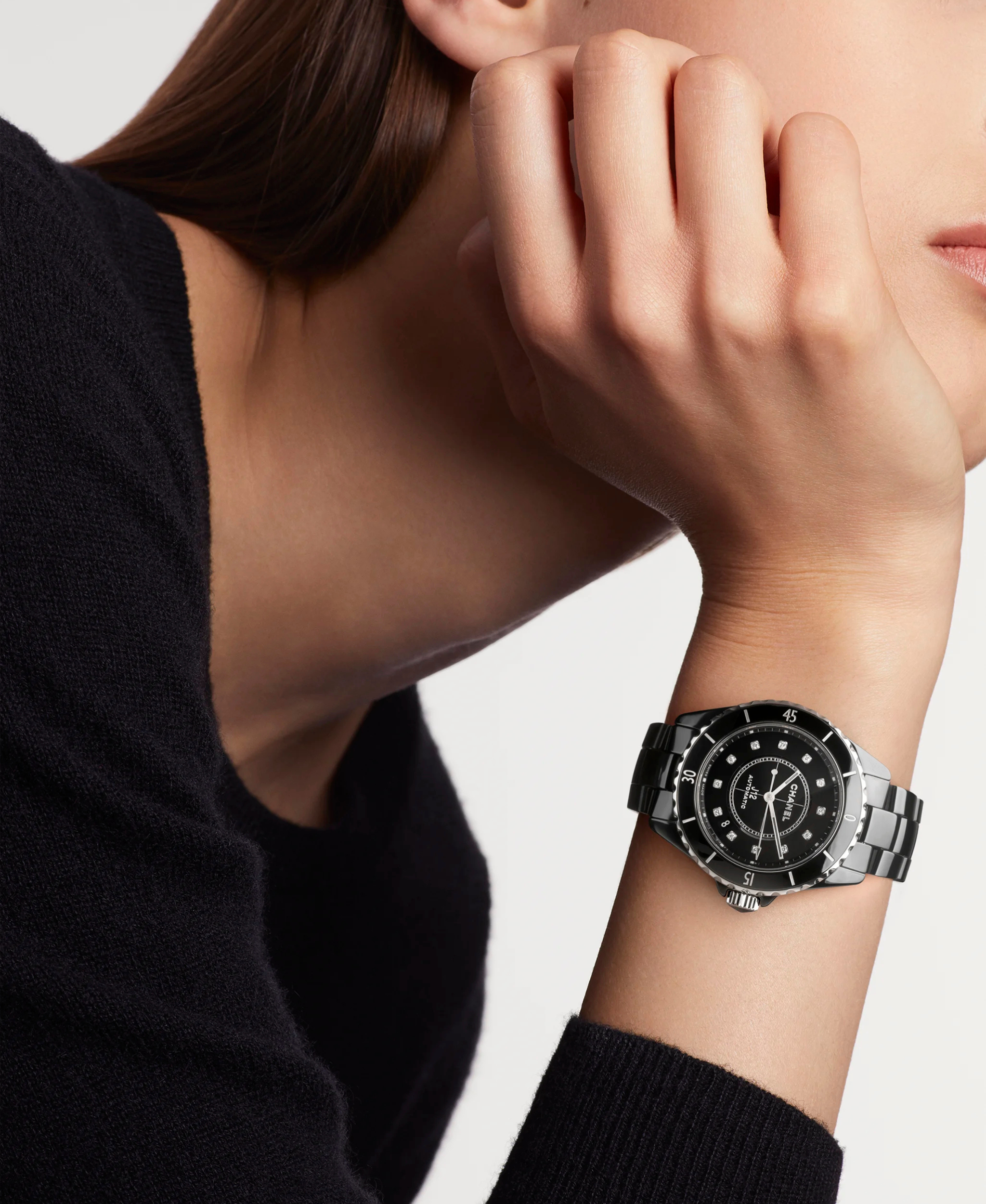 Chanel J12 Black combina alta relojería y lujo en 38 mm. Su icónica caja de Cerámica Negra aloja el Calibre 12.1 automático (certificado COSC). El dial está engastado con Diamantes brillantes. Esta pieza fusiona el rendimiento técnico con la opulencia, manteniendo el diseño deportivo y elegante del J12.