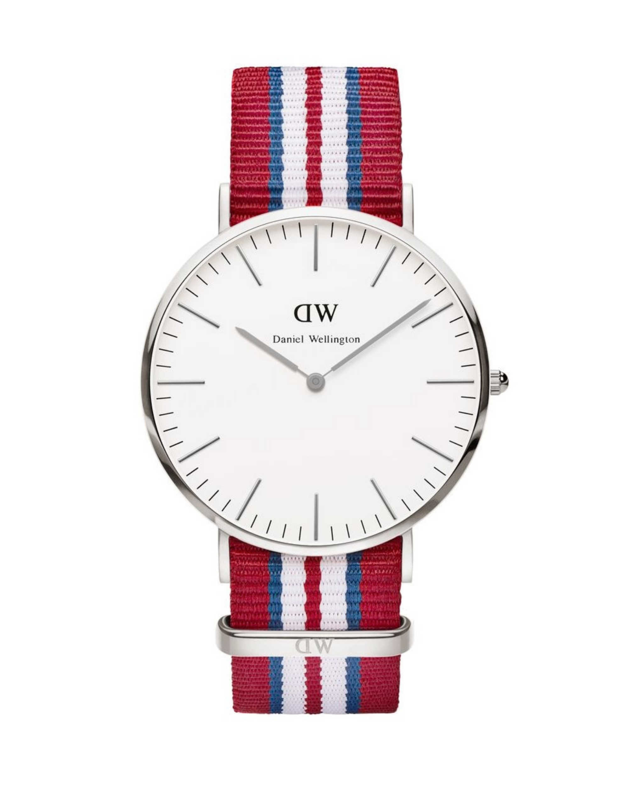 Destaca por su diseño deportivo y náutico. Cuenta con una caja ultraplana de acero inoxidable plateado (6 mm) y una esfera blanca con índices plateados. Su elemento distintivo es la correa NATO tricolor en azul, blanco y rojo, que le aporta un aire dinámico y juvenil. Es una pieza ligera, con movimiento de cuarzo japonés, ideal para un estilo casual y veraniego.