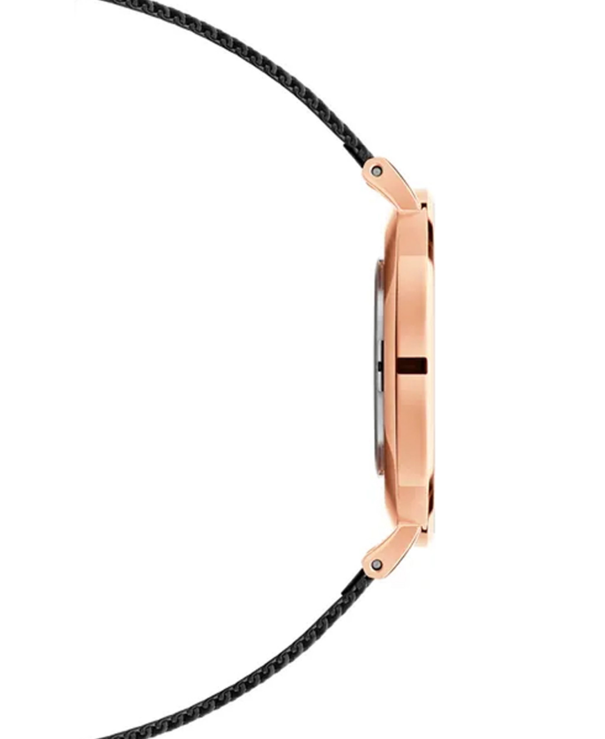 Un reloj minimalista de 36 mm que destaca por su diseño ultraplano y elegante. Cuenta con una sofisticada esfera negra y una correa de malla milanesa en color negro mate. Los detalles en oro rosa aportan un contraste refinado, ideal para un estilo moderno y discreto tanto diario como formal.