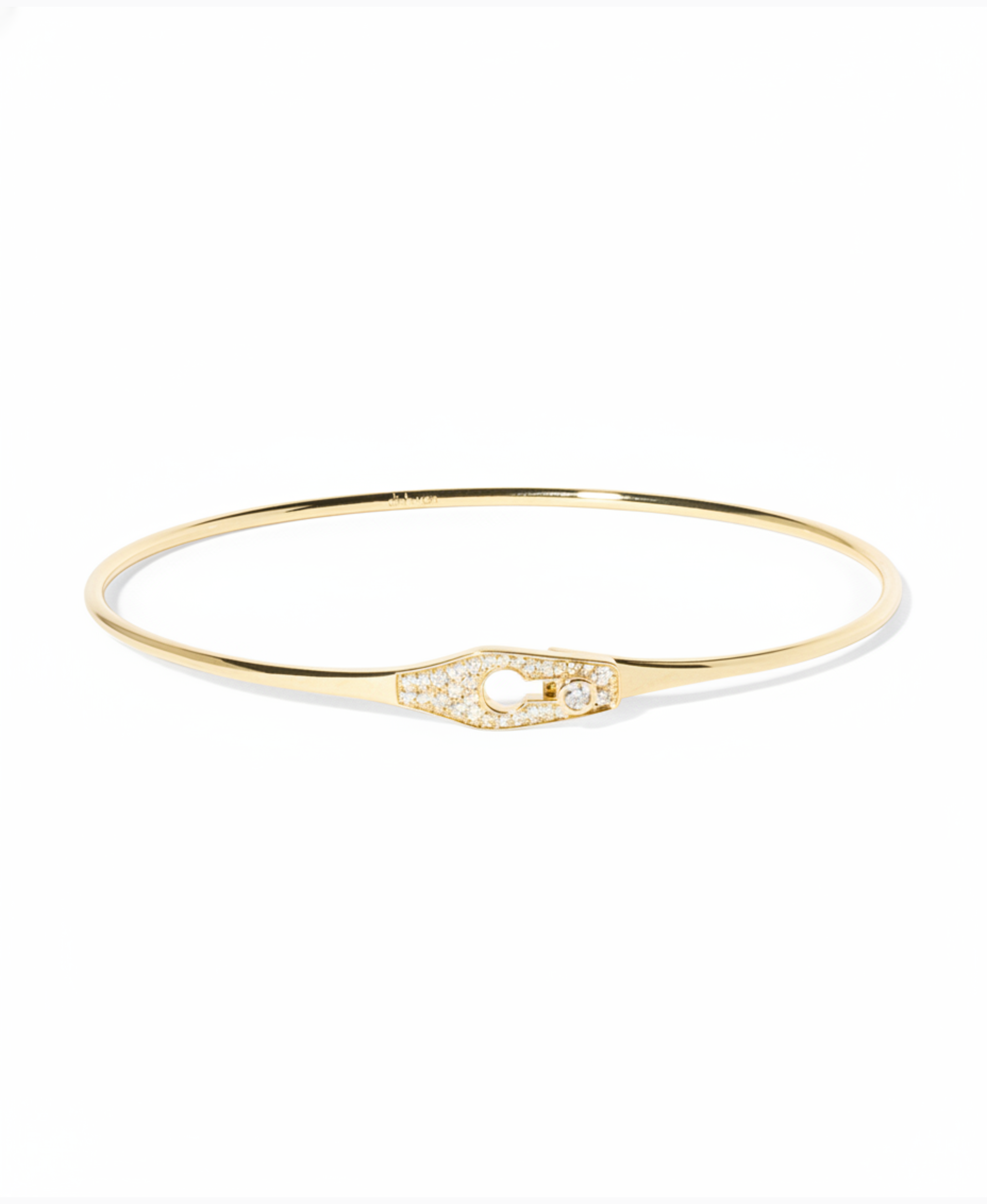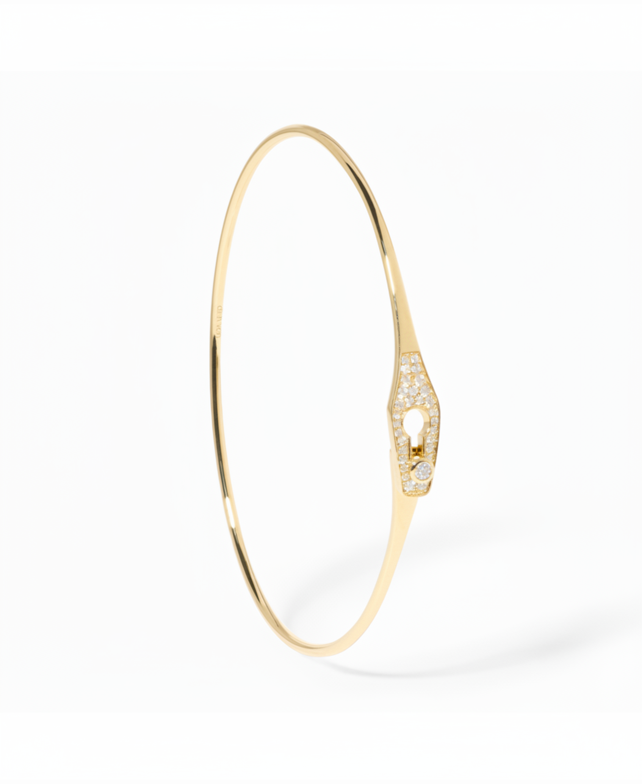 Eleva tu estilo personal con esta Pulsera Serrure. Una pieza de alta joyería en oro amarillo, minuciosamente trabajada y pavimentada con diamantes, que simboliza la apertura a nuevos horizontes. Su diseño moderno y sofisticado es un amuleto de lujo íntimo, ideal para marcar cada etapa de tu vida. Combínala con otras piezas de la colección SERRURE.