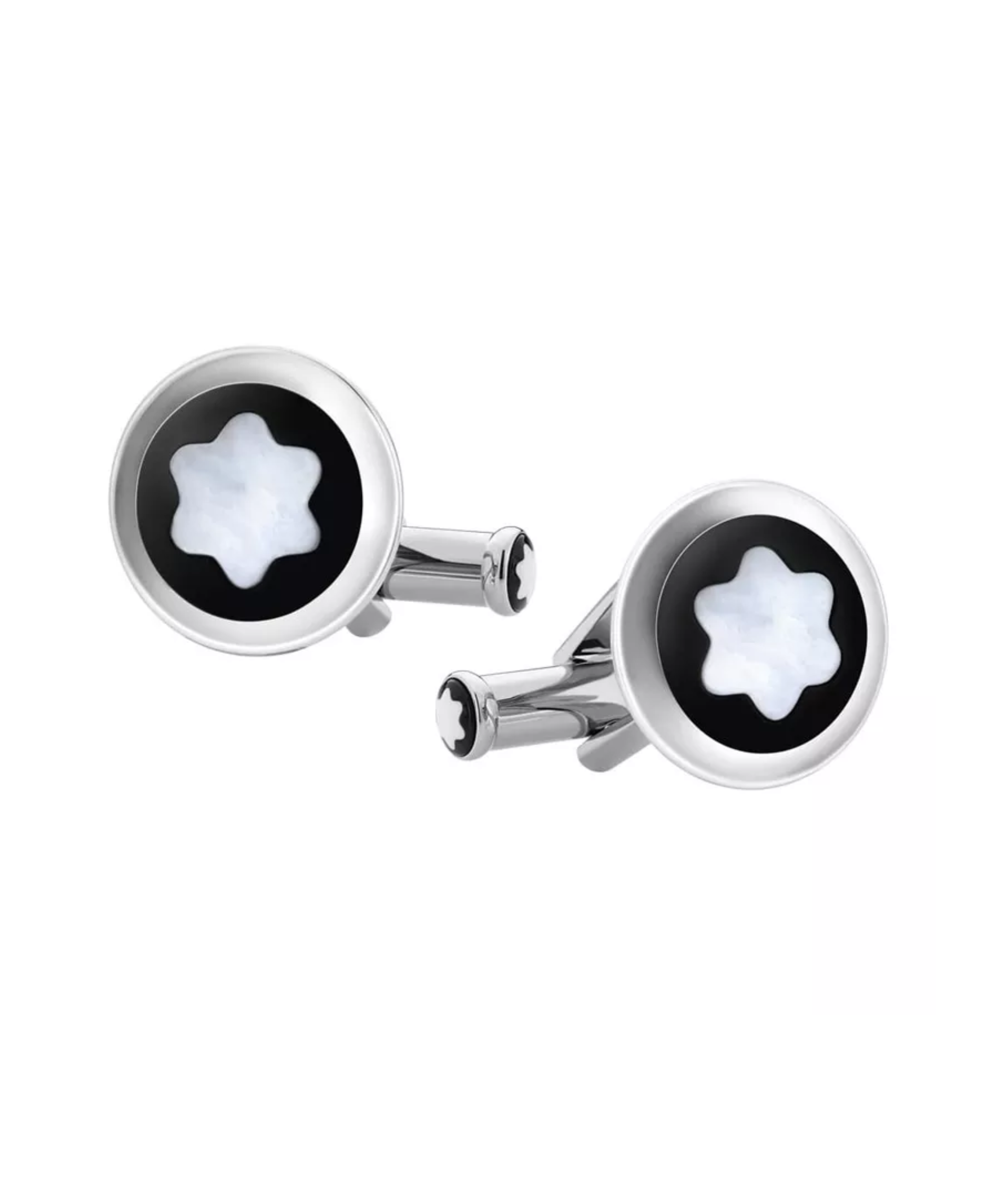 Estos gemelos de la colección Star Black destacan por su icónica forma redonda en acero inoxidable, con un centro revestido en PVD negro que realza el emblema de Montblanc tallado en nácar natural. Una pieza de artesanía excepcional que combina la durabilidad del acero con la elegancia orgánica de la madreperla, ideal para elevar cualquier atuendo de gala con un toque de distinción atemporal.