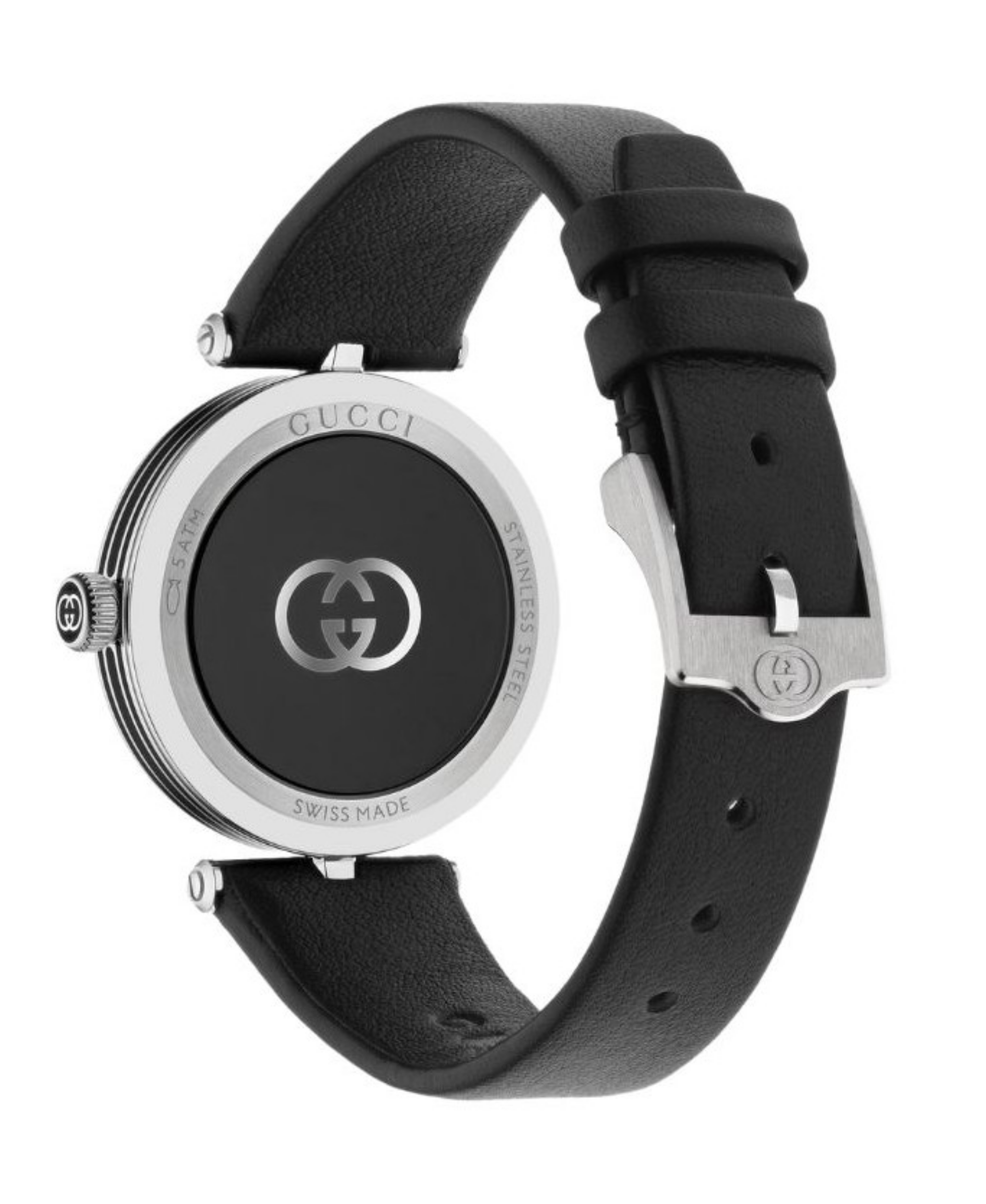Para la colección Crucero 2025, el estilo refinado y minimalista se extiende a la joyería y los relojes. Inspirándose en códigos de archivo, el diseño del Modelo 2000 combina el estilo italiano con la artesanía suiza. Presentado con una correa de piel negra, este reloj presenta una esfera guilloché negra, enriquecida con códigos históricos de la Casa.
