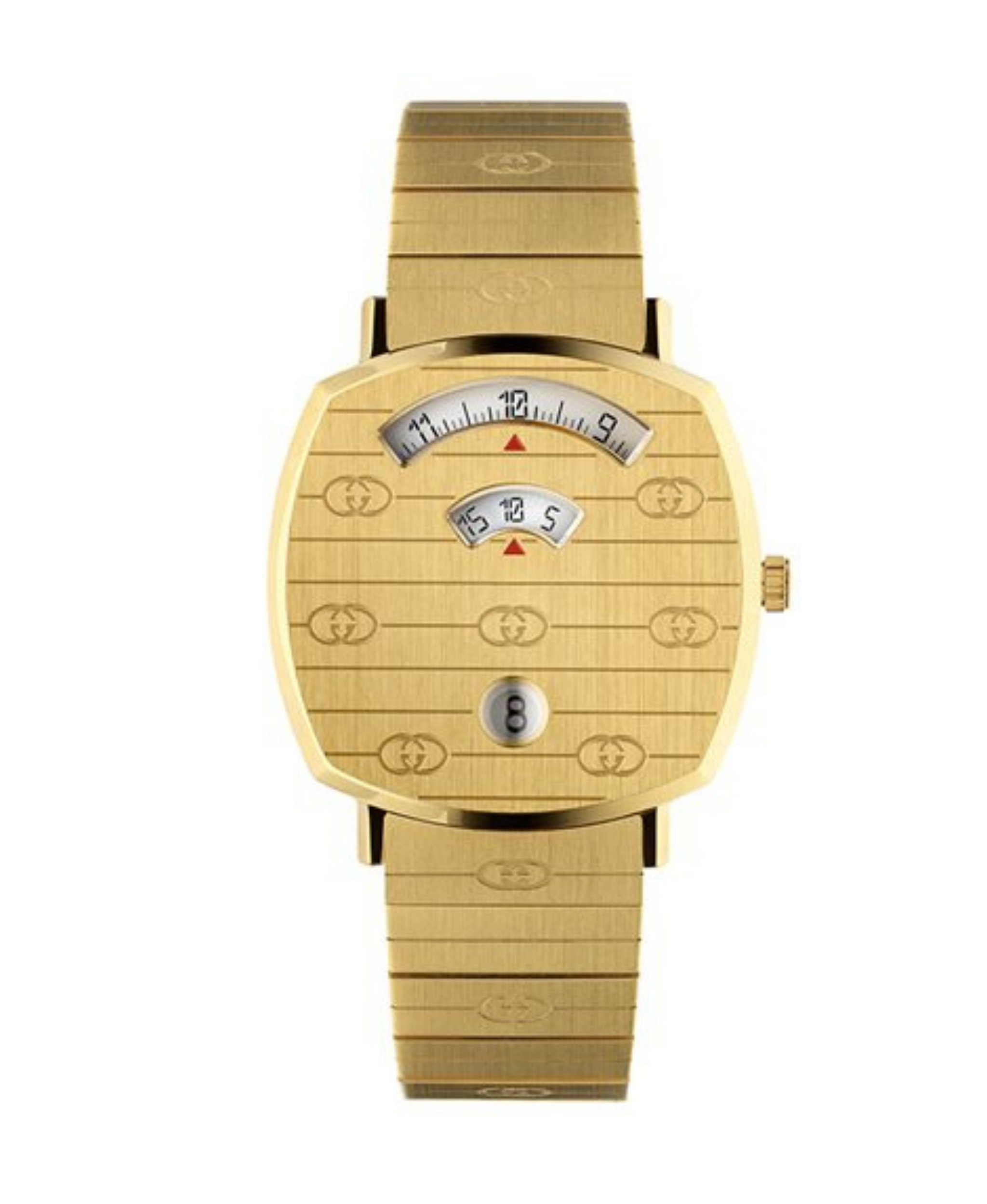 Una pieza de diseño audaz inspirada en el mundo del skateboarding de los años 70. Este modelo destaca por su distintiva caja cuadrada de 38 mm fabricada en acero inoxidable con grabado de logotipos GG, que ofrece una estética industrial y lujosa a la vez. Su esfera de acero con acabado cepillado elimina las agujas tradicionales para mostrar la hora a través de tres aberturas circulares (ventanas), proporcionando una lectura minimalista y única. Equipado con un brazalete de acero a juego, este reloj es la máxima expresión de la moda urbana sofisticada y el estilo genderless de la casa italiana.