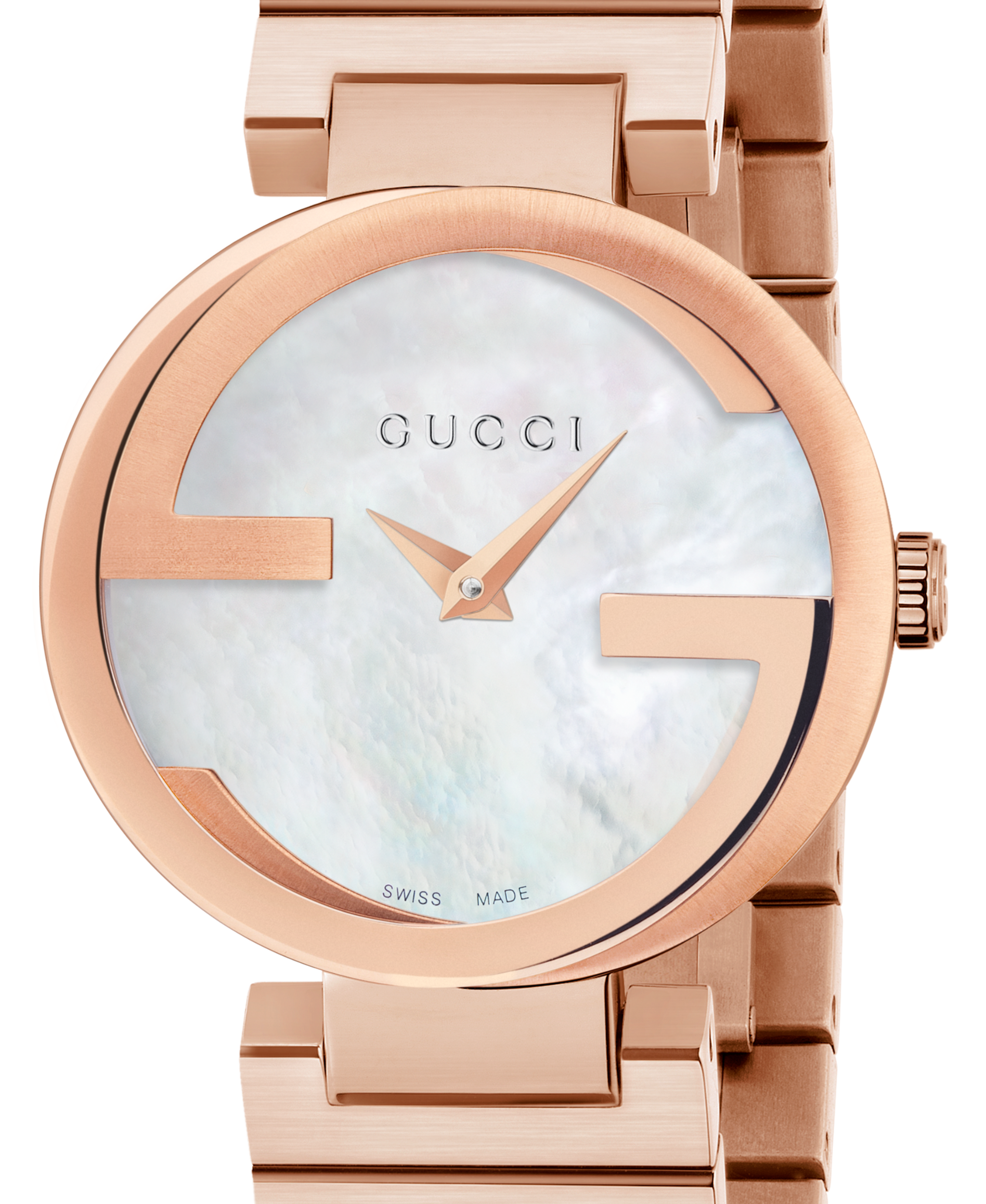 Gucci Interlocking fusiona un estilo clásico con una contemporaneidad distintiva, centrada en su icónico bisel con el logo de la doble G esfera nácar. Funciona con movimiento de cuarzo suizo, tiene cristal de zafiro y una caja de 29 mm con un elegante acabado en dorado rose.