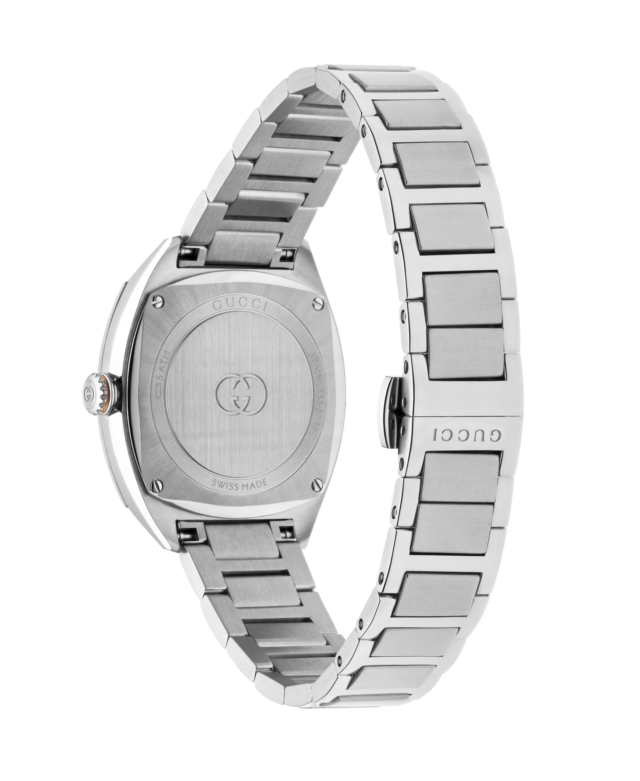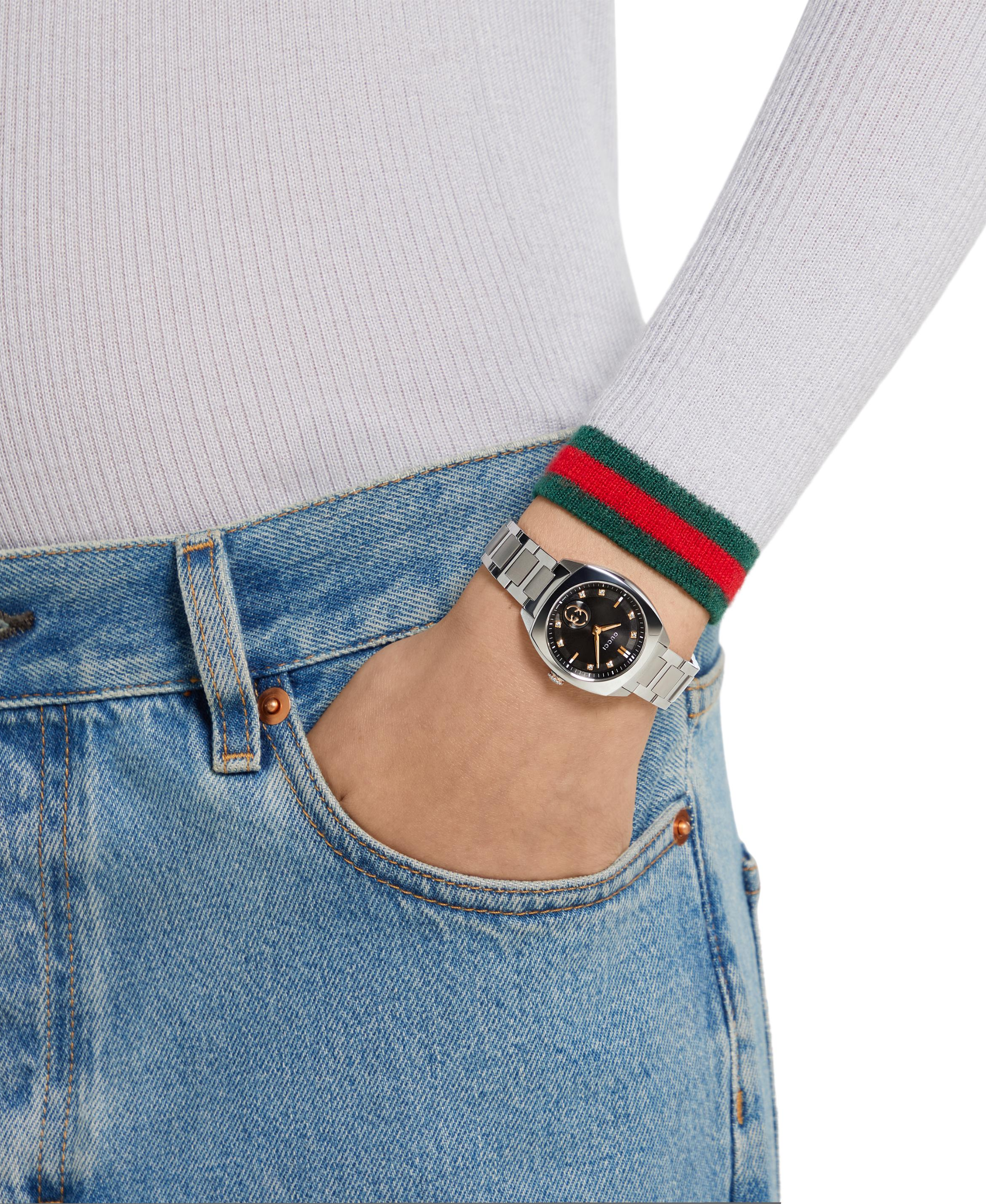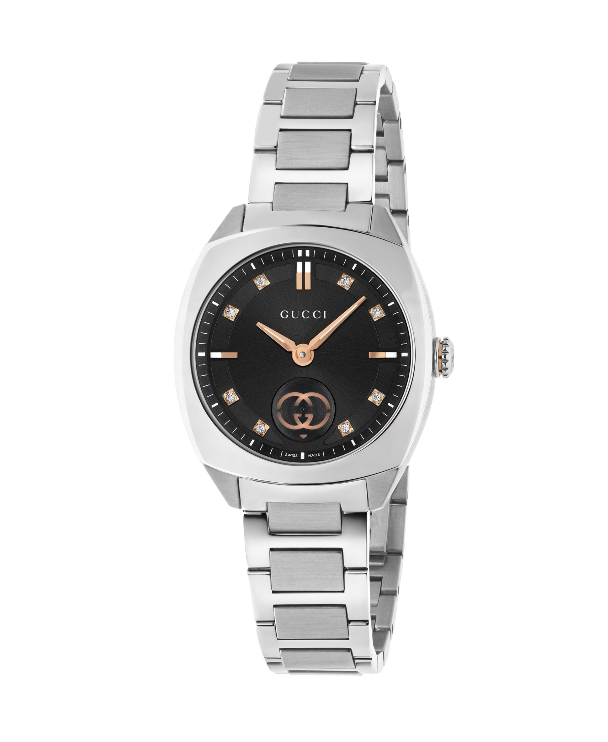 Gucci Interlocking combina estilo y elegancia en un diseño de tamaño compacto, siendo uno de los modelos más vendidos de la marca. Funciona con movimiento de cuarzo y cuenta con cristal de zafiro. La caja es de acero inoxidable y mide 29 mm de diámetro. Su esfera negra y está adornada con ocho diamantes como marcadores horarios. Se complementa con un brazalete de acero inoxidable.