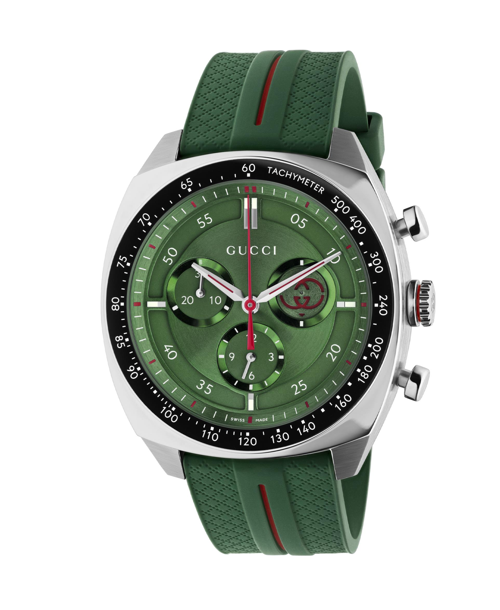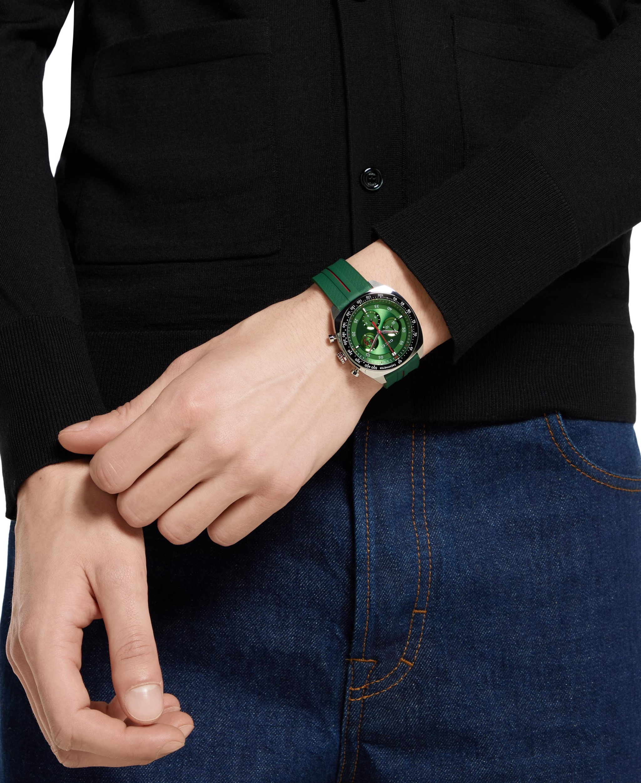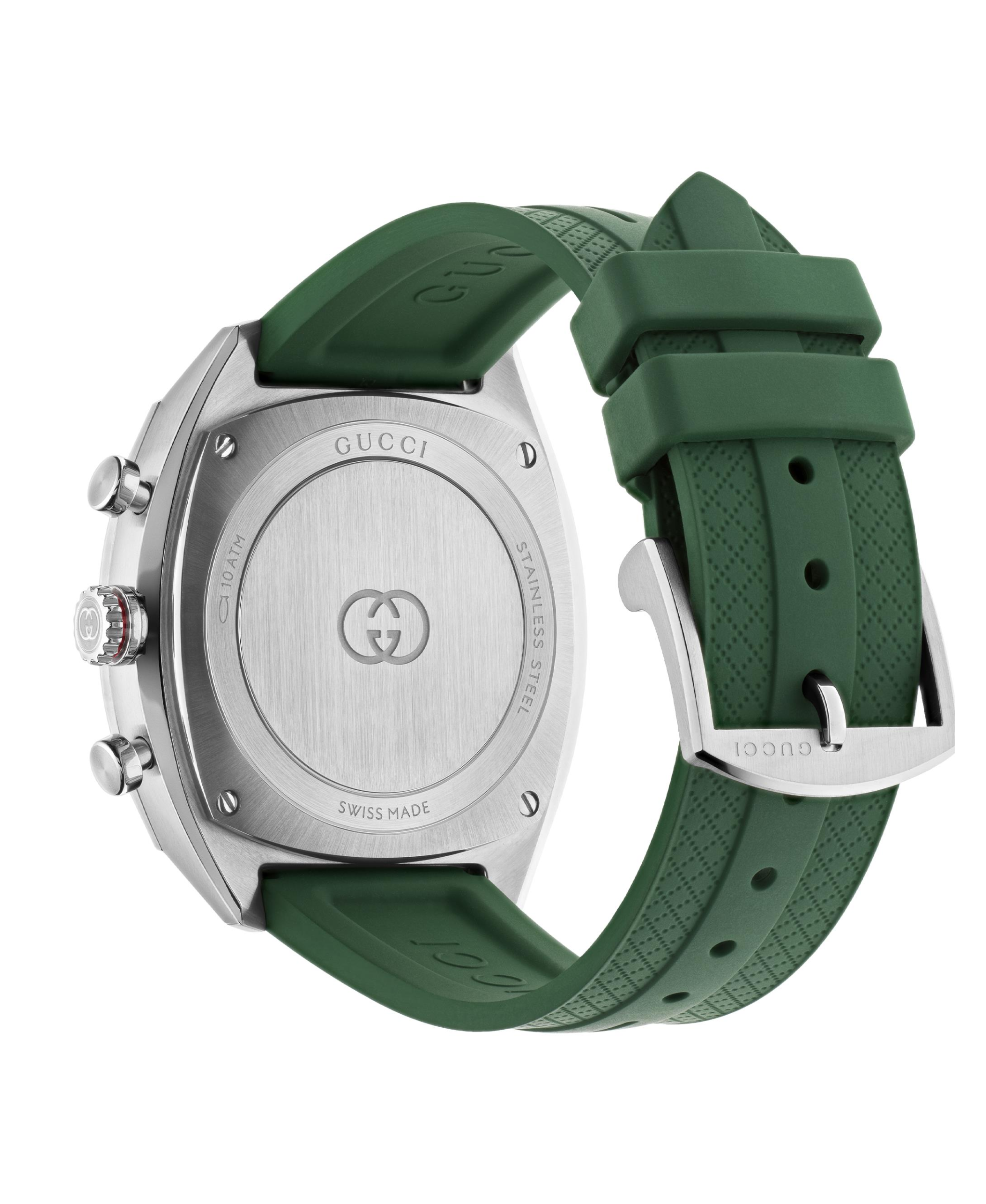 Gucci Interlocking combina una estética deportiva con códigos emblemáticos de la Firma. Funciona con movimiento de cuarzo Swiss Made y cuenta con un cristal de zafiro con revestimiento antirreflectante. La caja es de acero inoxidable y mide 41 mm de diámetro. Su elemento más distintivo es su esfera verde con un segundero pequeño que lleva el logo de GG entrelazada. Se complementa con una correa de goma verde.