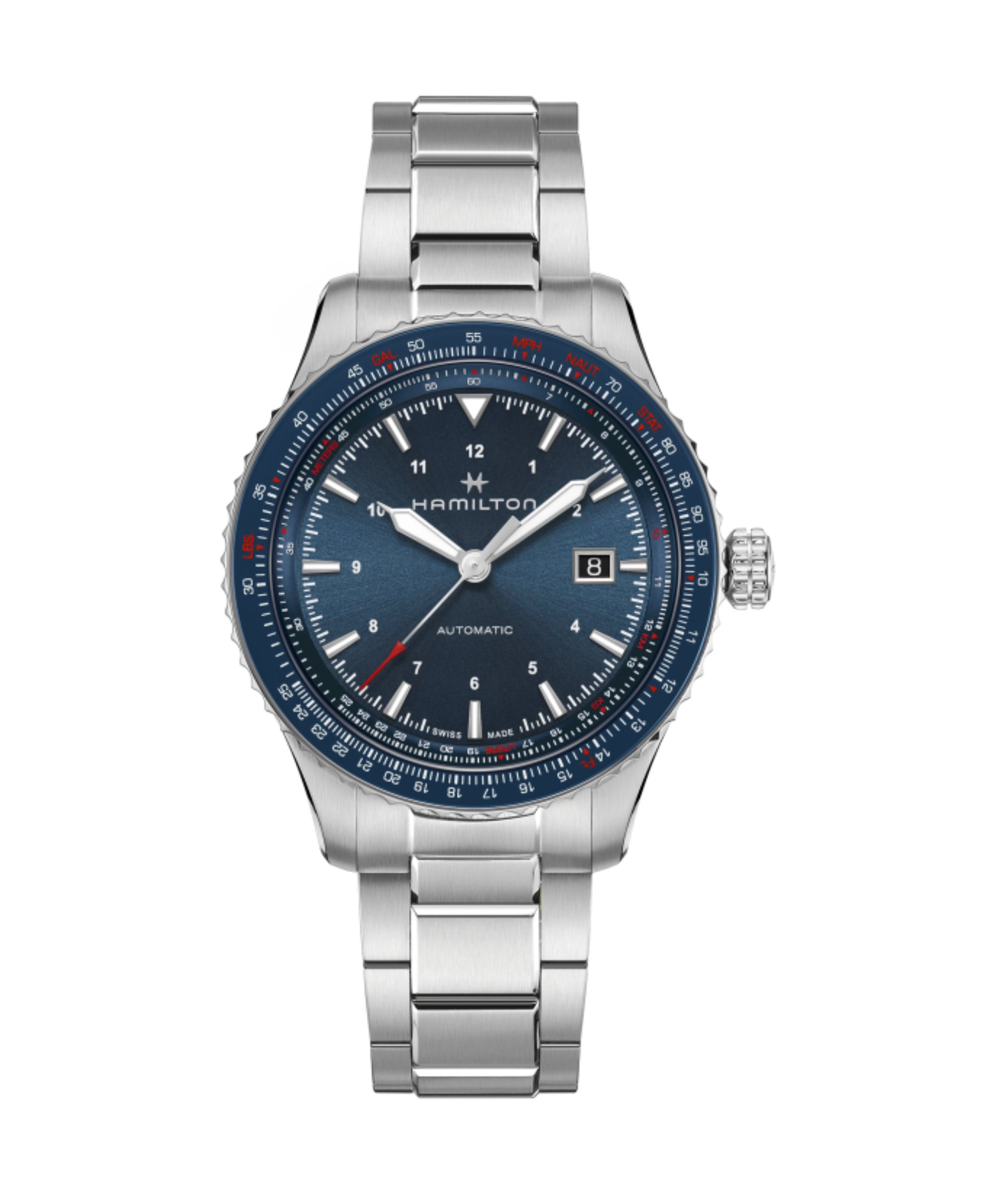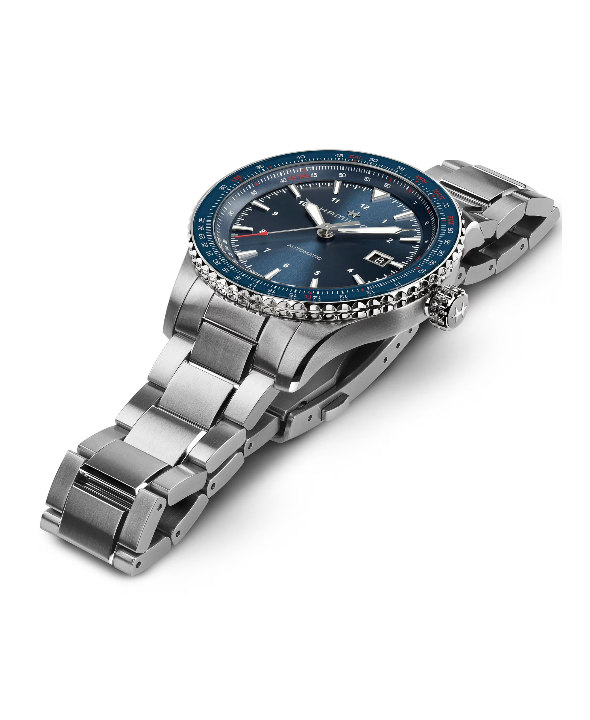 Con esfera azul y bisel con regla de cálculo para aviación. Movimiento H‑10 con reserva de marcha de 80 h, caja de acero de 42 mm con cristal de zafiro y brazalete de acero inoxidable. Inspirado en la aviación, combina funcionalidad técnica y estilo versátil para uso diario