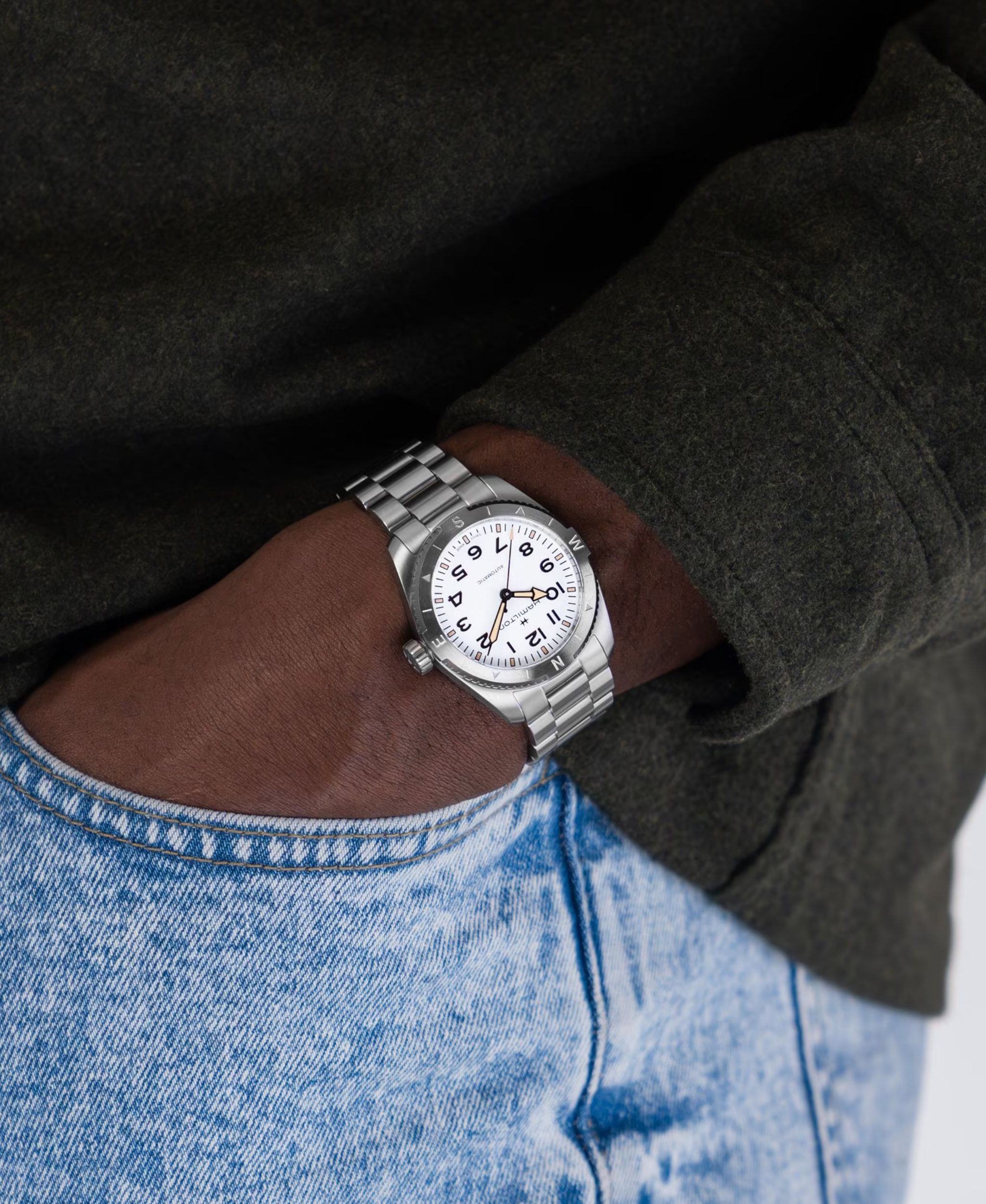 Con esfera blanca arenada para máxima legibilidad. Caja de acero de 37 mm con cristal de zafiro, movimiento H‑10 con reserva de marcha de 80 h y bisel con diseño de brújula. Resistente al agua hasta 100 m y estilo aventurero robusto, ideal para exploración y uso diario.