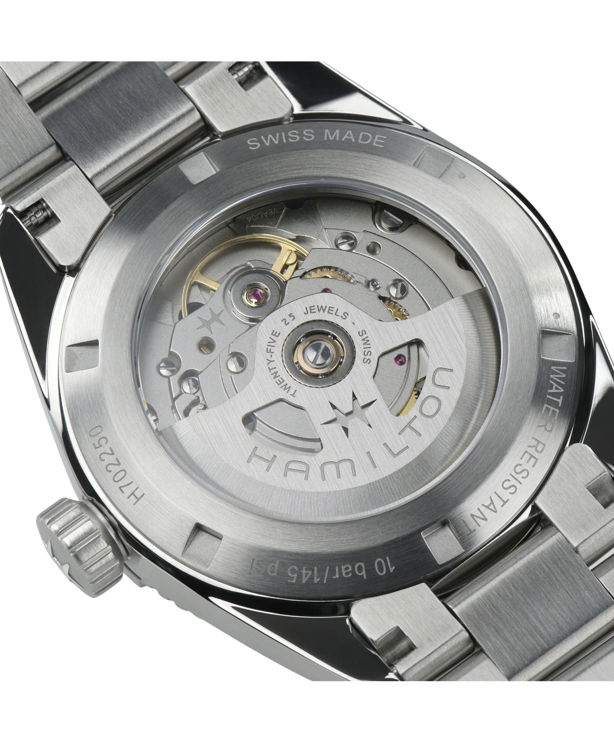 Con esfera negra texturizada y legibilidad máxima gracias al recubrimiento Super‑LumiNova. Caja de acero de 37 mm con cristal de zafiro y brazalete a juego. Movimiento H‑10 con reserva de marcha de 80 h y diseño todoterreno ideal para aventuras y uso diario.