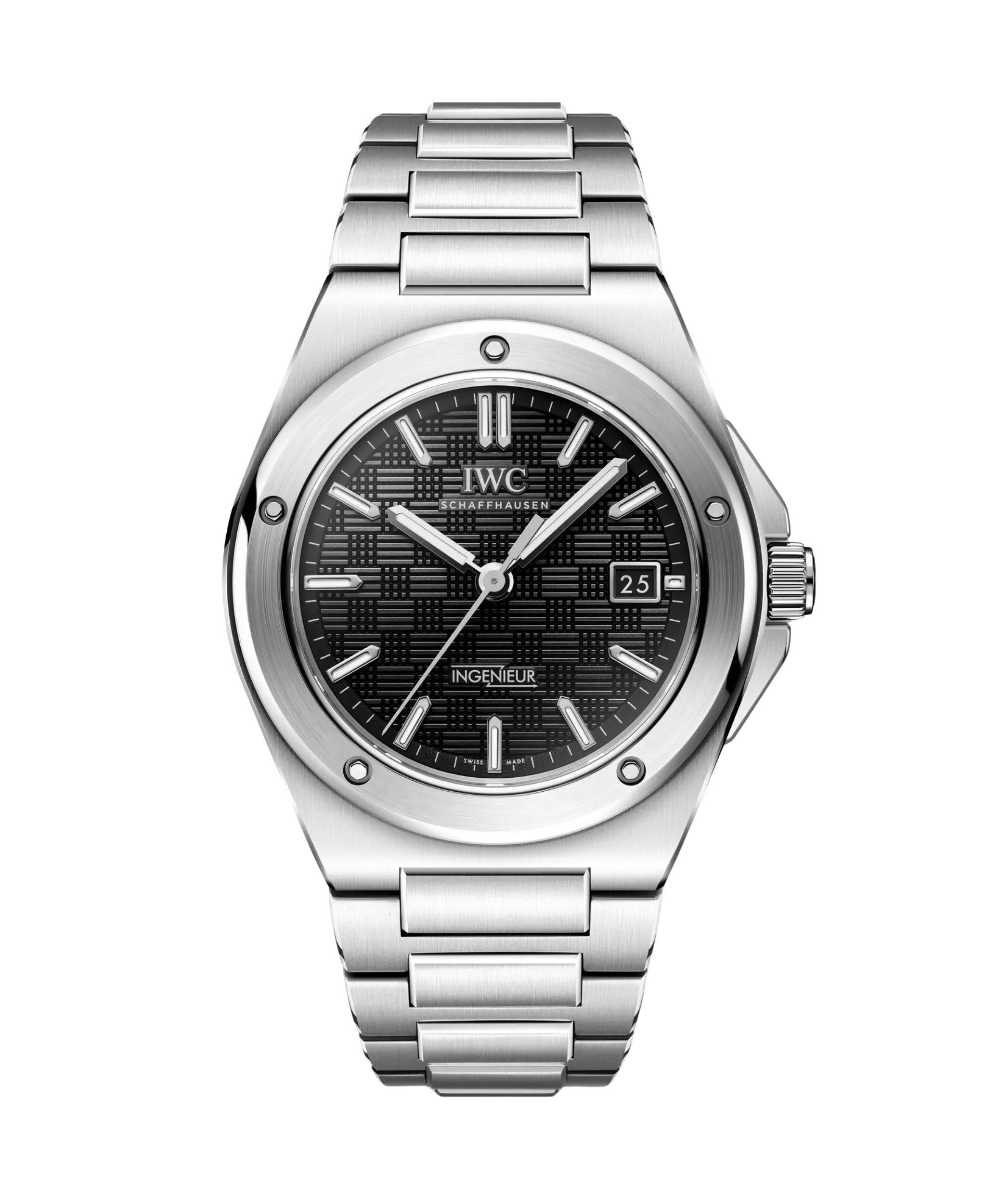 IWC Ingenieur Automático. Destaca por su esfera negra con una estructura de "rejilla" única y su característica luneta atornillada con cinco tornillos poligonales, que le confieren una presencia técnica inigualable. Su brazalete integrado de eslabones en forma de H asegura una ergonomía superior, convirtiéndolo en un icono de acero fino diseñado para resistir las exigencias de un estilo de vida contemporáneo con una elegancia industrial absoluta.