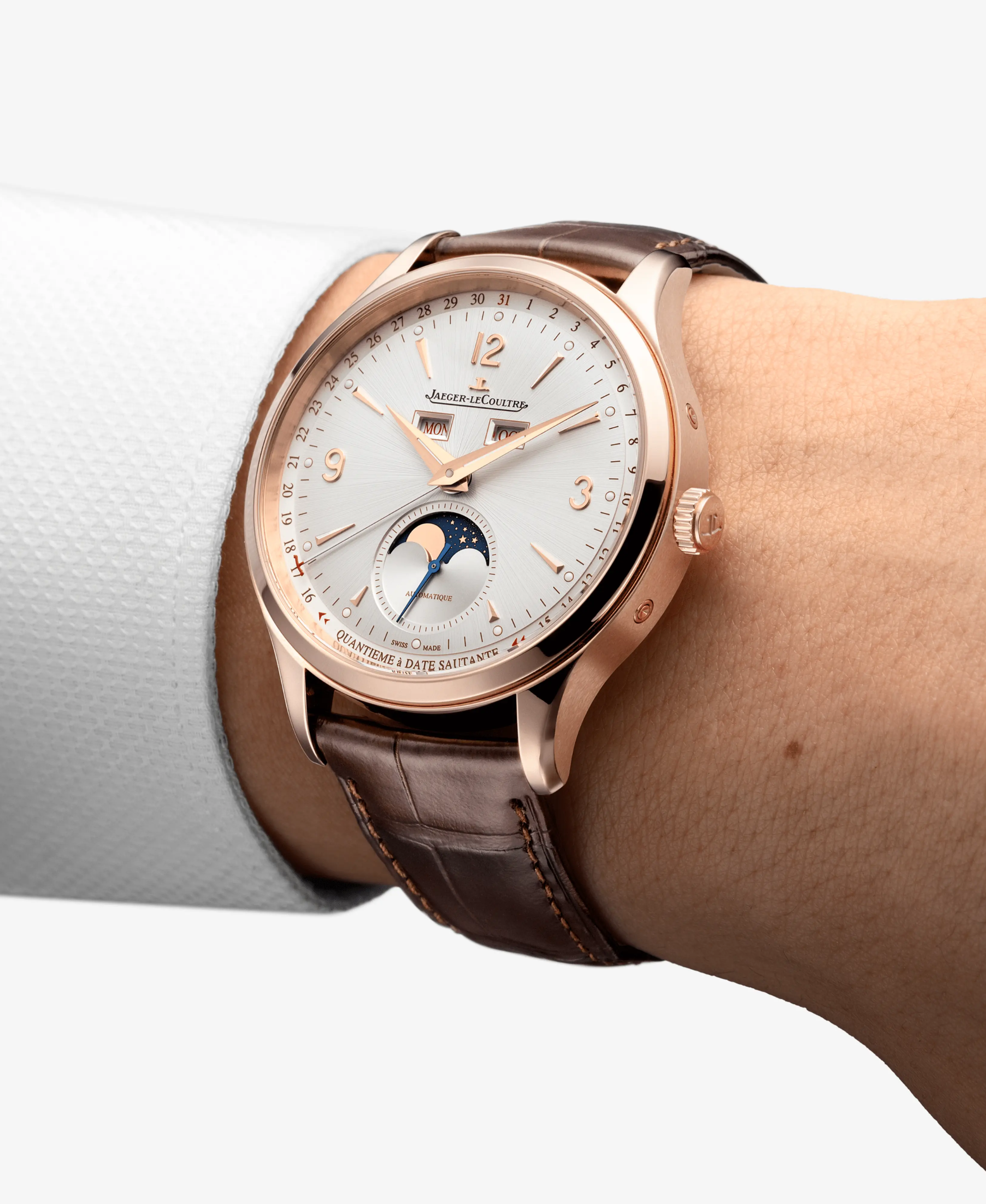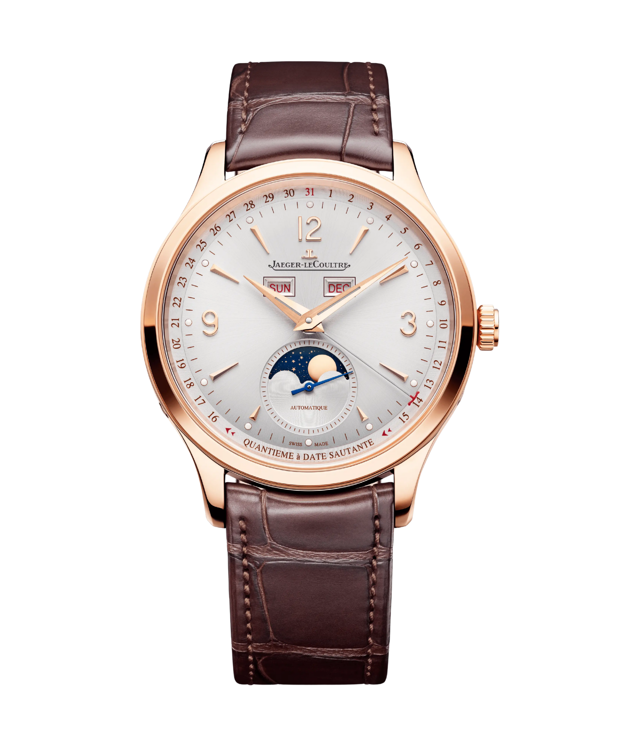 Master Control Calendar en oro rosa es una pieza que personifica la elegancia contemporánea y la excelencia técnica de la Manufactura. Su caja de 40 mm, elaborada en una cálida aleación de oro rosa, enmarca una esfera gris plateada con acabado de rayos de sol que organiza de forma magistral un calendario completo. Este modelo se distingue por su innovadora fecha saltante: el indicador de fecha realiza un salto literal entre los días 15 y 16 del mes para no obstruir la visión de las fases lunares situadas a las 6 horas. En esta ventanilla inferior, la luna aparece y desaparece sobre un fondo azul estrellado, aportando una dimensión poética al diseño.