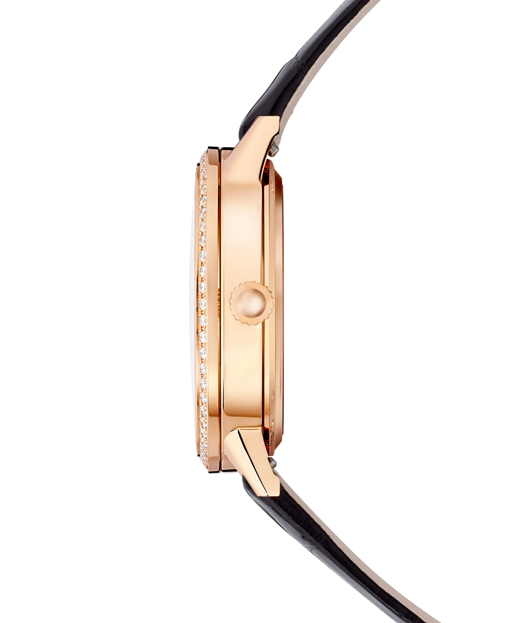 Rendez-Vous Classic Night & Day en oro rosa es una expresión sublime de la elegancia y la feminidad que define a esta colección de Jaeger-LeCoultre. Este guardatiempos combina la calidez de su caja de 34 mm en oro rosa de 18 quilates con el brillo de un sofisticado engaste de diamantes en el bisel. Su esfera gris plateada presenta un refinado acabado guilloqueado y está adornada con las icónicas cifras florales calcadas de la línea Rendez-Vous. El diseño se distingue por la complicación de día y noche visible a las 6 horas, donde un sol y una luna dorados se alternan poéticamente sobre el cielo.