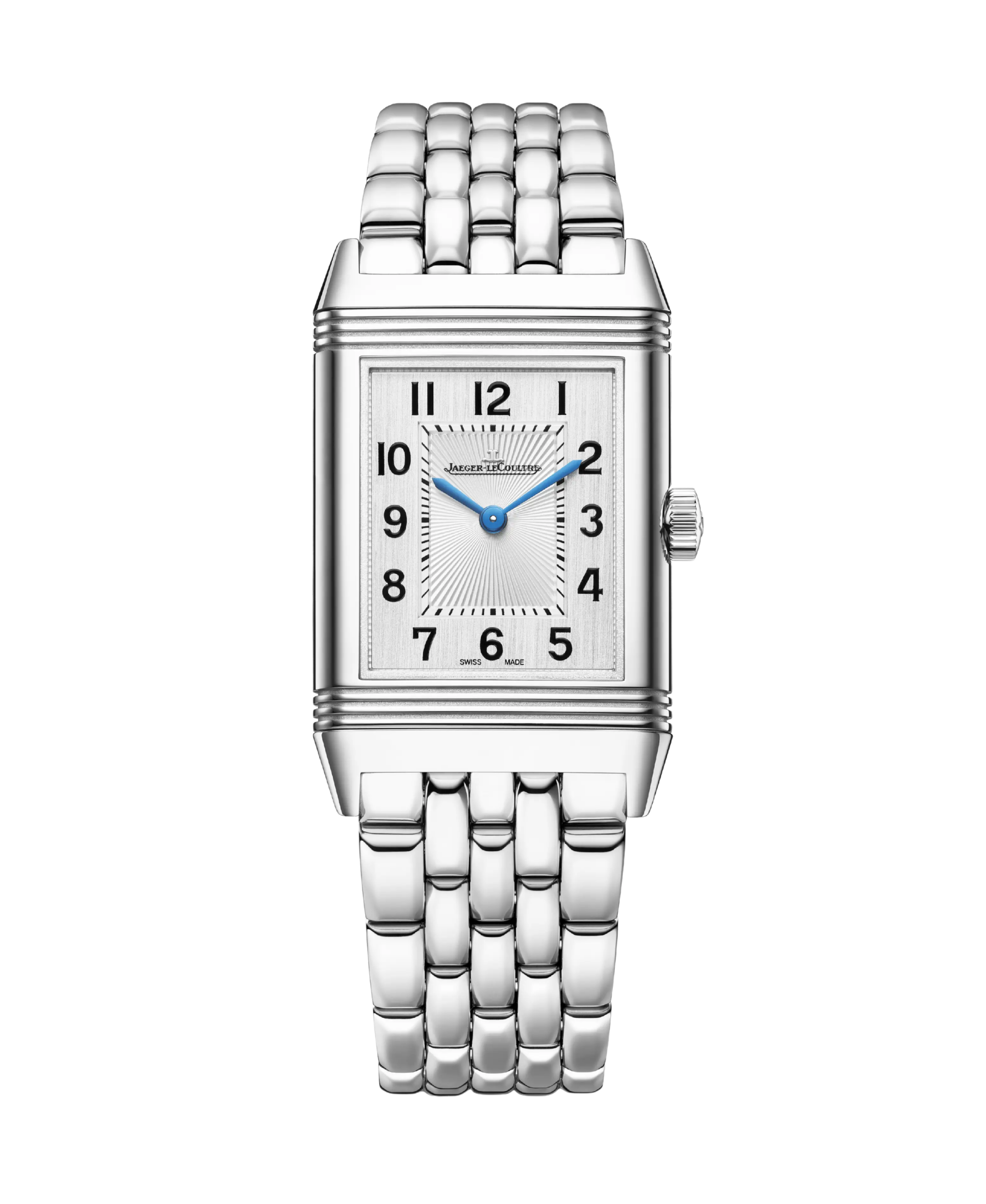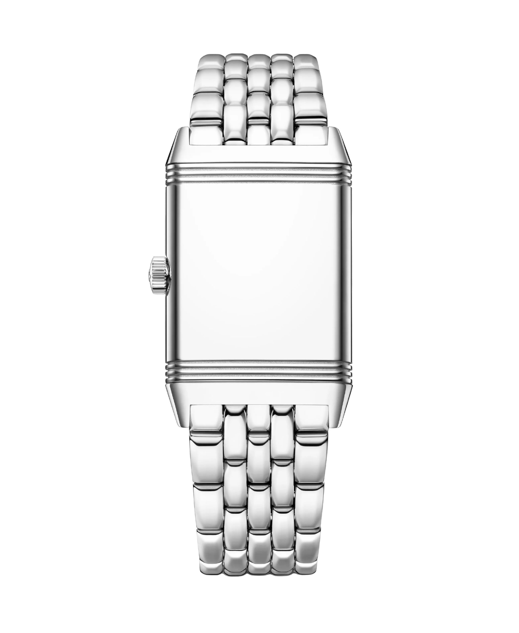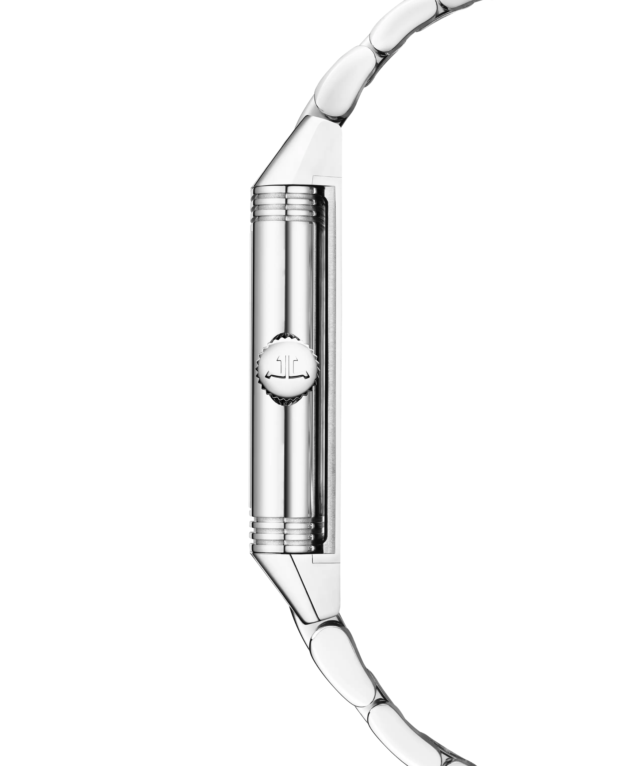 Reverso Classic Monoface en acero inoxidable representa la pureza del diseño Art Déco que ha definido a este icono de la relojería desde su creación en 1931. Este modelo se distingue por su caja rectangular reversible de acero, con unas dimensiones de 40 x 24,4 mm y un perfil delgado de 7,56 mm que garantiza una elegancia atemporal. Su esfera plateada presenta un acabado satinado circular en el centro, rodeado por una minutería de ferrocarril y los emblemáticos números arábigos rectos.