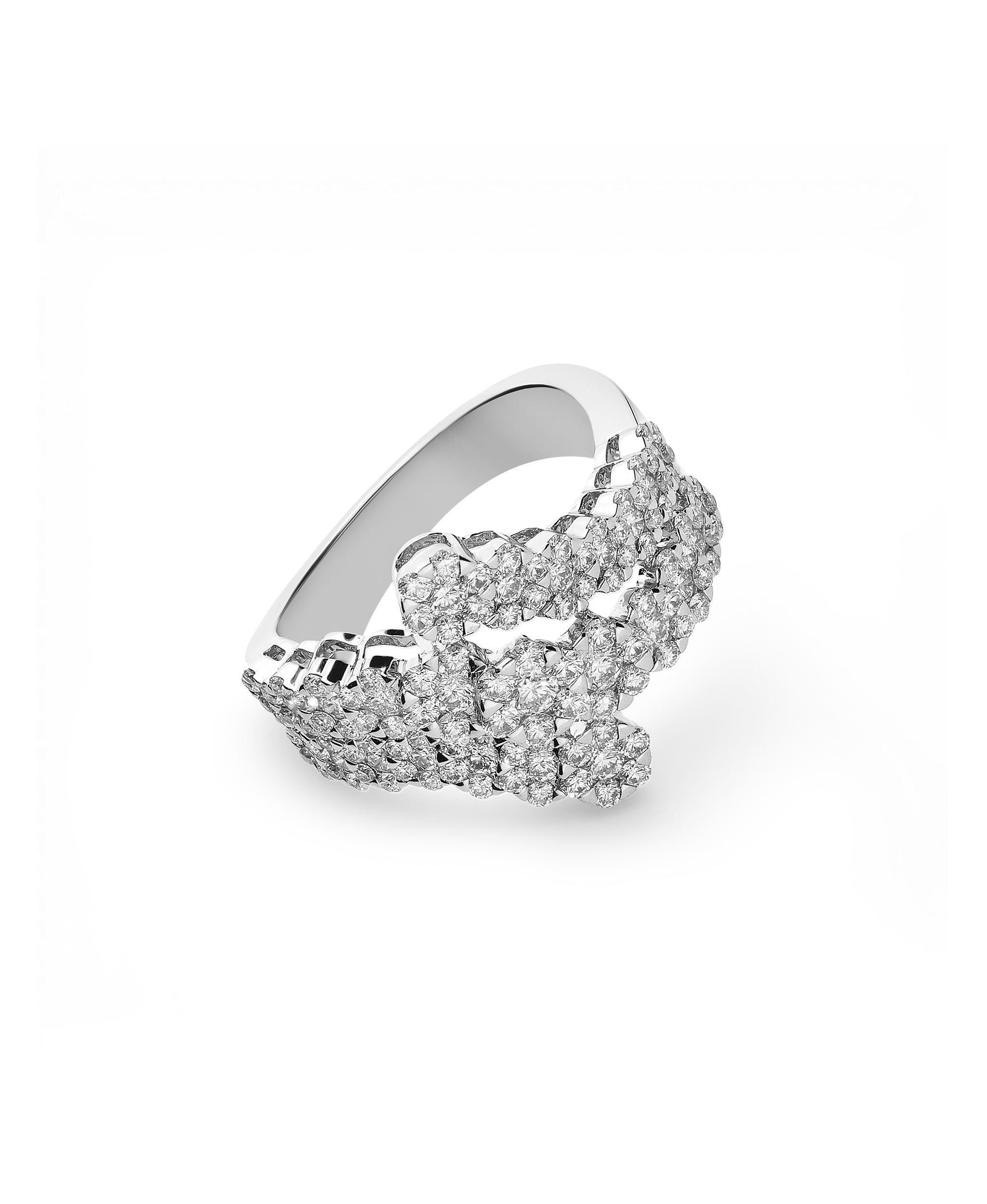 Anillo de triple banda elaborado en oro blanco, diseñado con un sofisticado entramado de rosetas de diamantes que aportan volumen y brillo desde todos los ángulos. Con 131 diamantes engastados que suman un total de 1,71 quilates, ofrece un efecto luminoso y envolvente.