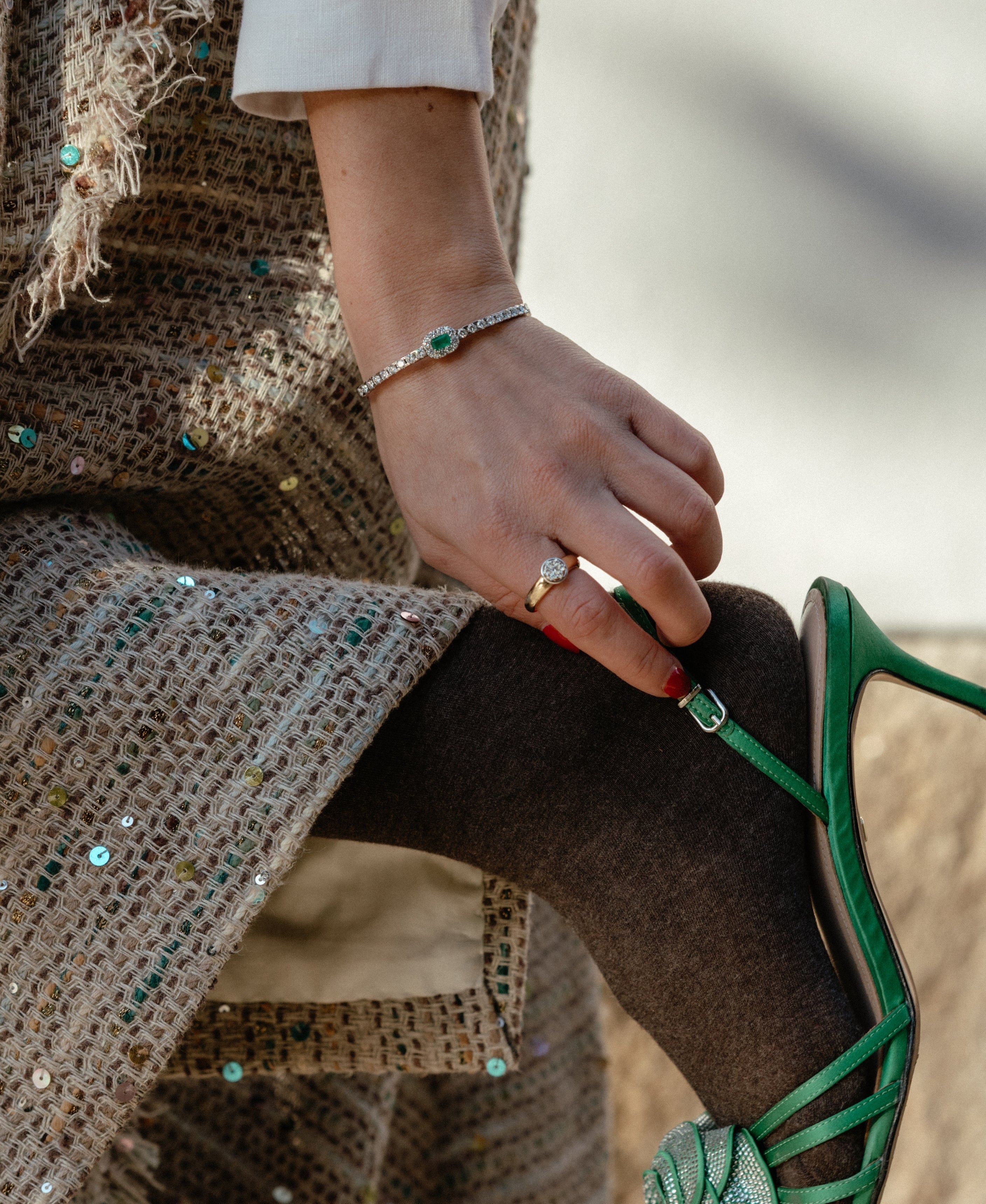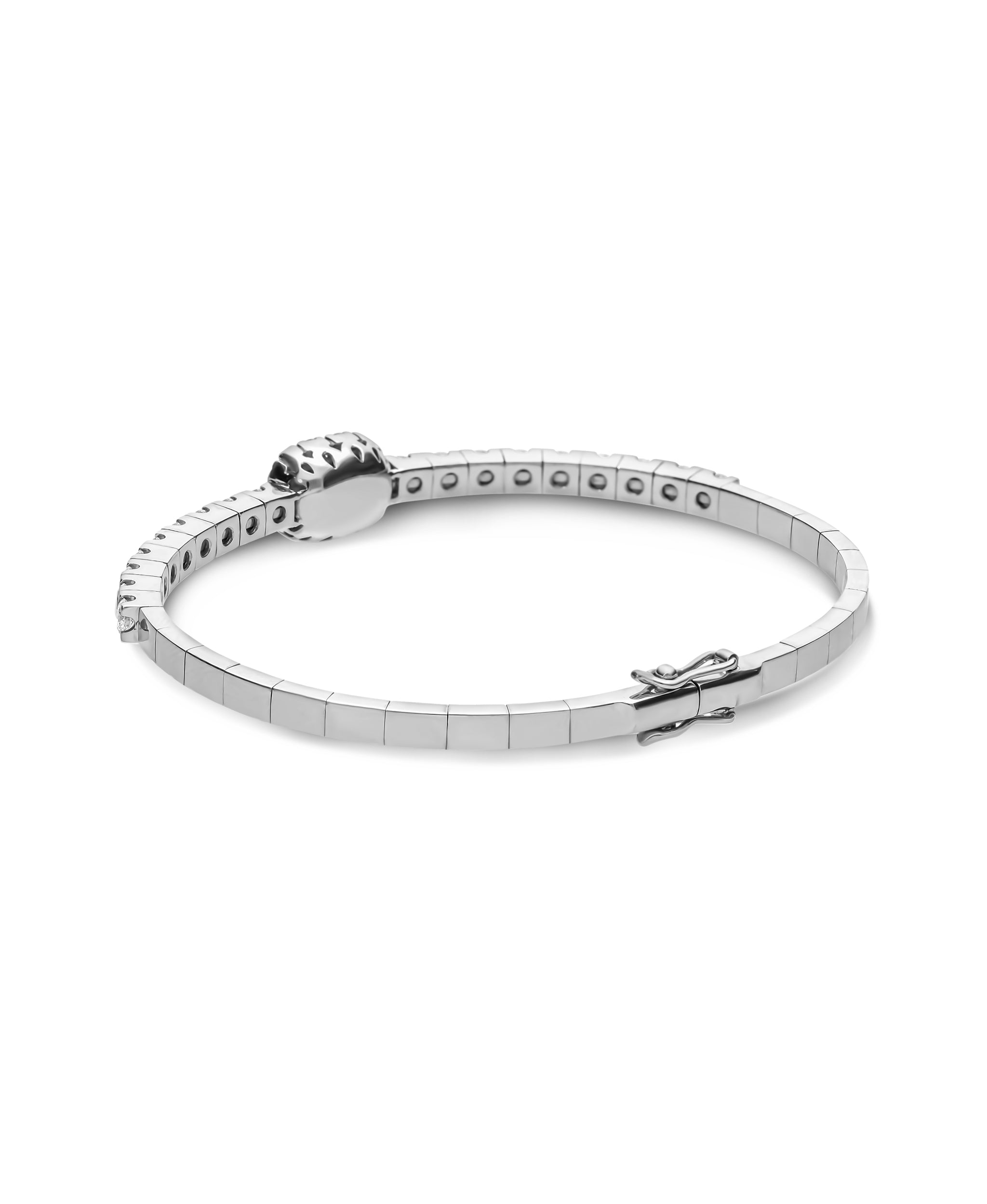 El brazalete esta engastado con 2,34 quilates de diamantes que recorren la mitad del brazo de la pulsera. En el centro, una esmeralda talla esmeralda de 0,55 cts se convierte en protagonista, rodeada por una delicada roseta de diamantes que realza su color verde profundo.