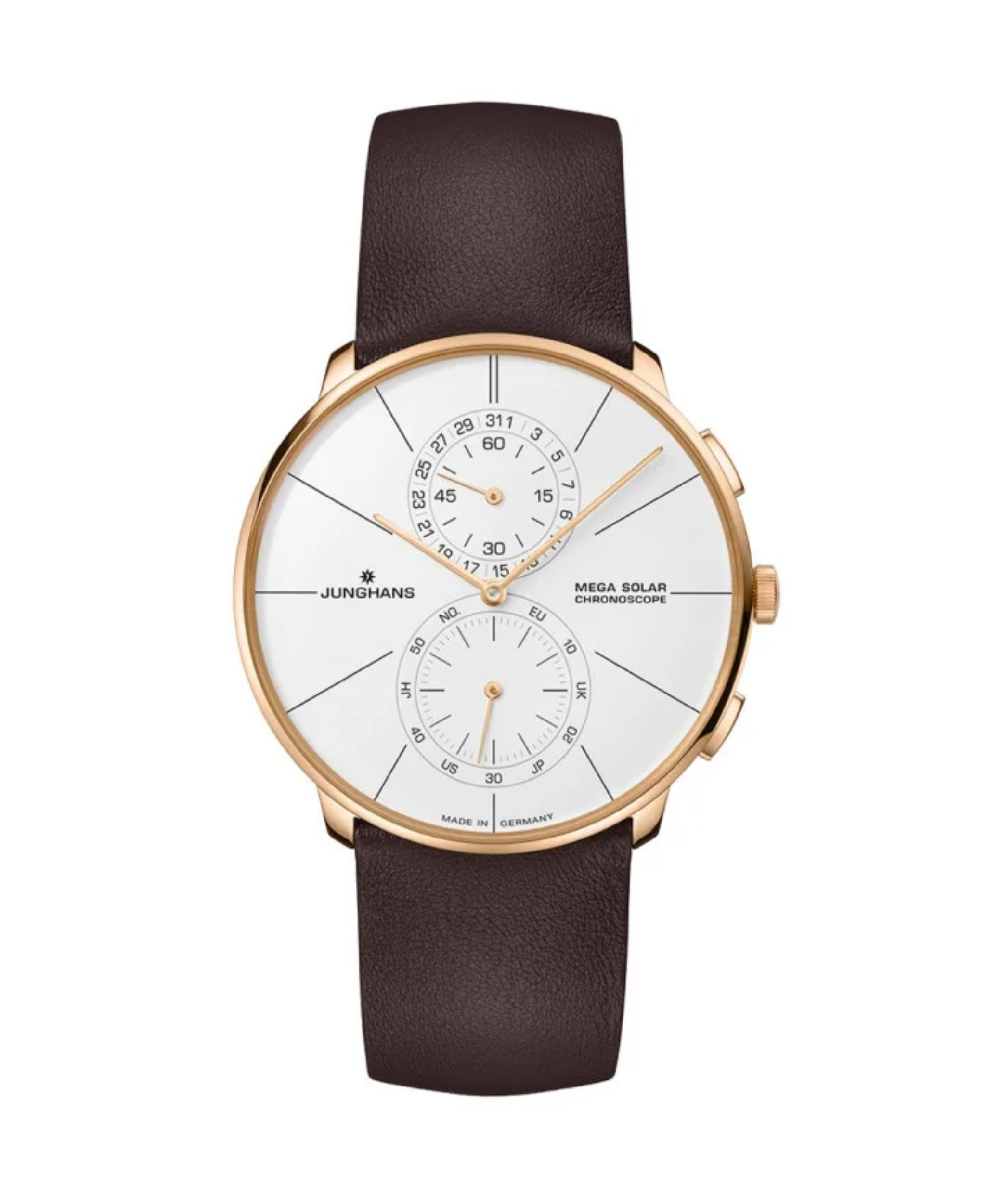 Junghans Meister Fein Chronoscope Mega es la fusión perfecta entre la estética minimalista de la línea "Fein" y la tecnología más avanzada de la Selva Negra. Este modelo destaca por su esfera blanca mate de una pureza absoluta, donde los totalizadores del cronógrafo se integran con una discreción magistral. Su caja ultraplana de 39,5 mm alberga un movimiento solar radiocontrolado que garantiza una precisión atómica sin necesidad de cambiar jamás la batería. Es una pieza de diseño arquitectónico que, gracias a su correa de piel marrón, ofrece un aspecto más cálido y clásico sin perder su espíritu tecnológico.