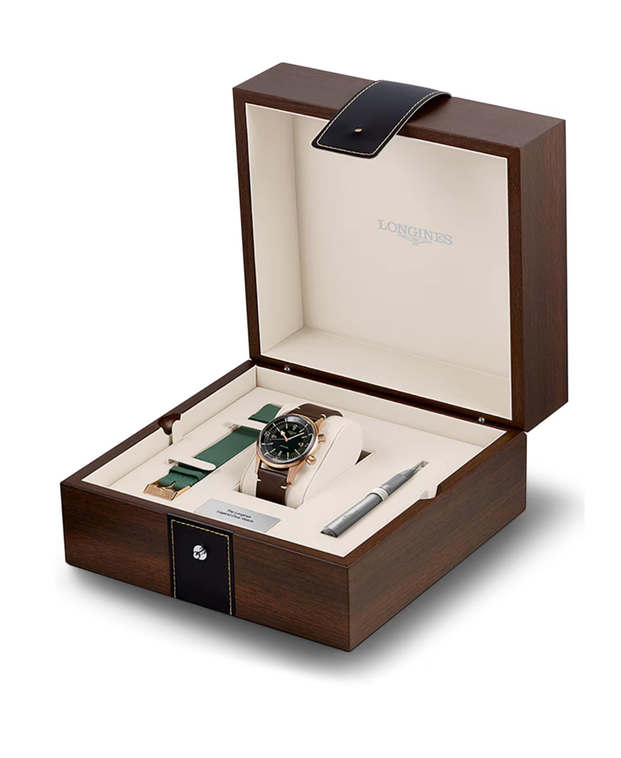 Longines Legend Diver Bronze es un reloj automático suizo con una caja de 42 mm fabricada en bronce con un fondo de titanio. Está impulsado por un movimiento mecánico automático que ofrece una reserva de marcha de 72 horas y está equipado con una espiral de silicio. Su diseño de buceo se caracteriza por las dos coronas a rosca y un bisel giratorio interno (realce giratorio), que protege los ajustes de inmersión. La esfera es de color verde con índices y agujas tratados con Super-Luminova. Es altamente resistente al agua, hasta 300 metros (30 bares), y se presenta con una pulsera de piel con hebilla.