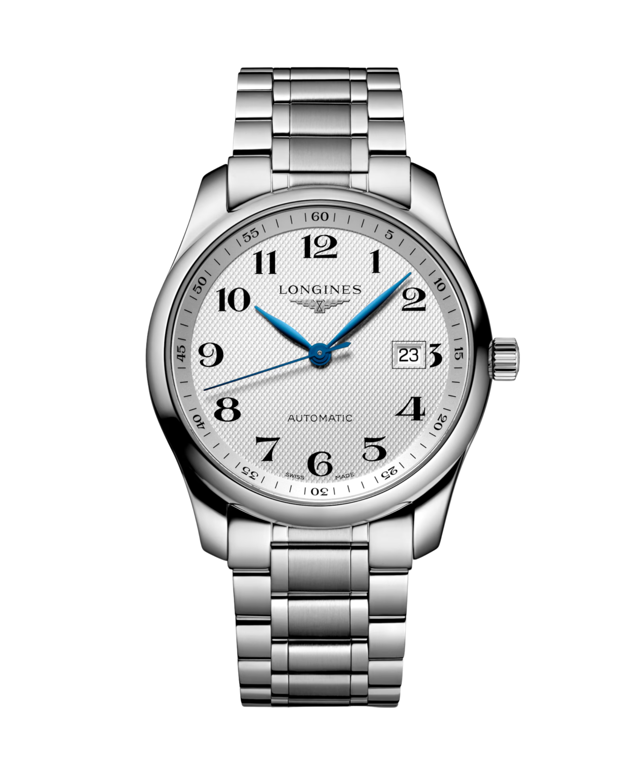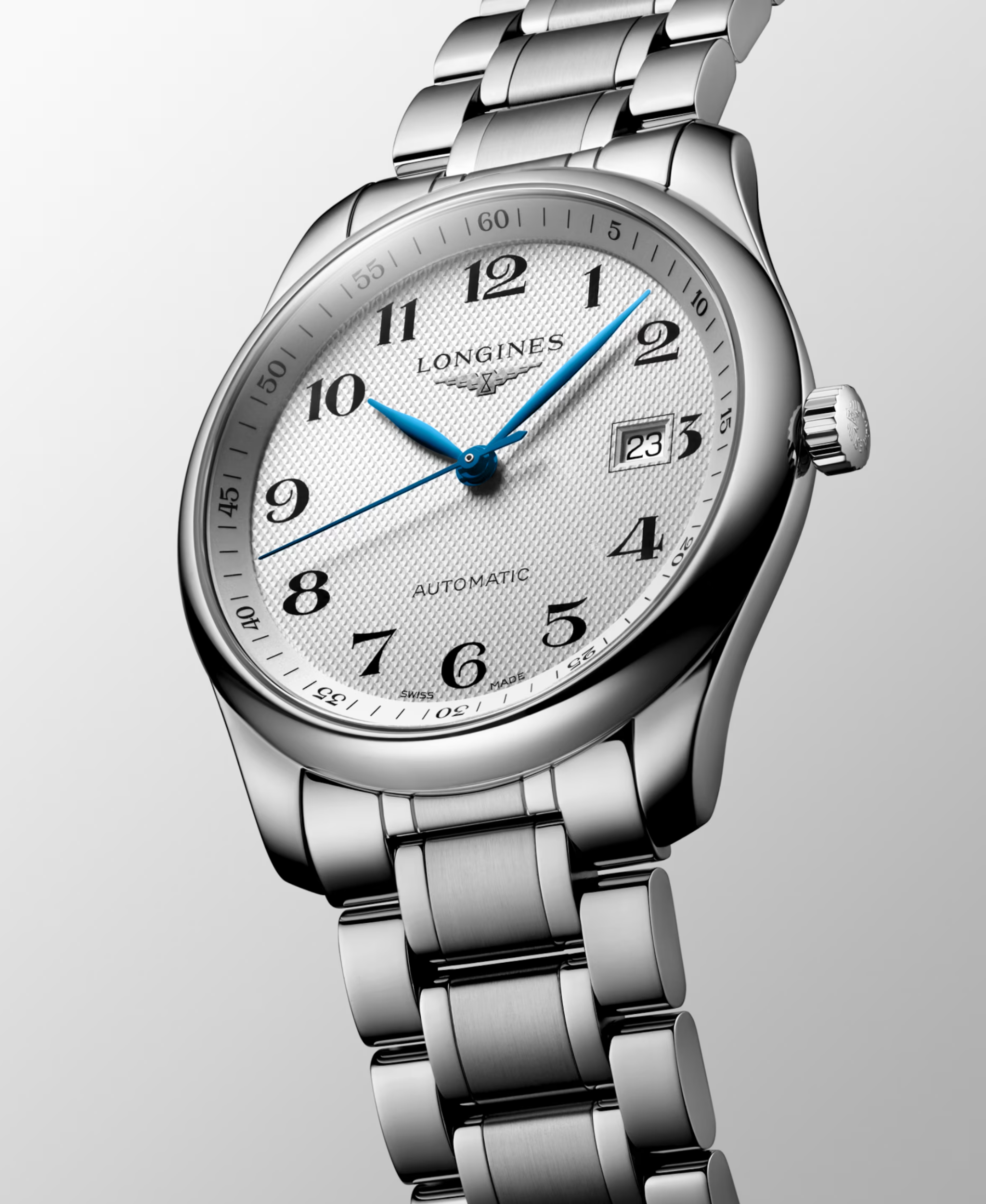 Representación definitiva de la versatilidad y la distinción suiza. Este guardatiempos destaca por su emblemática esfera plateada con acabado "grano de cebada", una textura que confiere al dial una profundidad clásica inconfundible. Las agujas de acero azulado contrastan con maestría sobre el fondo texturizado, mientras que los números árabes pintados completan una esfera equilibrada y de fácil lectura. Es un reloj que celebra la herencia de Longines uniendo la resistencia del acero con la sofisticación de la alta relojería.