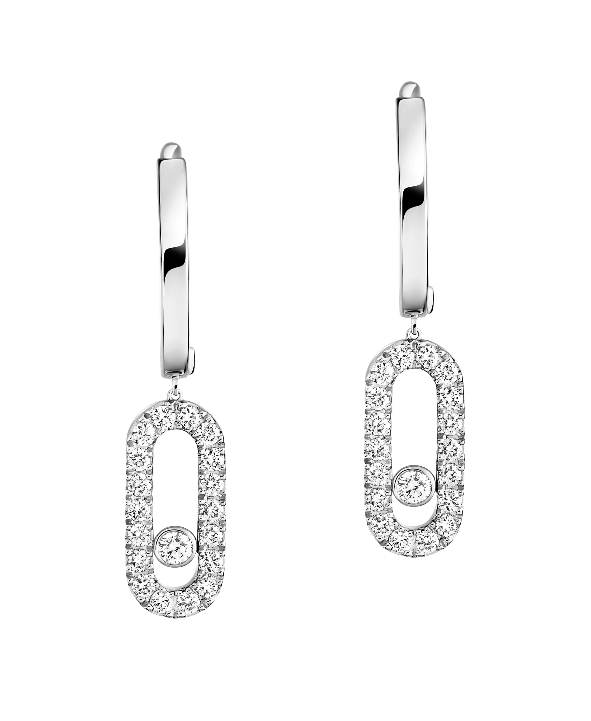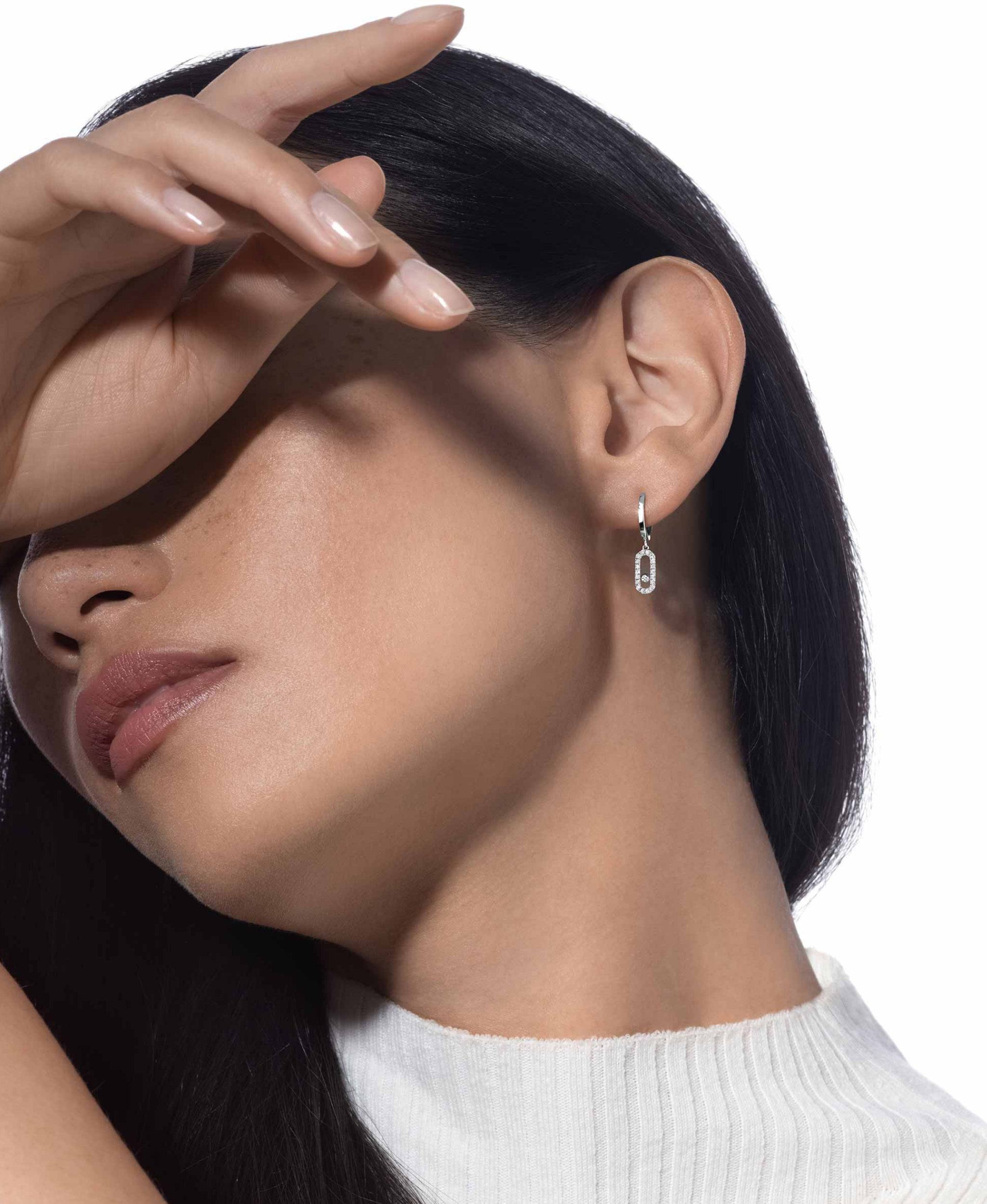 El regalo de Alta Joyería perfecto para elevar cualquier look. Estos Pendientes de Aro Move Uno en Oro Blanco de 18K son una obra maestra artesanal, donde el pavé de diamantes enmarca el emblemático diamante en movimiento: un símbolo de luz y lujo atemporal. Su diseño versátil permite infinitas combinaciones para un estilo audaz. Completa tu look combinándola con otras piezas de la colección MOVE CLASSIQUE.