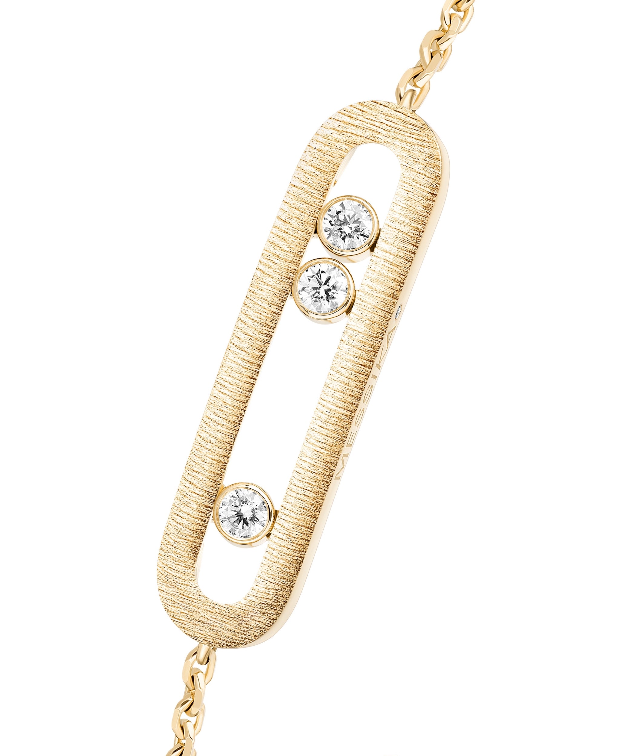 Afirma tu estilo con esta declaración de alta joyería. La Pulsera Move Classique Ciselé en oro amarillo es una pieza artesanal que dialoga entre el brillo solar del oro cincelado y el resplandor de los diamantes. Su maestría joyera realza cada movimiento con un efecto asombroso, fusionando lo moderno con un toque sutilmente *vintage*. Completa tu look combinándola con otras piezas de la colección MOVE CISELÉ.