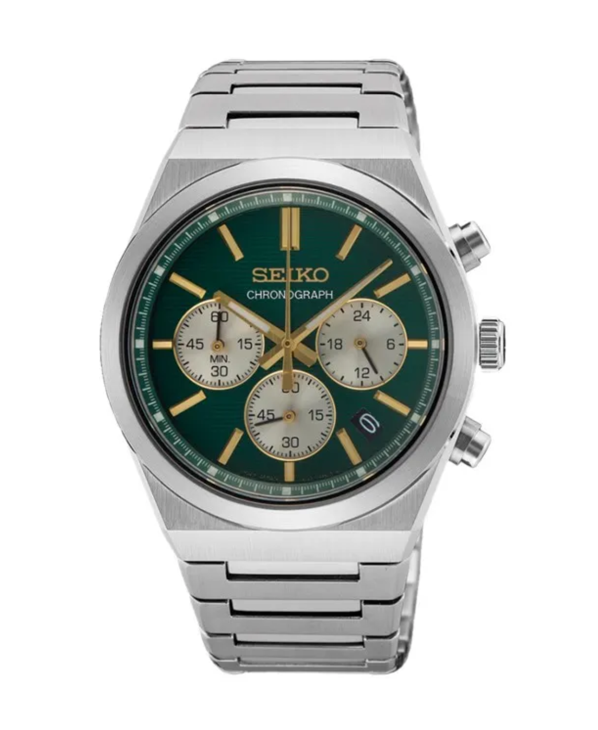 Cronógrafo de cuarzo con caja de acero inoxidable 40 mm y cristal de zafiro. Esfera verde con subesferas plateadas y manecillas e índices dorados, brazalete de acero con cierre desplegable y resistencia al agua hasta 10 bar (100 m). Diseño versátil para uso diario con estilo clásico y funcional.