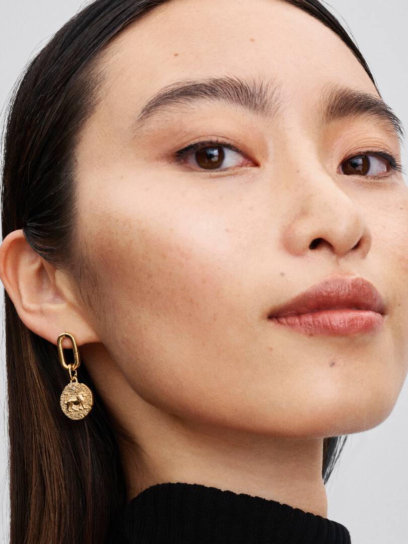 Medallón de Pandora con recubrimiento en oro de 14k y diseño de león de inspiración vintage en el anverso. En el reverso, el grabado en latín “VITA VERITAS VIRTUS” — “VIDA, HONESTIDAD, VALENTÍA” — aporta un significado profundo y atemporal.