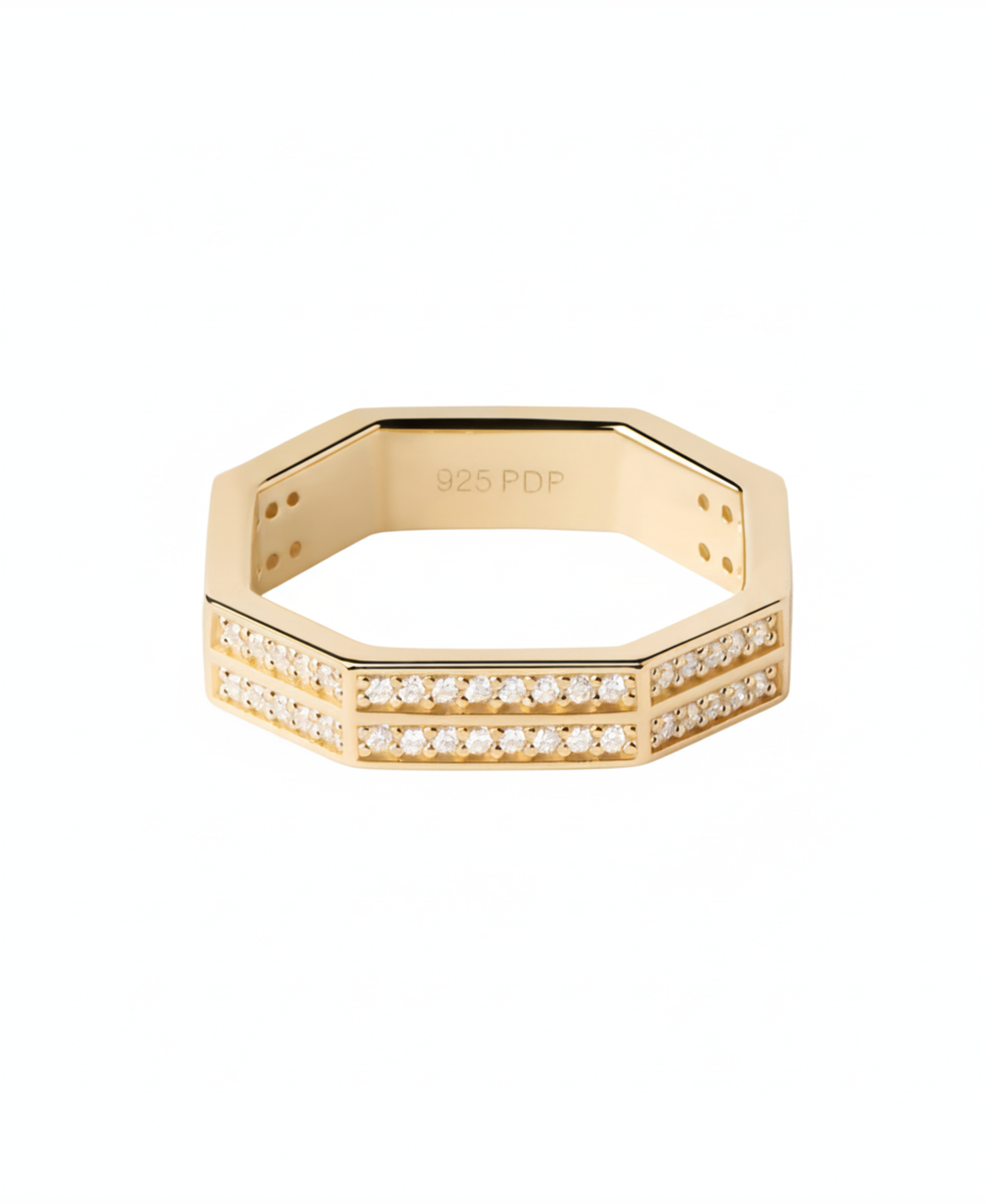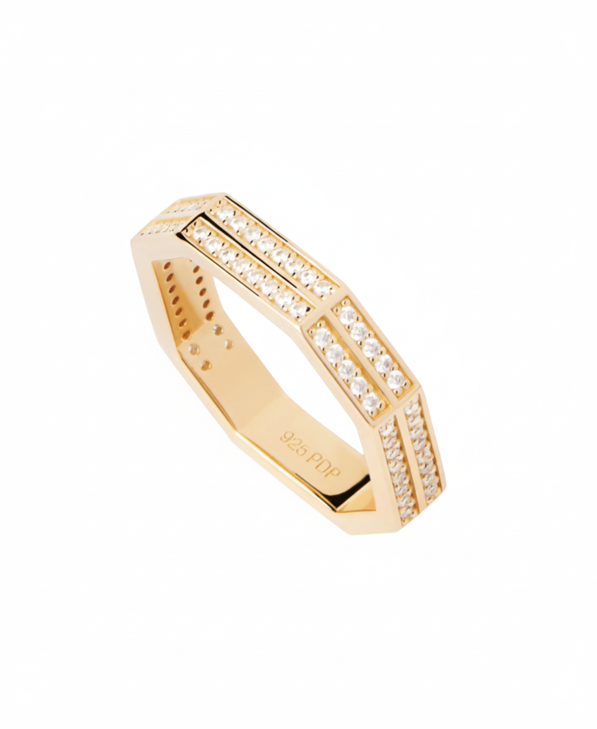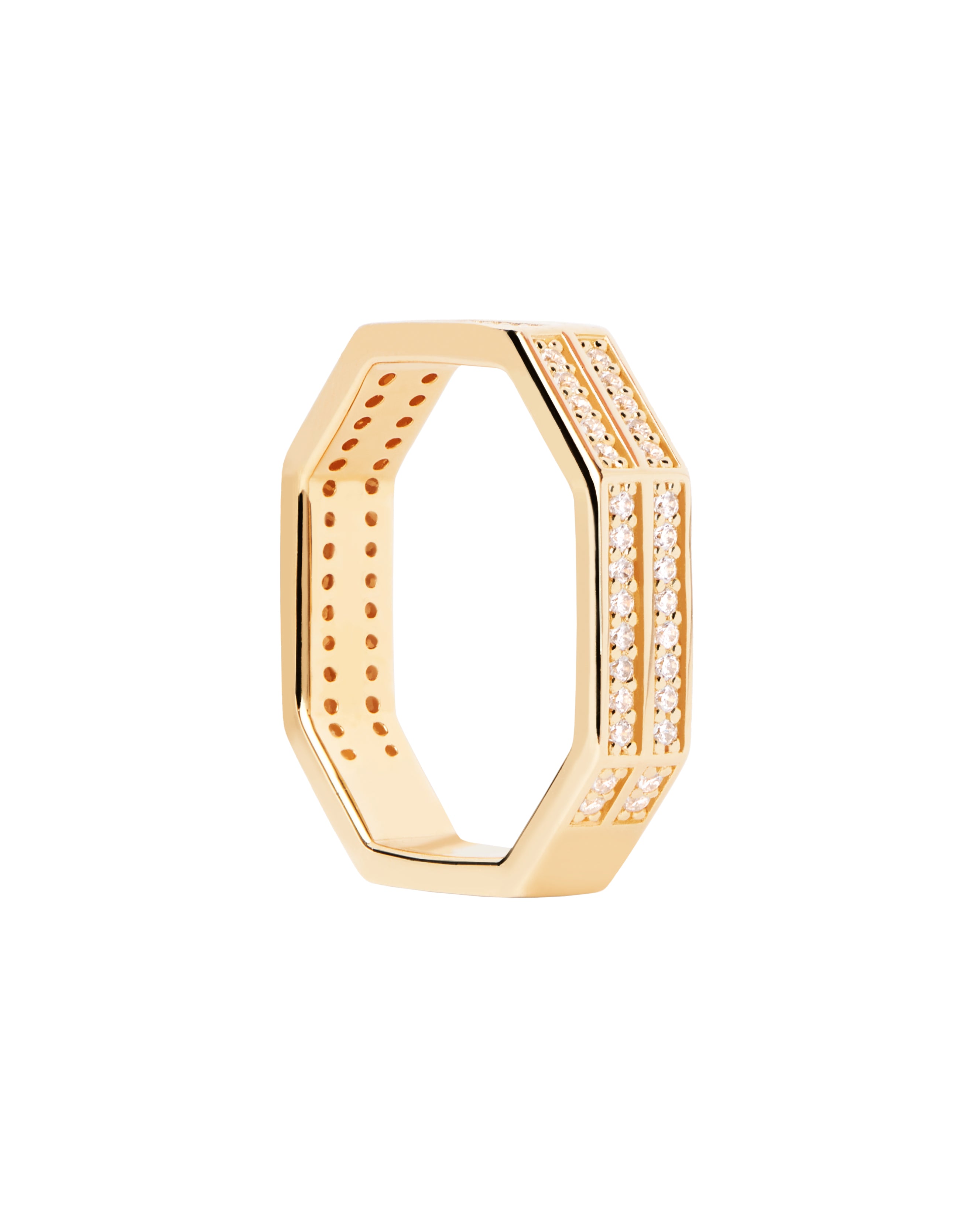 Anillo eternity de plata bañada en oro con circonitas blancas de corte rectangular de la marca PDPAOLA. Una pieza de joyería contemporánea pensada para la mujer de hoy.