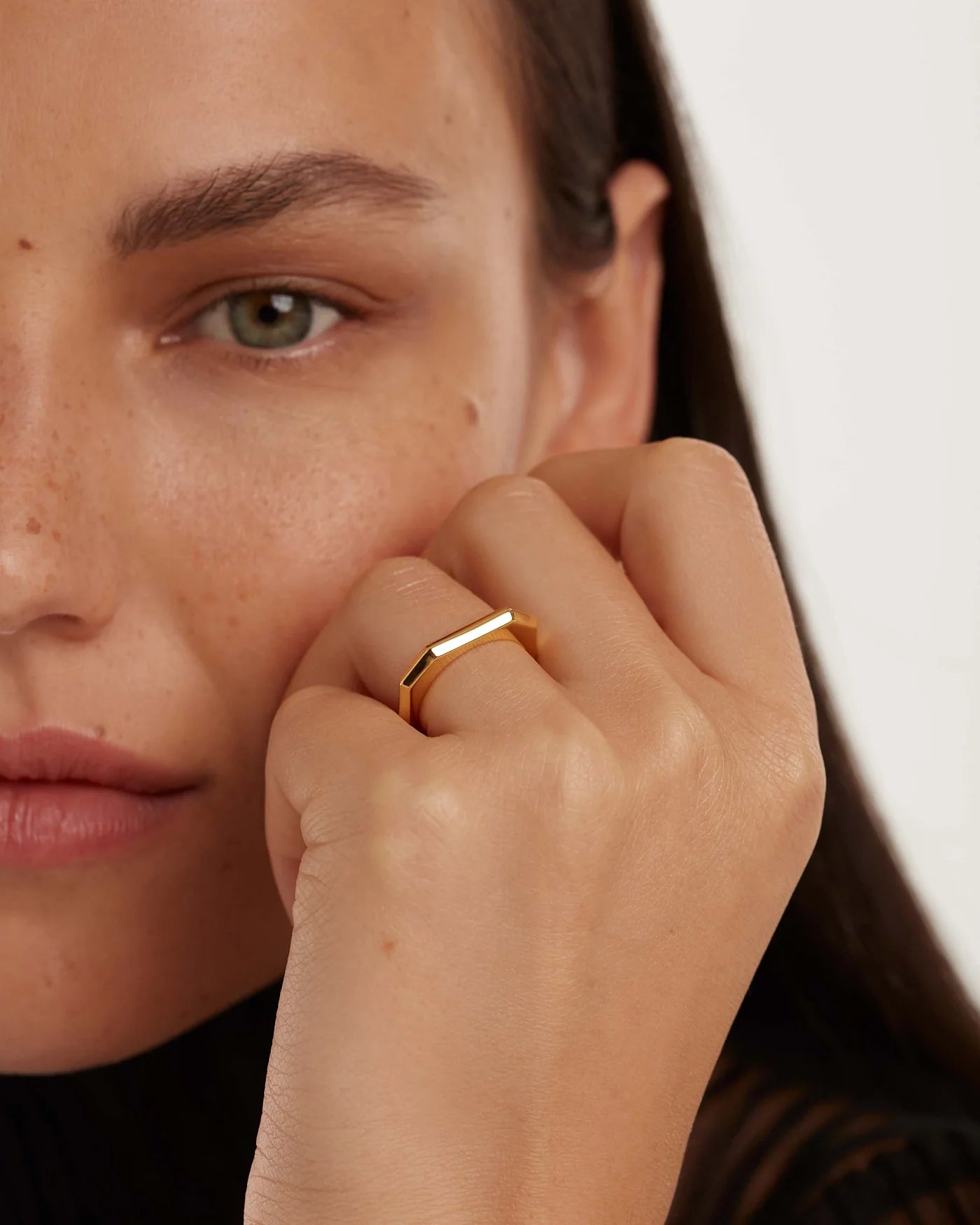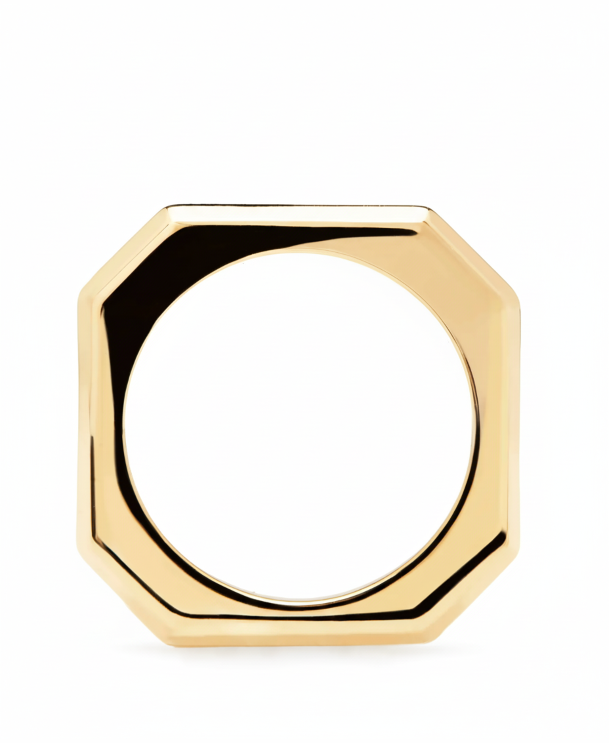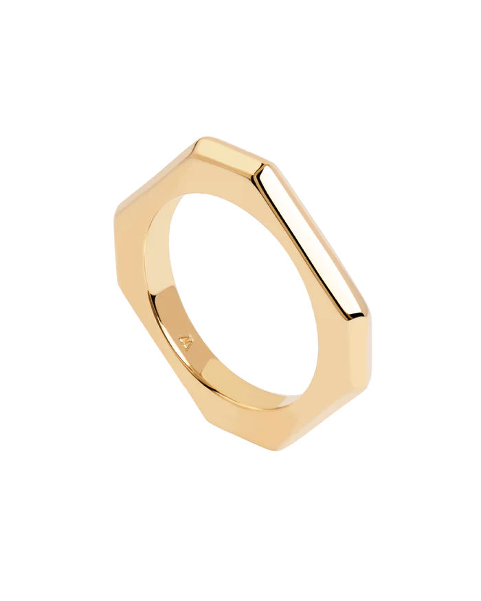 Anillo básico octogonal de plata bañada en oro de la marca PDPAOLA. Una pieza de joyería contemporánea pensada para la mujer de hoy.