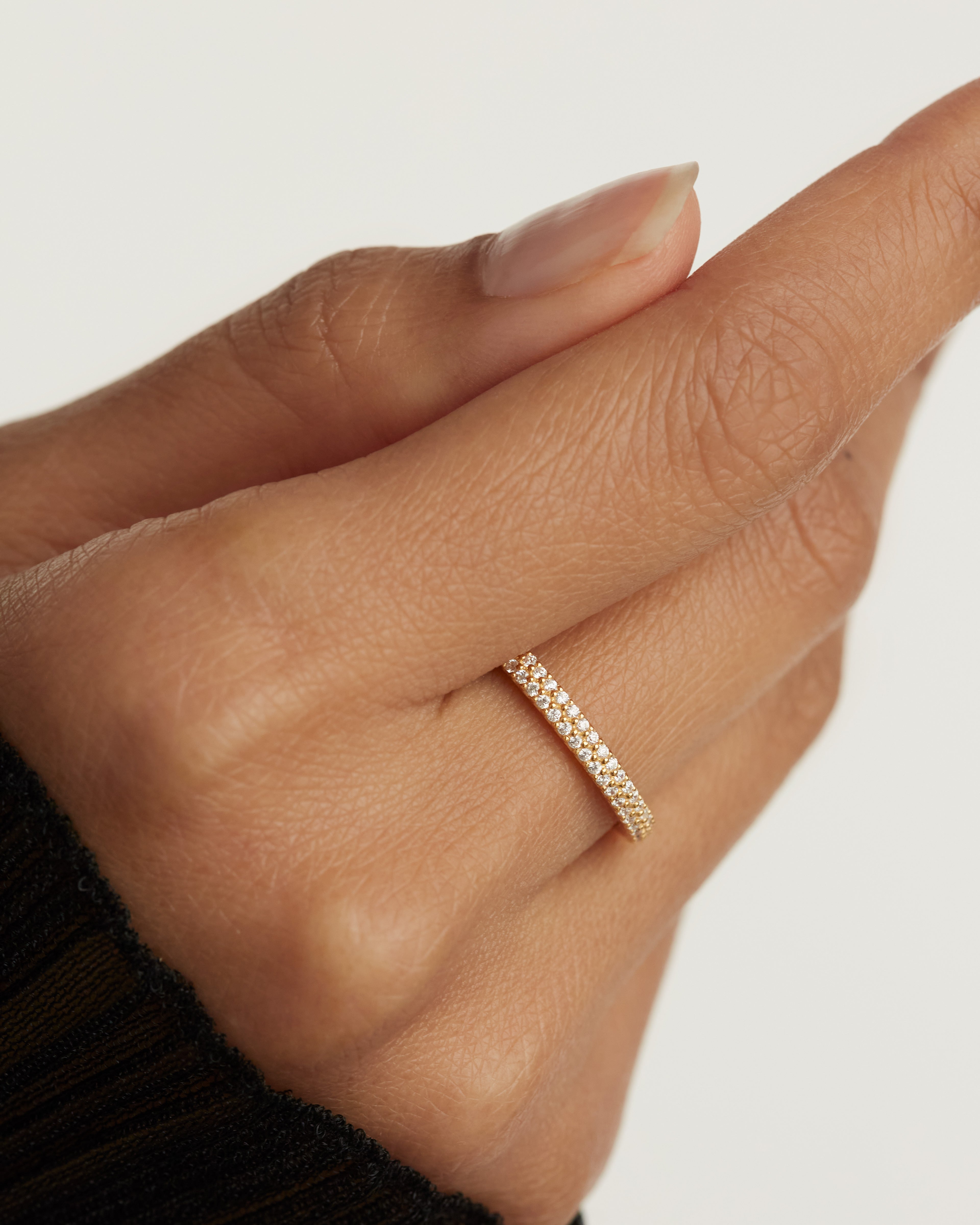 Anillo de plata bañada en oro con pavé de circonitas, de la marca PDPAOLA. Una pieza de joyería contemporánea pensada para la mujer de hoy.
