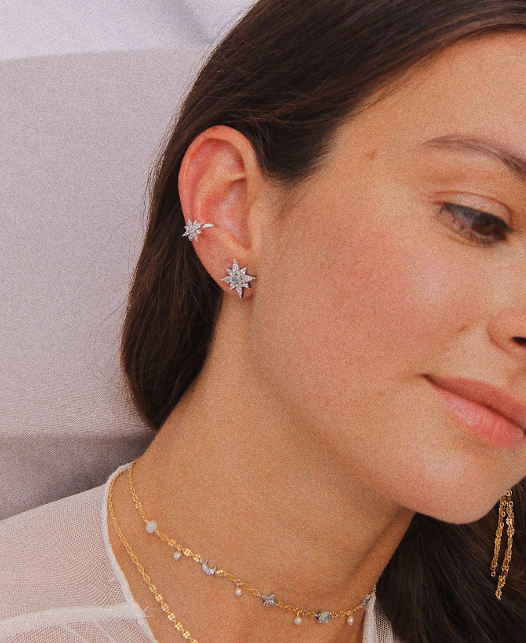 Deslumbre con la luz de las estrellas con estos pendientes de Joyas del Cerro. Cada pieza presenta una estrella de plata labrada con un pavé de circonitas blancas que custodian una calcedonia central de brillo sereno. Un diseño tipo dormilona, elegante y ligero, ideal para iluminar tu rostro tanto en eventos especiales como en tu día a día.