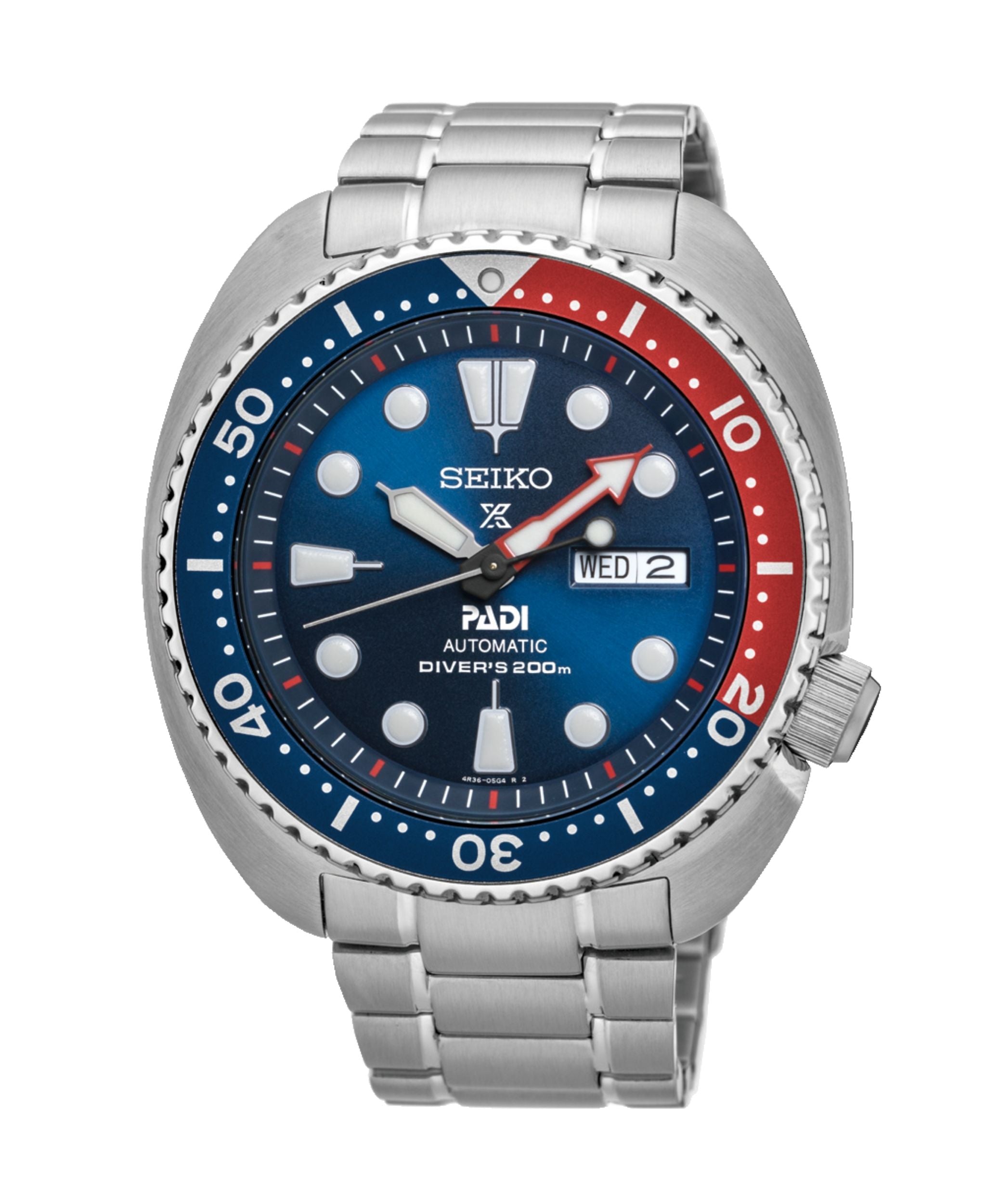 Conocido popularmente como el "PADI Turtle", es una edición especial nacida de la colaboración oficial con la Asociación Profesional de Instructores de Buceo. Esta pieza destaca por su esfera de color azul profundo con acabado de rayos de sol y su icónico bisel giratorio unidireccional en rojo y azul, configuración conocida como "Pepsi". Incluye funciones de día y fecha a las 3 en punto.