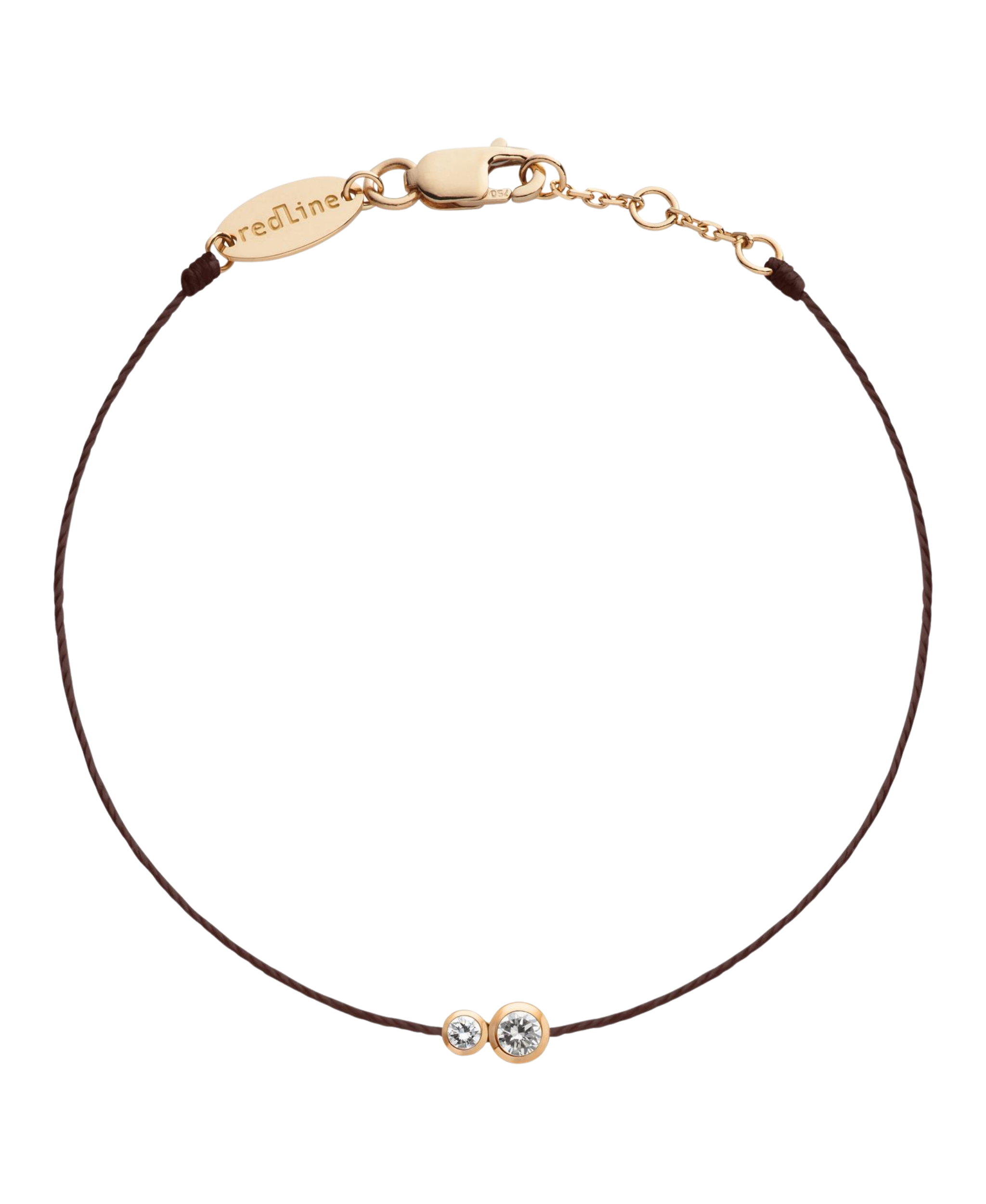 Esta pieza maestra articula la simbología del infinito mediante la unión de dos diamantes de talla brillante, engastados con precisión quirúrgica sobre una base de oro rosa de 18 quilates. La calidez del metal precioso se funde cromáticamente con el hilo técnico en color café, una elección de tono sobria y terrenal que aporta una sofisticación orgánica, alejándose de lo convencional para ofrecer una estética madura y versátil.