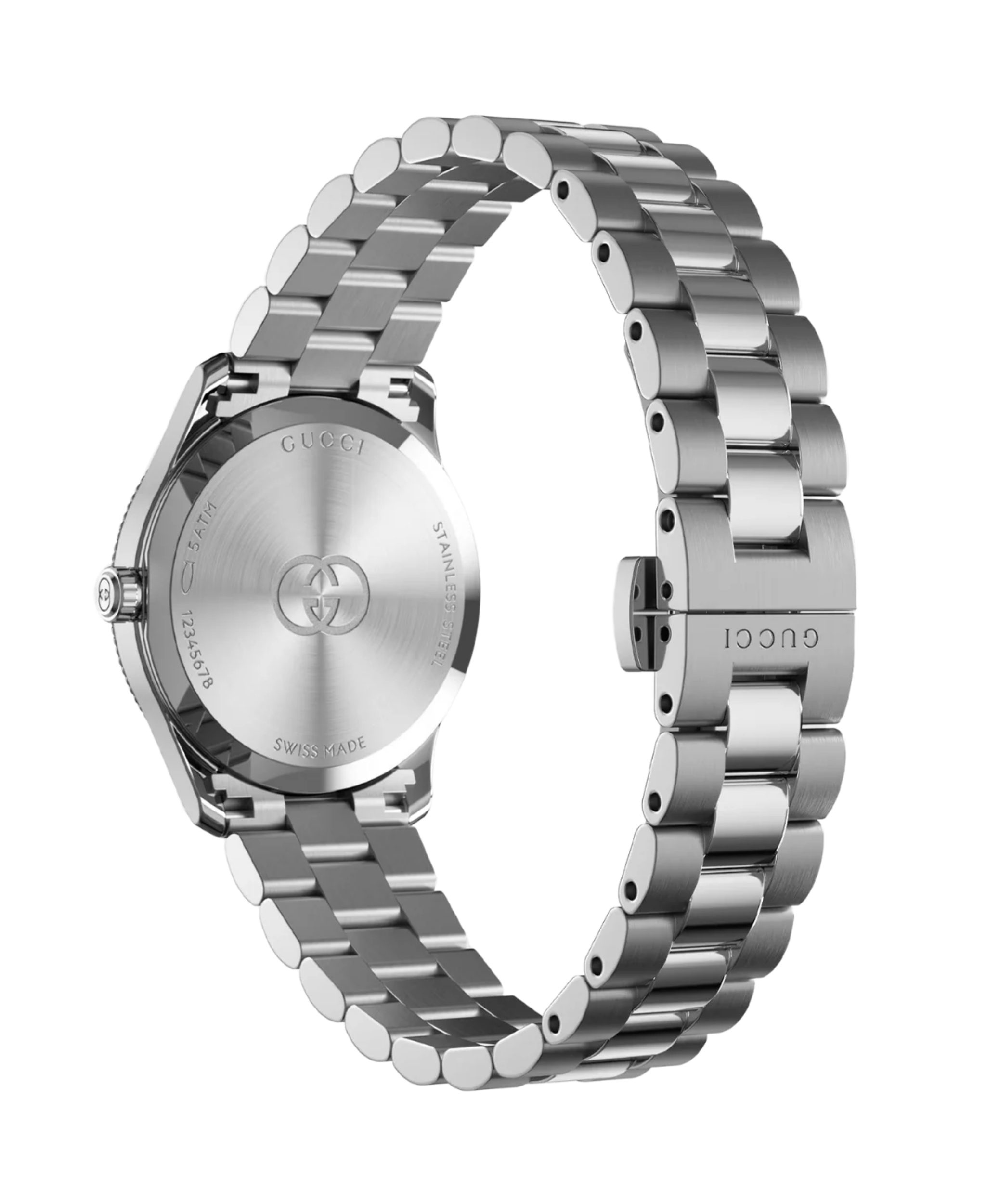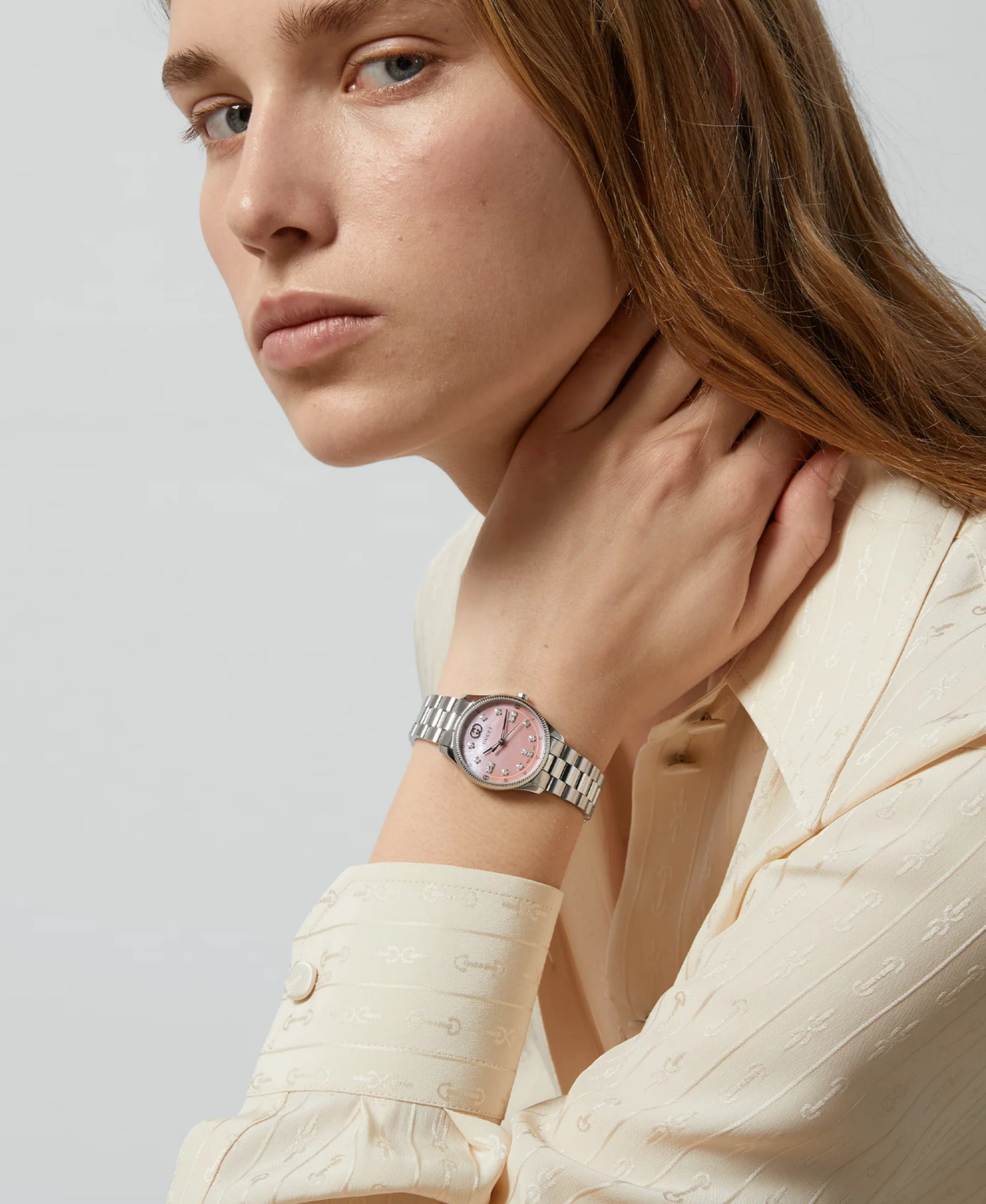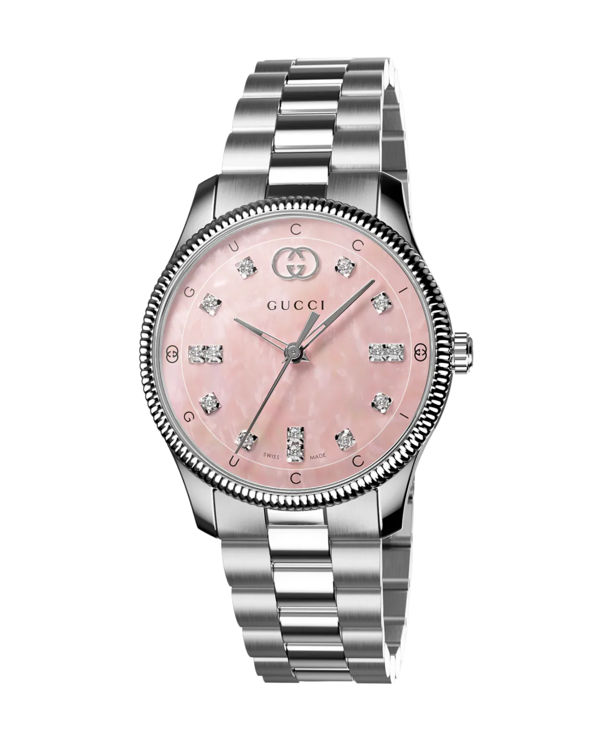 El look sofisticado de la temporada se extiende a los relojes y las joyas, incluida la colección G-Timeless. Este reloj redondo exhibe una elegante esfera donde se combinan sutiles expresiones de la GG entrelazada con la inscripción Gucci. Con una esfera de nácar rosa, el accesorio se completa con los motivos exclusivos de la Firma.