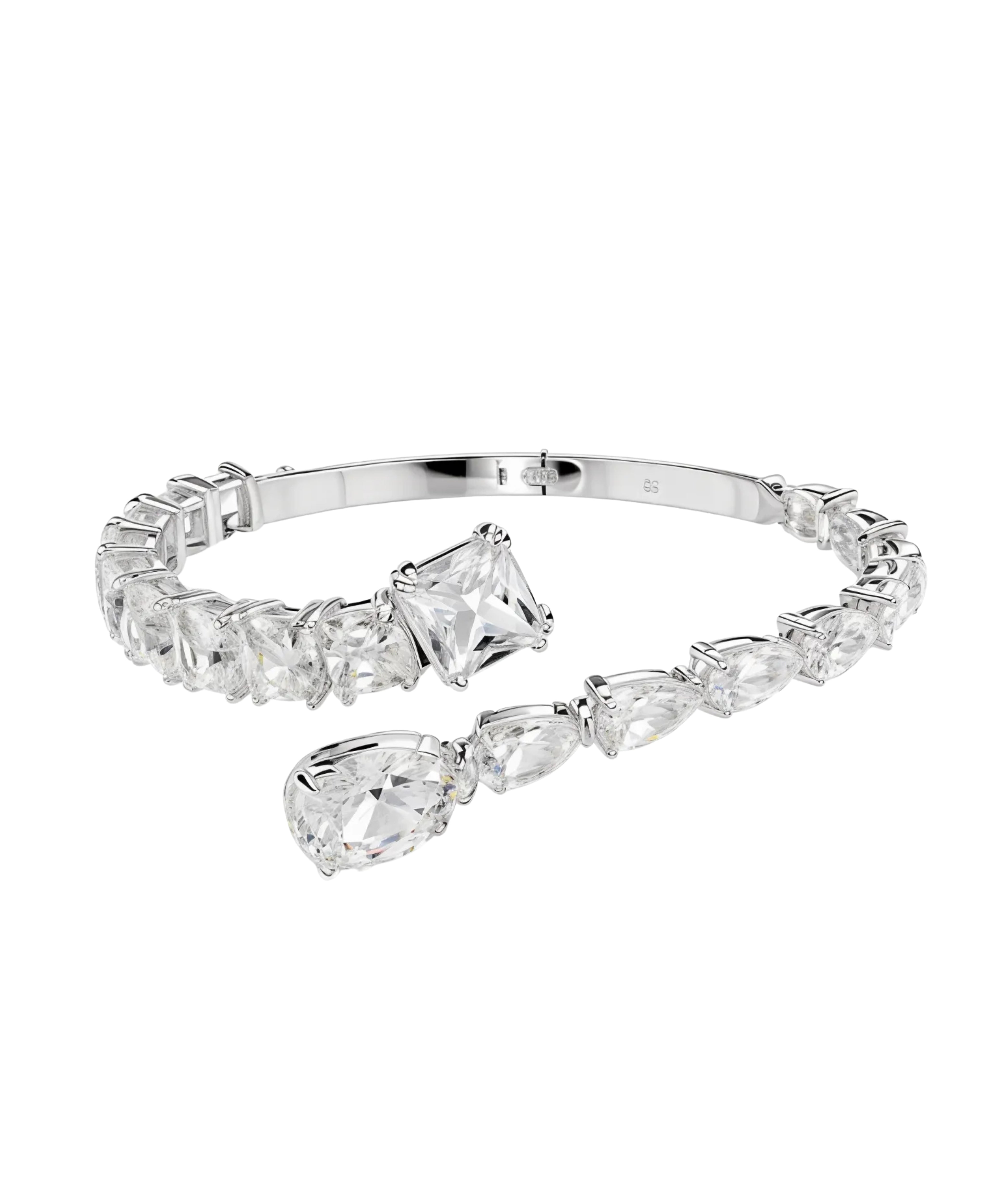Eleva la intensidad de tu estilo con este espectacular Brazalete Tallas Mixtas Matrix, una pieza creada para no pasar desapercibida. Su diseño con baño de rodio se realza con un deslumbrante conjunto de cristales transparentes en talla de pera y talla cuadrada, dispuestos en distintos tamaños para aportar profundidad, ritmo y un juego de luces sorprendente.