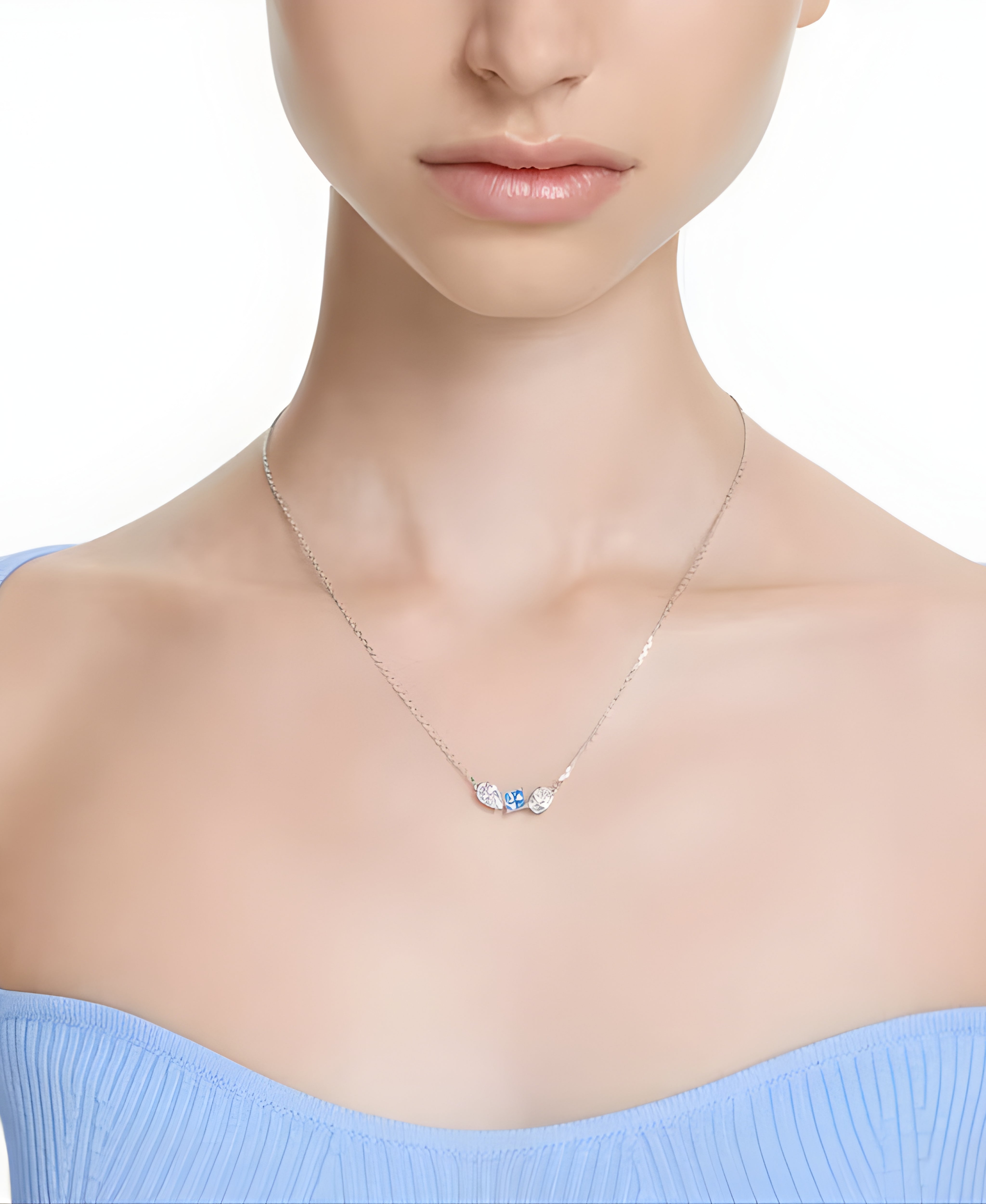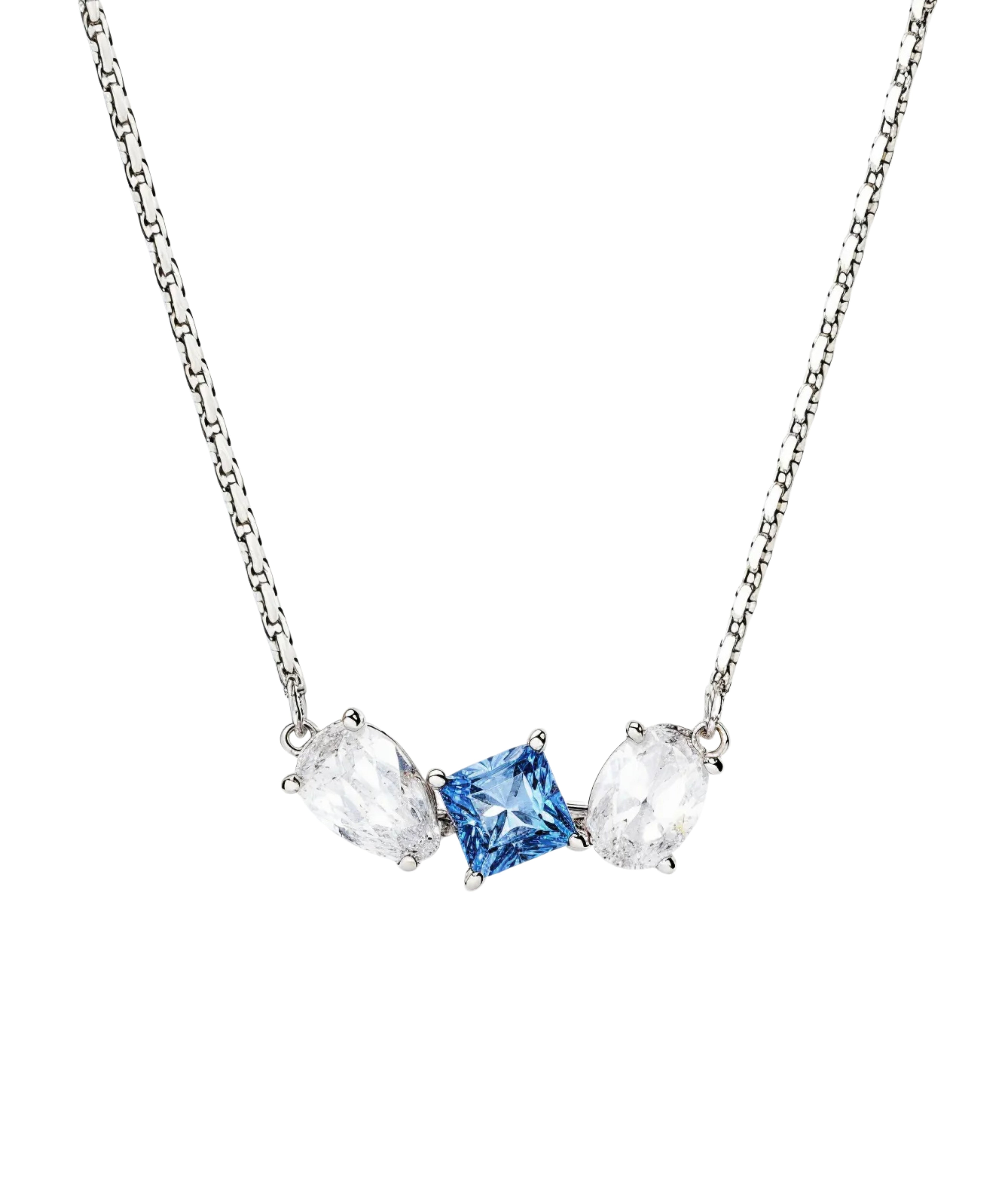 Este elegante Colgante Mesmera destaca por su exquisita estética y su atrevida combinación de tallas y colores, pensada para captar todas las miradas. Suspendido de una delicada cadena, el diseño con baño de rodio se adorna con un trío de Swarovski Zirconia engastados en garra y presentados en distintas formas, culminando en una deslumbrante piedra central de color azul que aporta profundidad y sofisticación.
