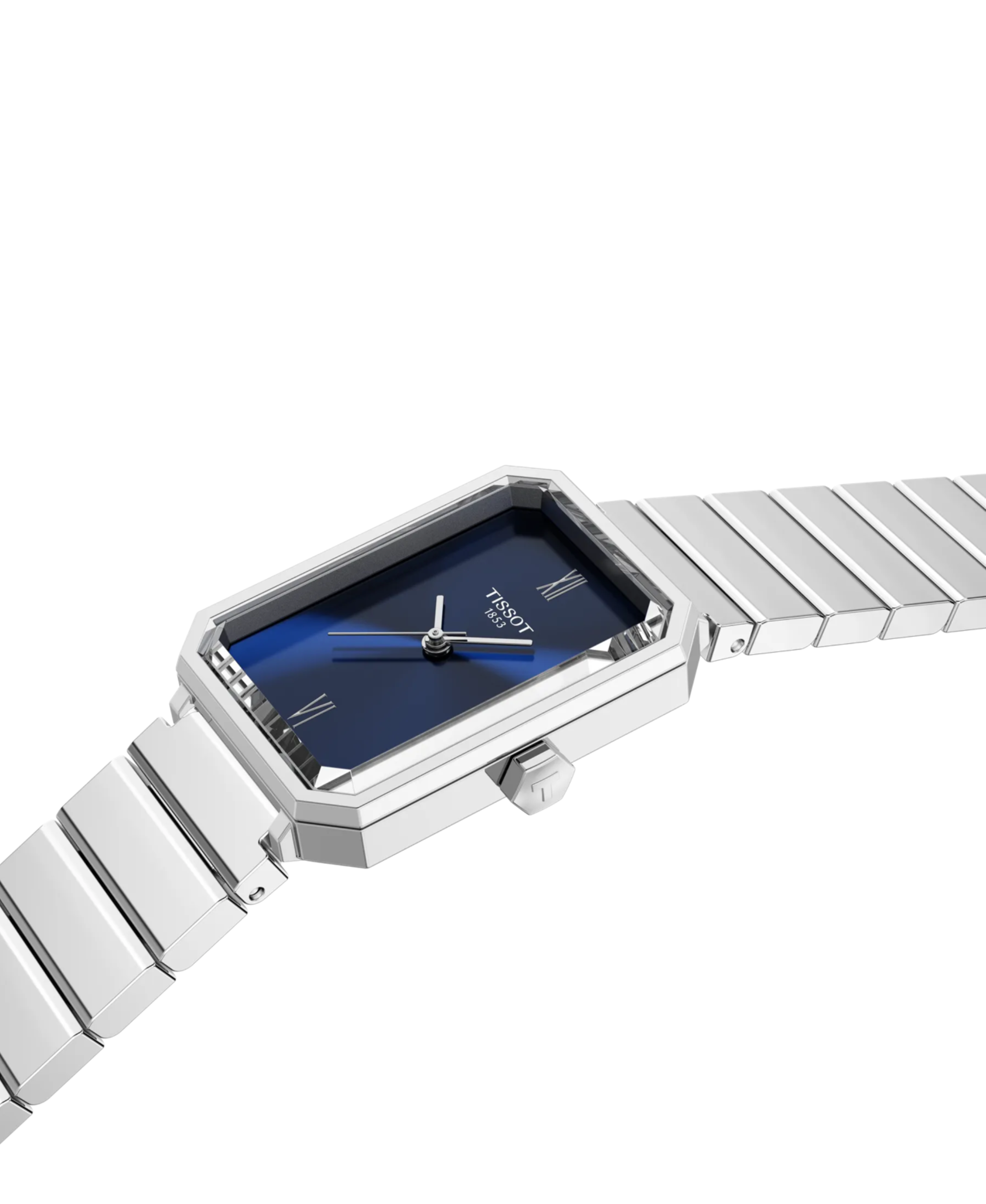 Su característica caja rectangular de acero inoxidable 316L alberga una esfera azul profundo con índices romanos, protegida por un cristal de zafiro facetado que le confiere una distinción única. Es la elección idónea para quien busca un accesorio con carácter retro que combine la fiabilidad del cuarzo con una estética refinada y versátil, gracias a su sistema de brazalete intercambiable.