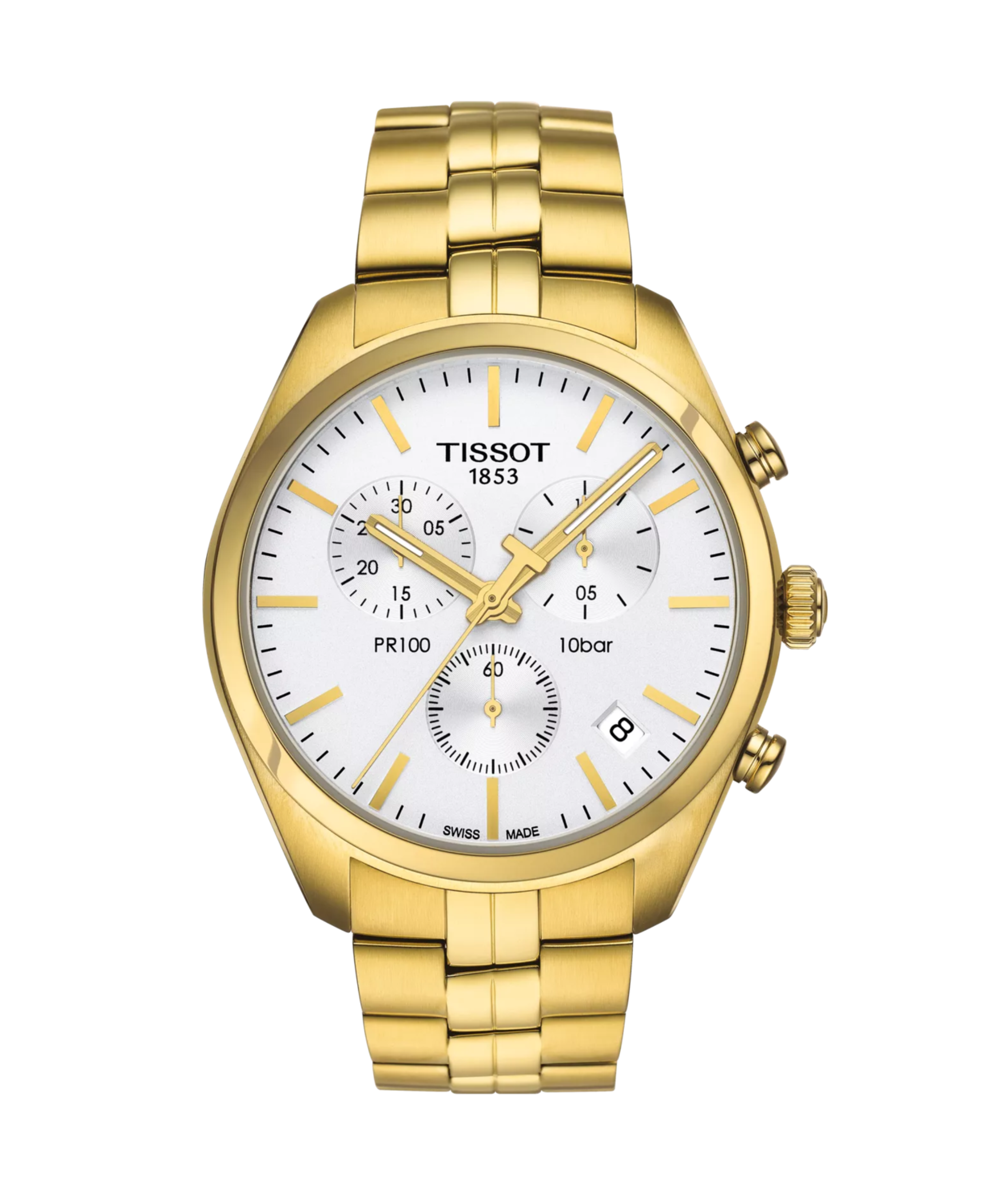 un cronógrafo de cuarzo suizo con un sofisticado acabado en PVD de oro amarillo. Presenta esfera plateada, cristal de zafiro irrayable y brazalete de acero inoxidable dorado. Resistente al agua hasta 100 metros (10 bares), combina durabilidad y lujo en un diseño atemporal. Precisión suiza para cualquier ocasión.