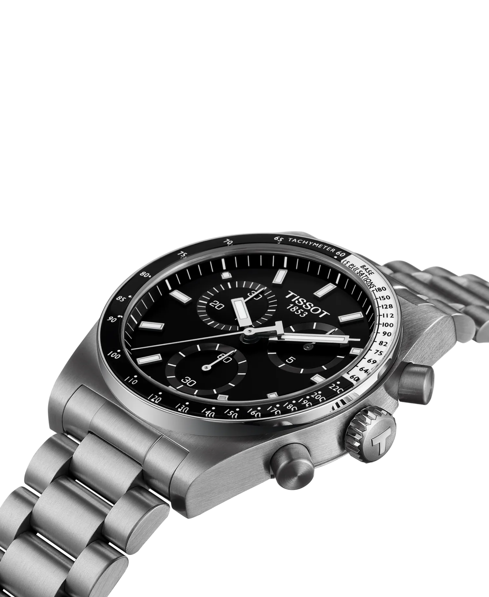 una reinterpretación moderna del clásico de 1970. Este cronógrafo de cuarzo suizo cuenta con caja de acero, esfera negra y un distintivo bisel con taquímetro y pulsómetro. Cristal de zafiro y brazalete de acero de liberación rápida. Un diseño retro-deportivo con la precisión del siglo XXI.