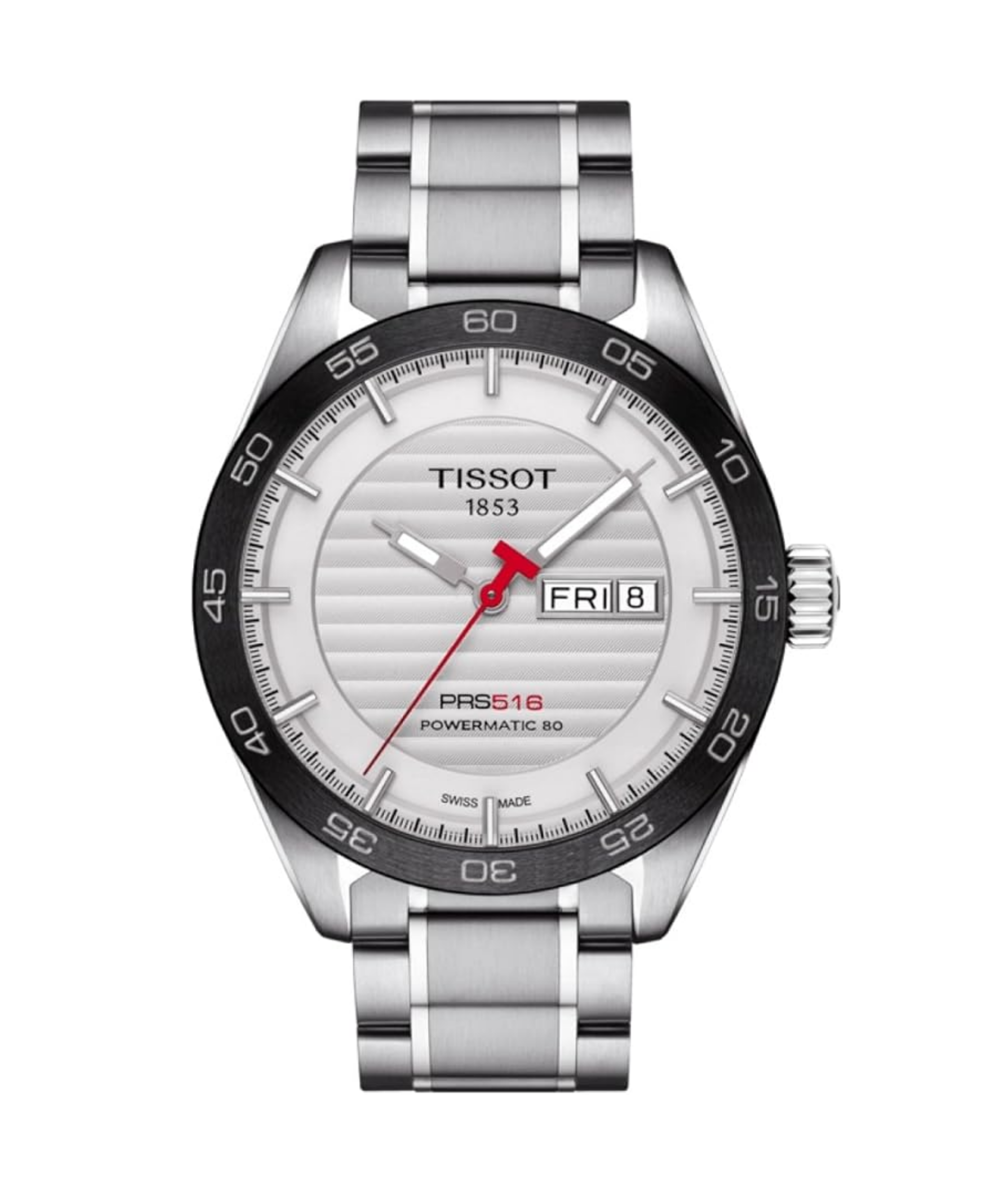 cuenta con el movimiento automático Powermatic 80, que ofrece hasta 80 horas de reserva de marcha. Diseño en acero inoxidable con esfera plateada, bisel cerámico negro y cristal de zafiro. Incluye doble calendario y fondo transparente. Un reloj suizo icónico, robusto y preciso inspirado en las carreras.