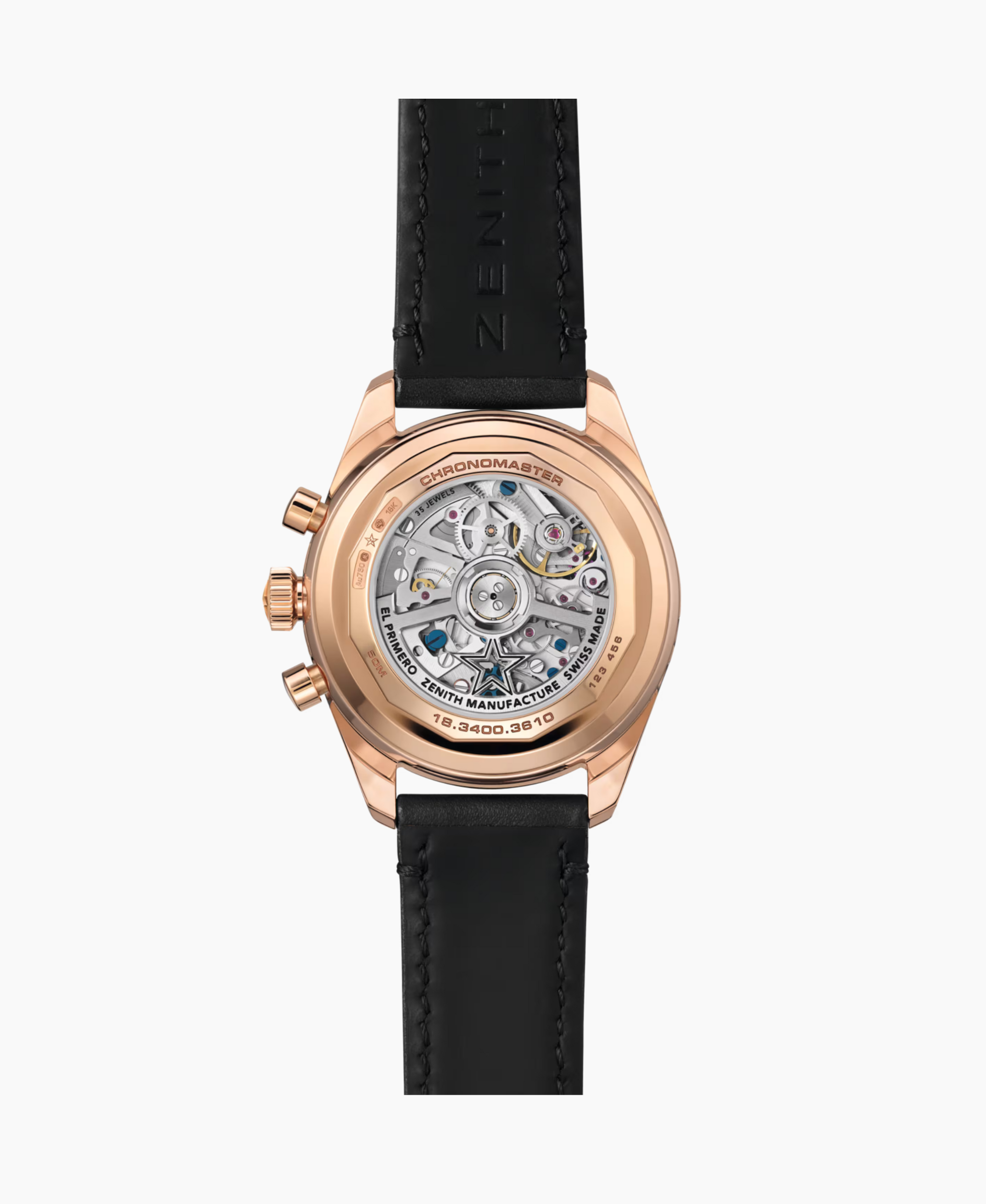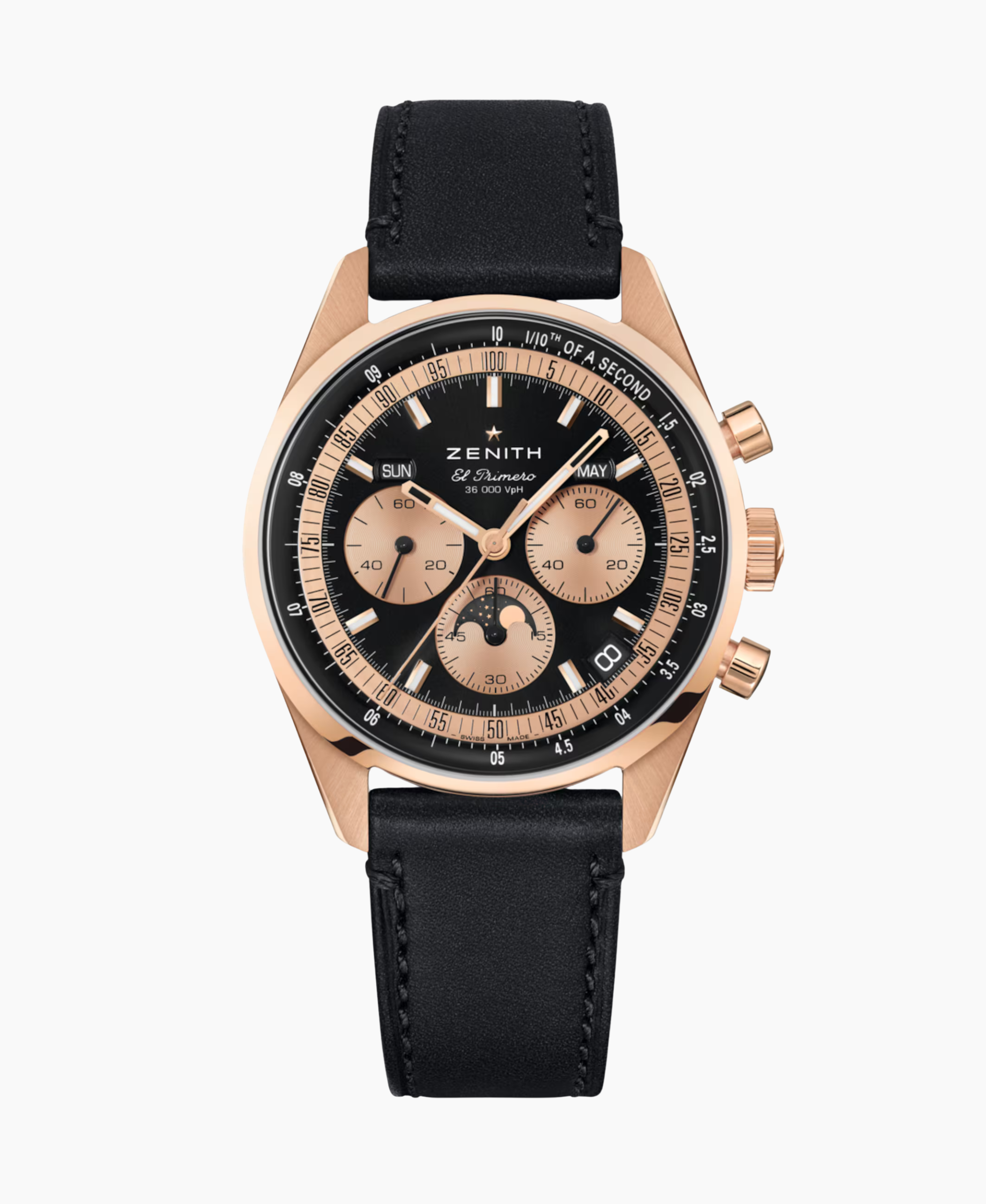 Zenith Chronomaster Original combina lujo y complejidad. Su caja de oro rosa de 38 mm alberga una esfera negra con contadores dorados. Equipado con el El Primero 3610, ofrece cronógrafo de 1/10 de segundo e indicaciones de Triple Calendario y Fase Lunar. Máxima sofisticación.