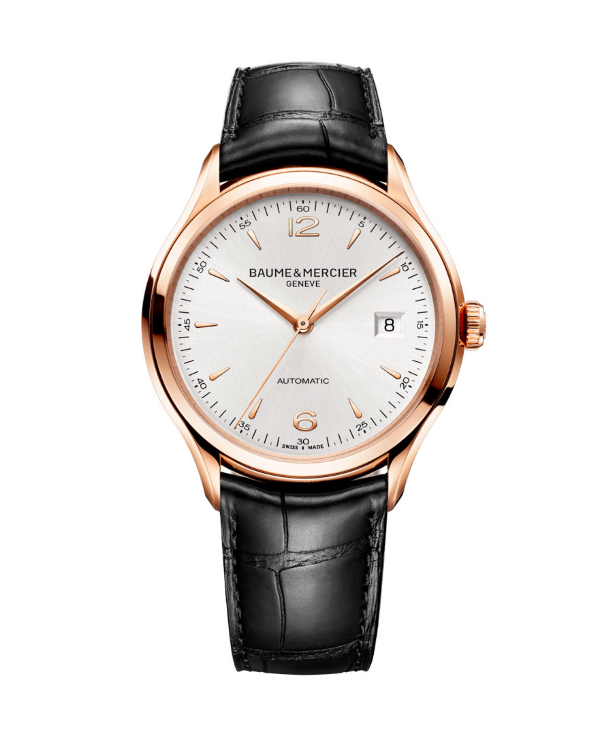 Baume & Mercier Clifton automático "Swiss-made", con un diseño clásico inspirado en los años 50. Su caja de 39 mm de diámetro está elaborada en lujoso Oro Rojo de 18 quilates (acabado pulido-satinado) y cuenta con un fondo abierto de zafiro que permite ver la maquinaria. La refinada esfera plateada con acabado soleil (rayos de sol), utiliza índices mixtos y se presenta con una correa de piel de aligátor.